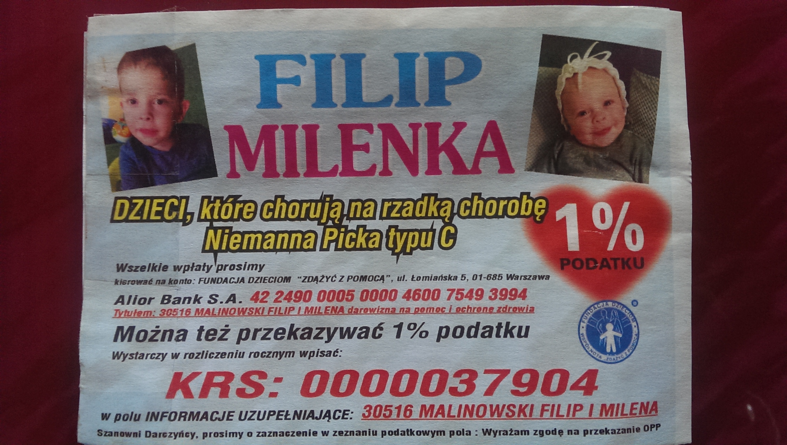 Czy pamiętacie Milenkę i Filipa? To dzieci, które chorują na rzadką chorobę Niemanna Picka typu C. Ich miesięczne leczenie kosztuje rodziców ponad 40 tysięcy złotych, gdyż leki nie są refundowane. Zbieraliśmy już pieniądze przed Bożym Narodzeniem, a teraz znowu prosimy wszystkich ludzi dobrej woli o pomoc. Przekażcie 1% podatku dla Milenki i Filipa. Wystarczy w rozliczeniu rocznym wpisać: