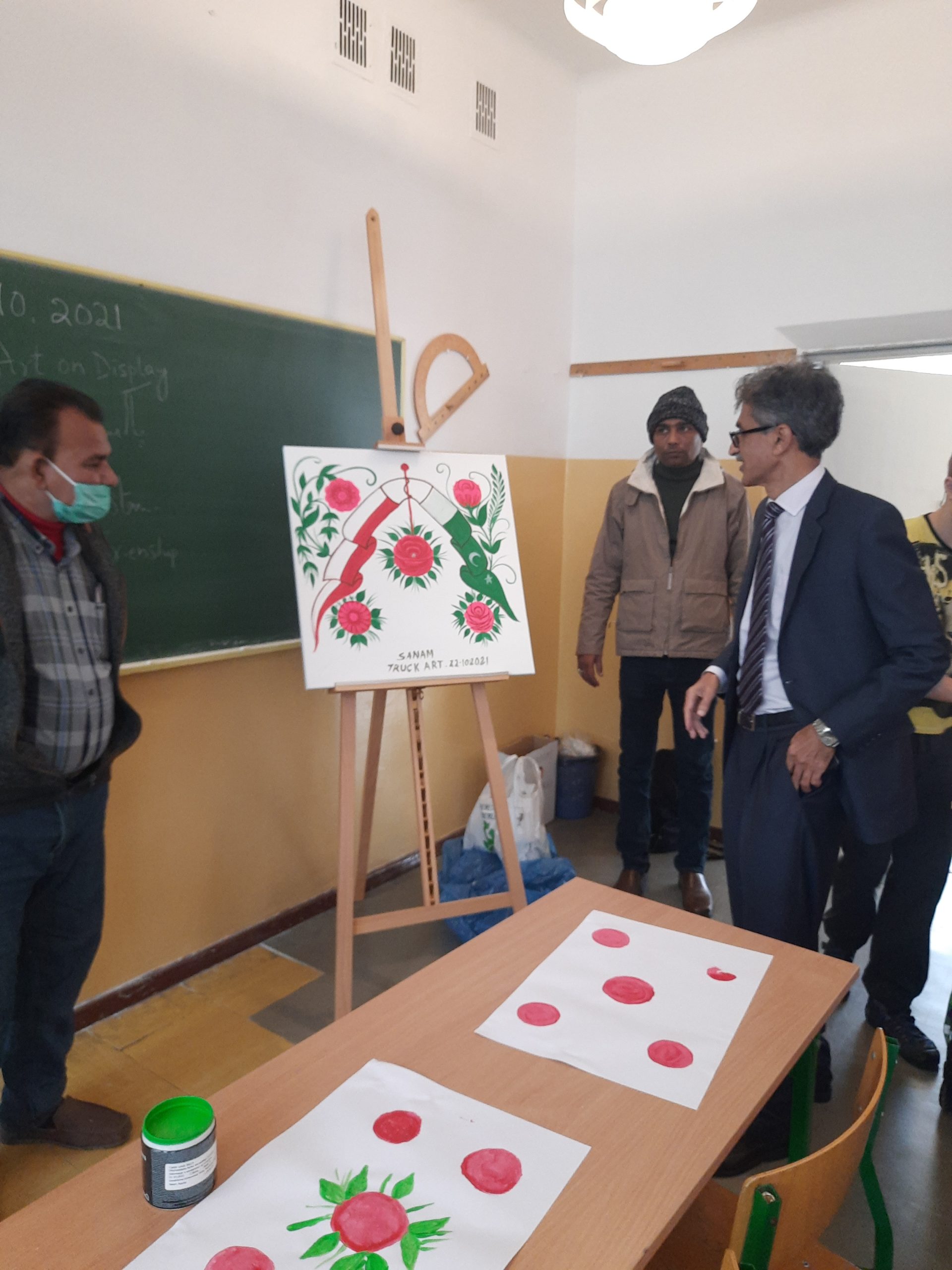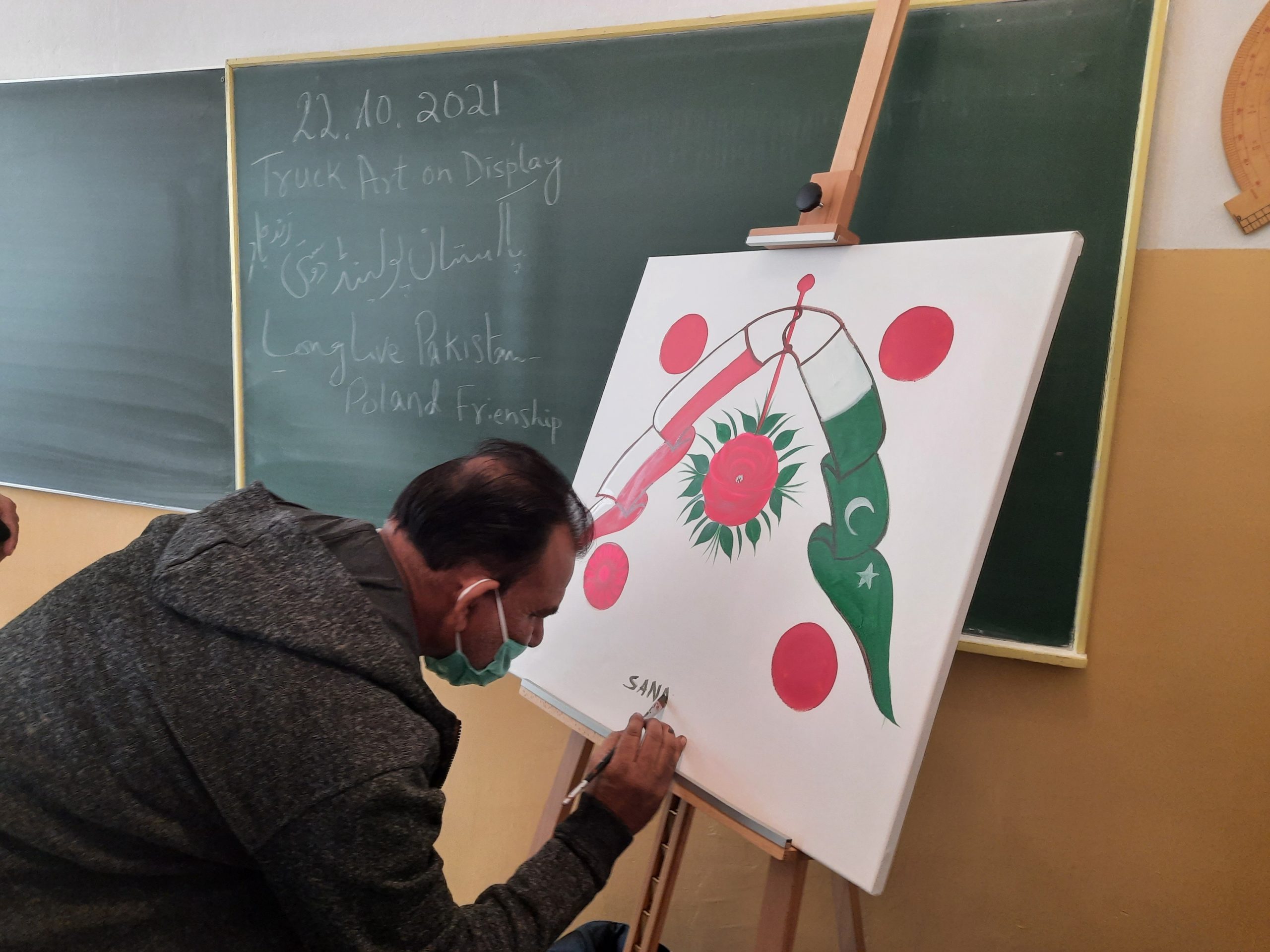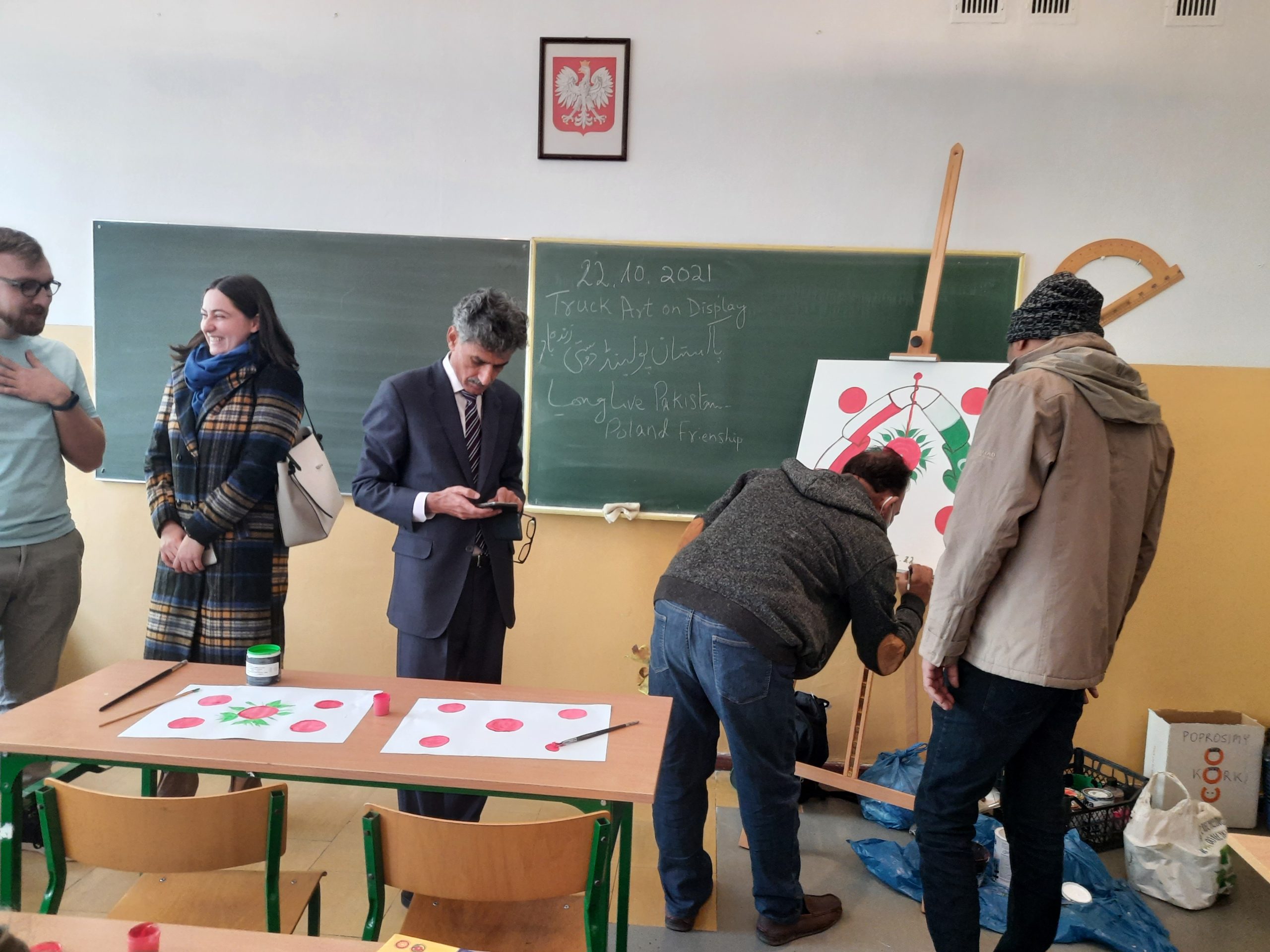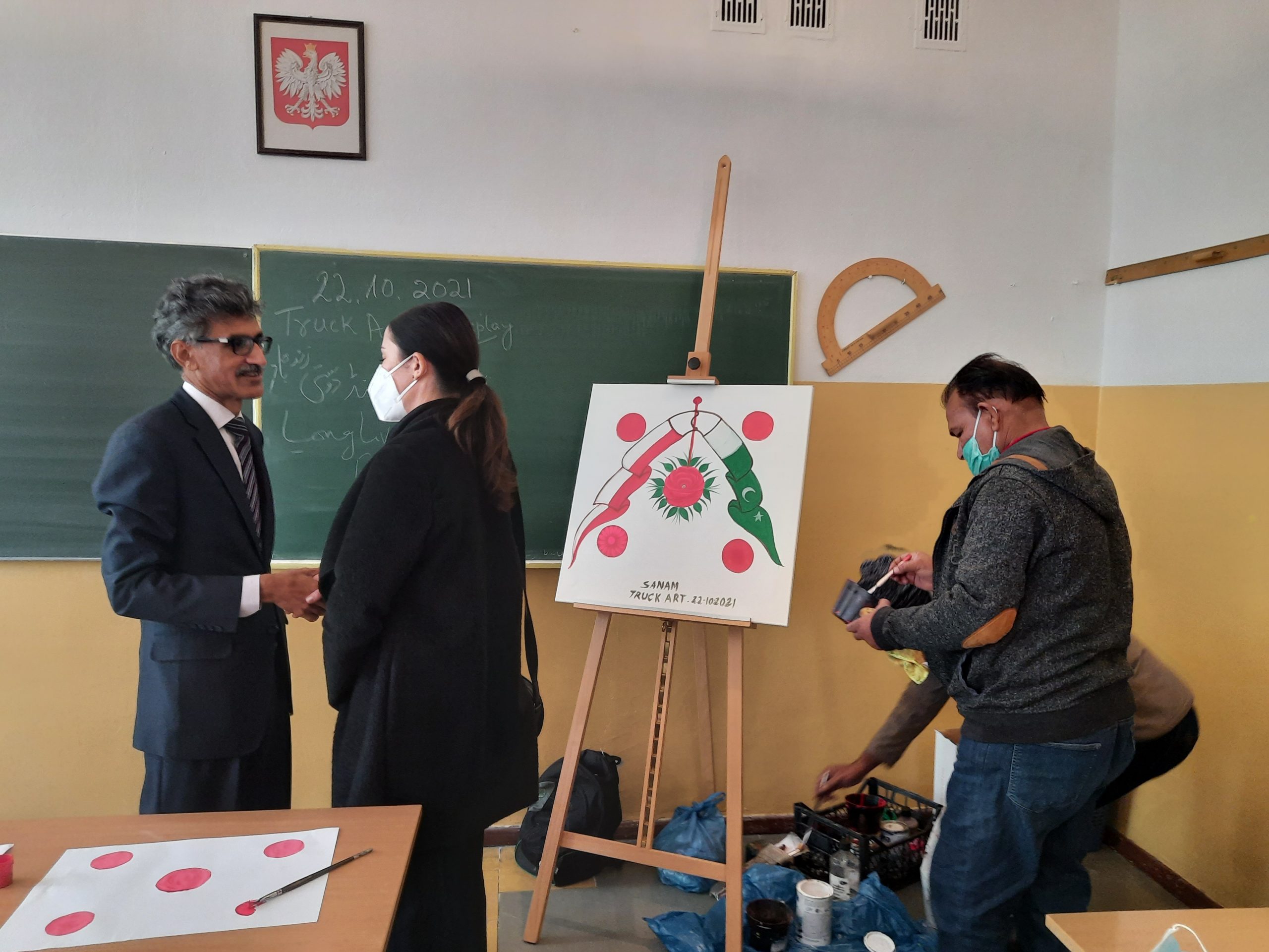 Przez kilka ostatnich październikowych dni przyjmowaliśmy w naszej szkole gości z Pakistanu: ambasadora Pakistanu w Polsce i artystów sztuki określanej jako Art Track. Nasi uczniowie podczas warsztatów mieli okazję poznać tę sztukę. Dzięki tym spotkaniom przybliżona została im także kultura Pakistanu. Pod okiem artystów uczniowie tworzyli własne prace plastyczne, a przy okazji doskonalili umiejętność posługiwania się językiem angielskim. Nasi goście pozostawili nam wspaniałą pamiątkę. Na ścianie budynku A powstał nowy mural, wykonany przez pakistańskich artystów. Dziękujemy.