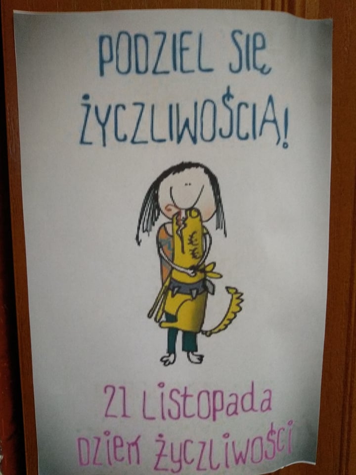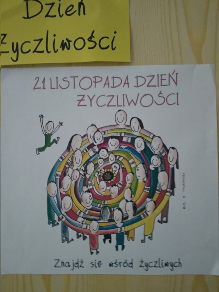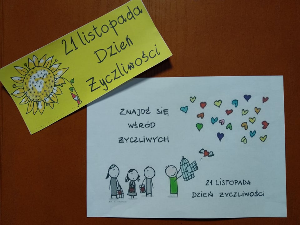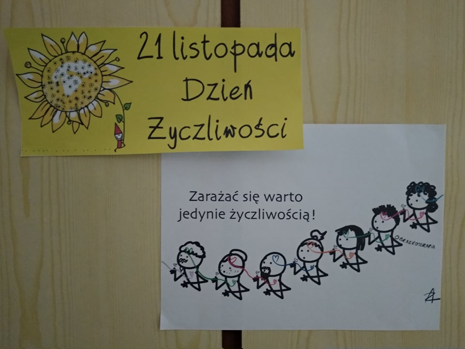 21 listopada to Dzień Życzliwości. Nasza szkoła również włączyła się w obchody tego święta. Na drzwiach sal lekcyjnych pojawiły się kartki ze słowami skierowanymi do naszych kolegów, koleżanek i nauczycieli przypominające nam o tym dniu, zachęcające do okazywania życzliwości.