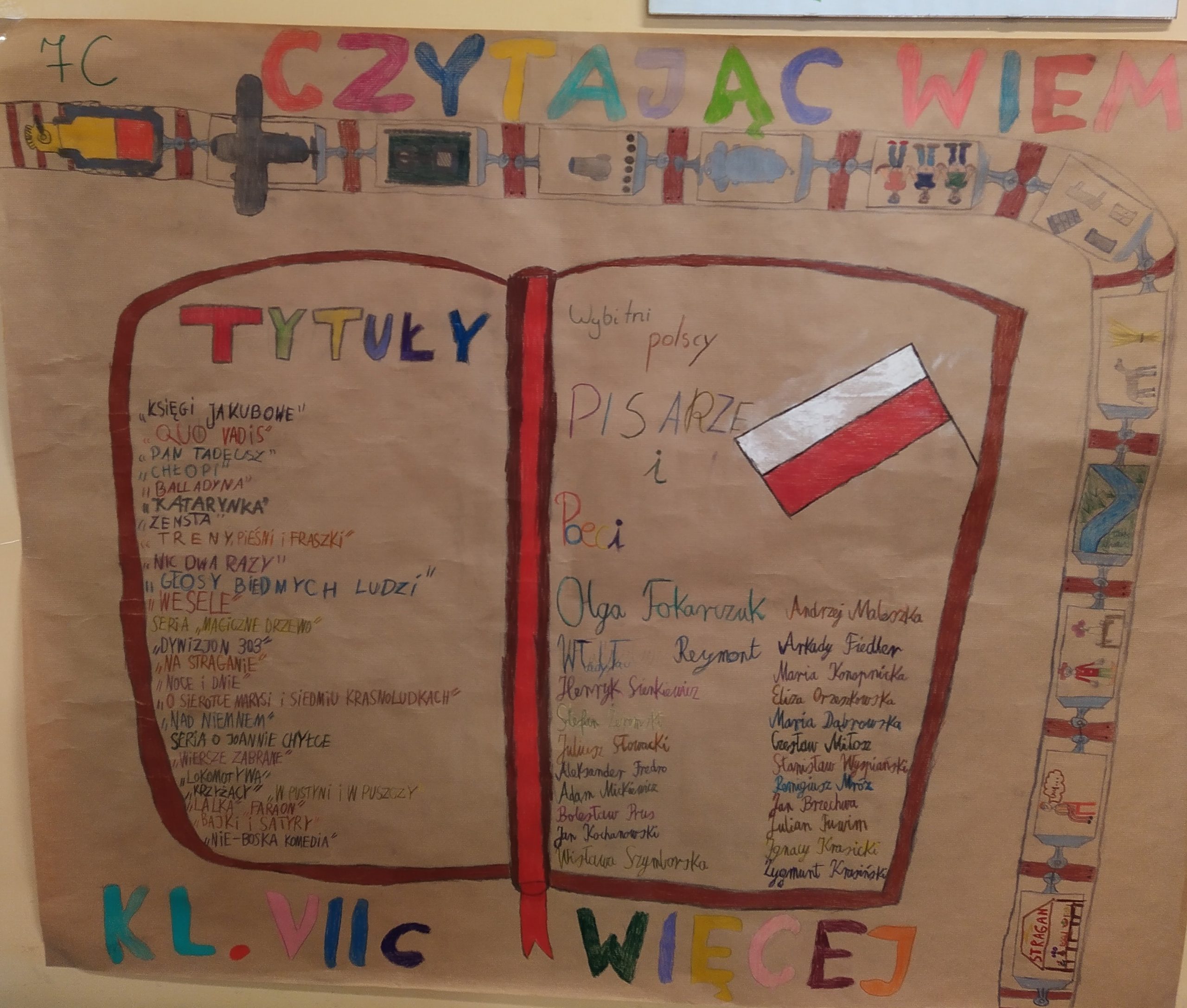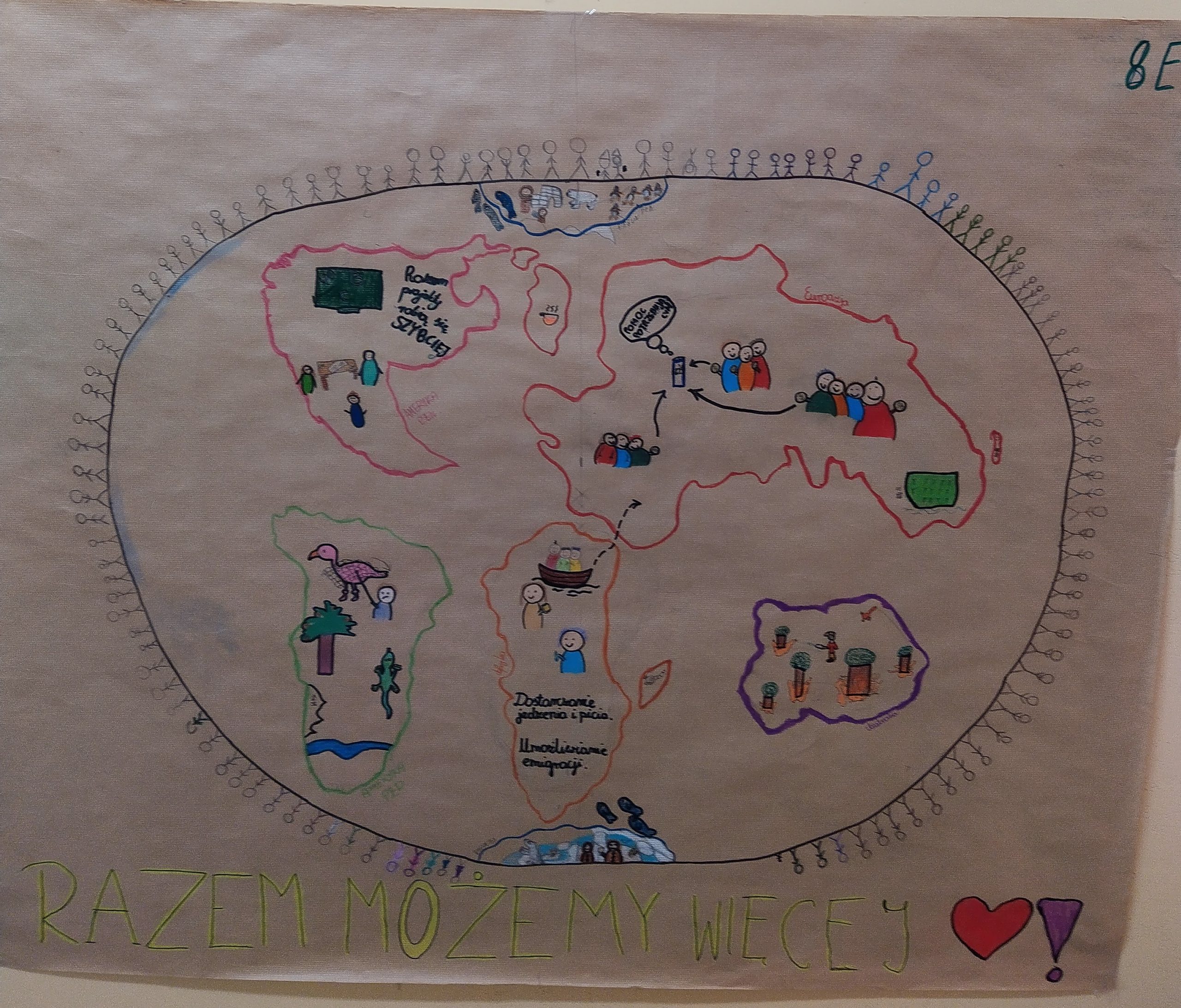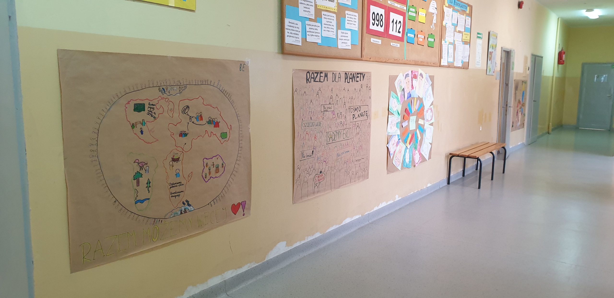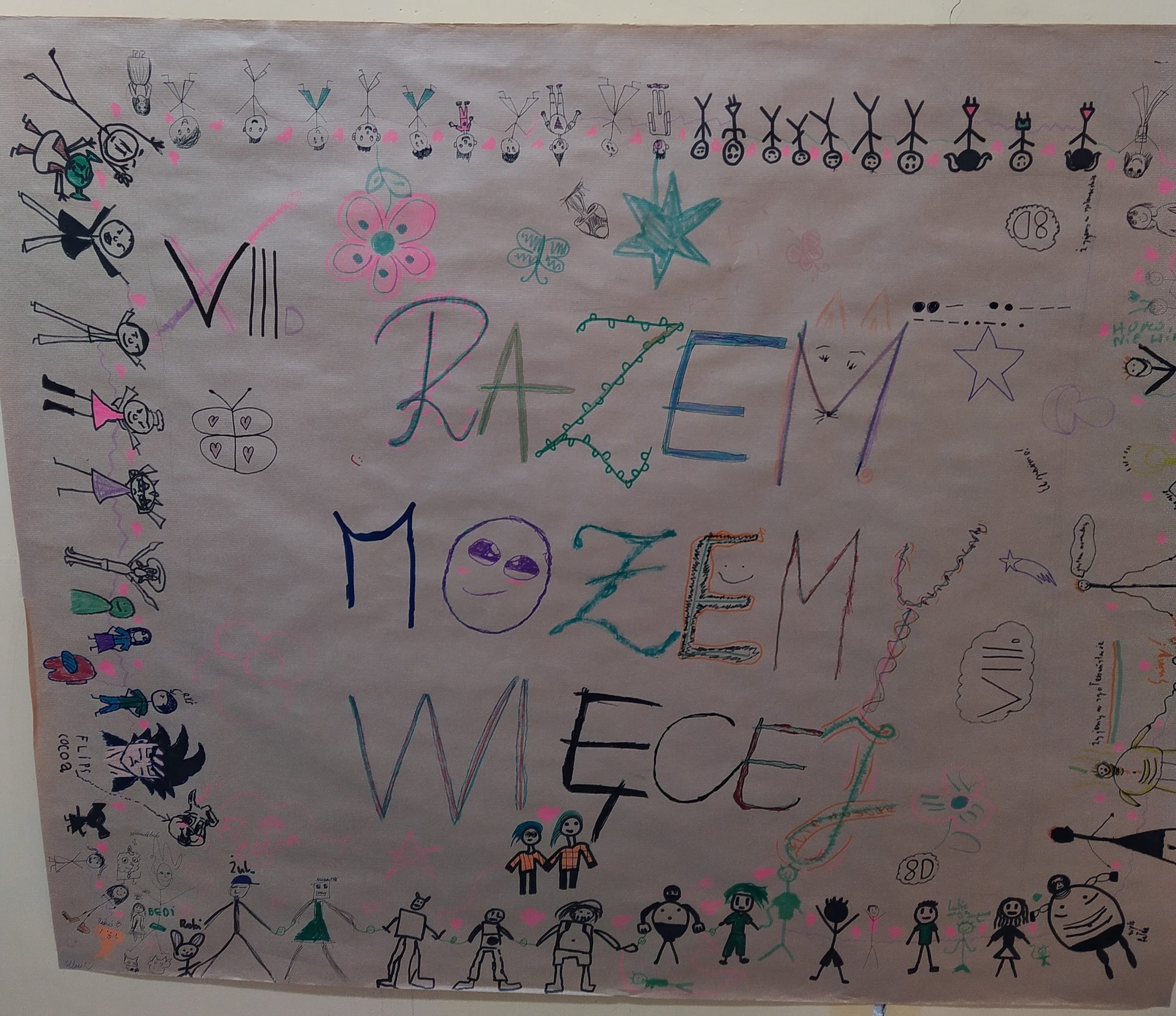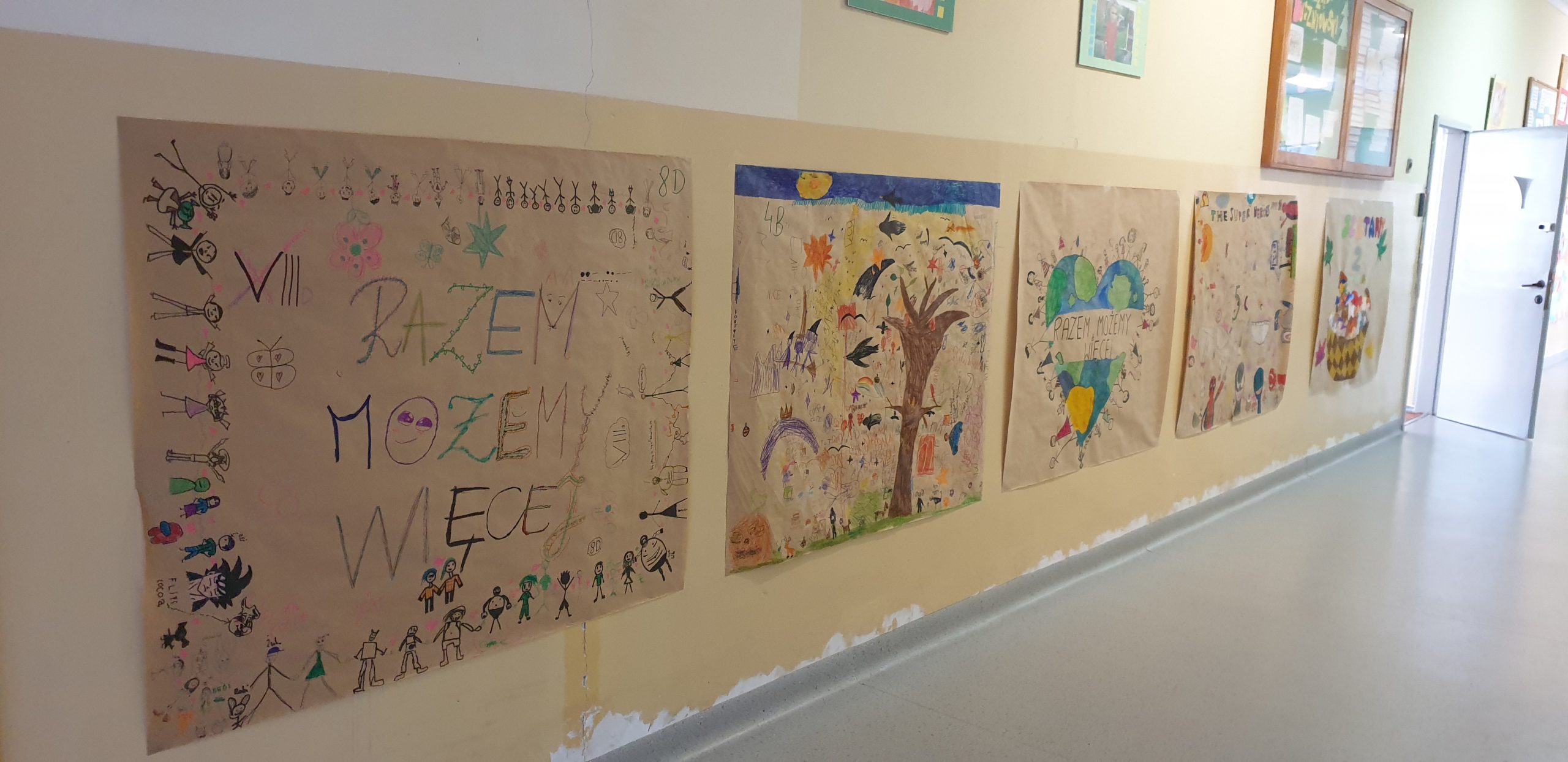 W ramach innowacji ,,Razem możemy więcej” prowadzonej przez pedagoga i psychologa, przy współpracy wychowawców klas 4-8, powstały wspólne prace uczniów. W ramach akcji październikowej uczniowie w swoich zespołach klasowych tworzyli prace plastyczne integrując się przy tym i budując pozytywne relacje. Rysunki zawisły na korytarzach szkolnych w obu budynkach. Są imponujące – kolorowe, twórcze, wyjątkowe, ale przede wszystkim powstały we współpracy!