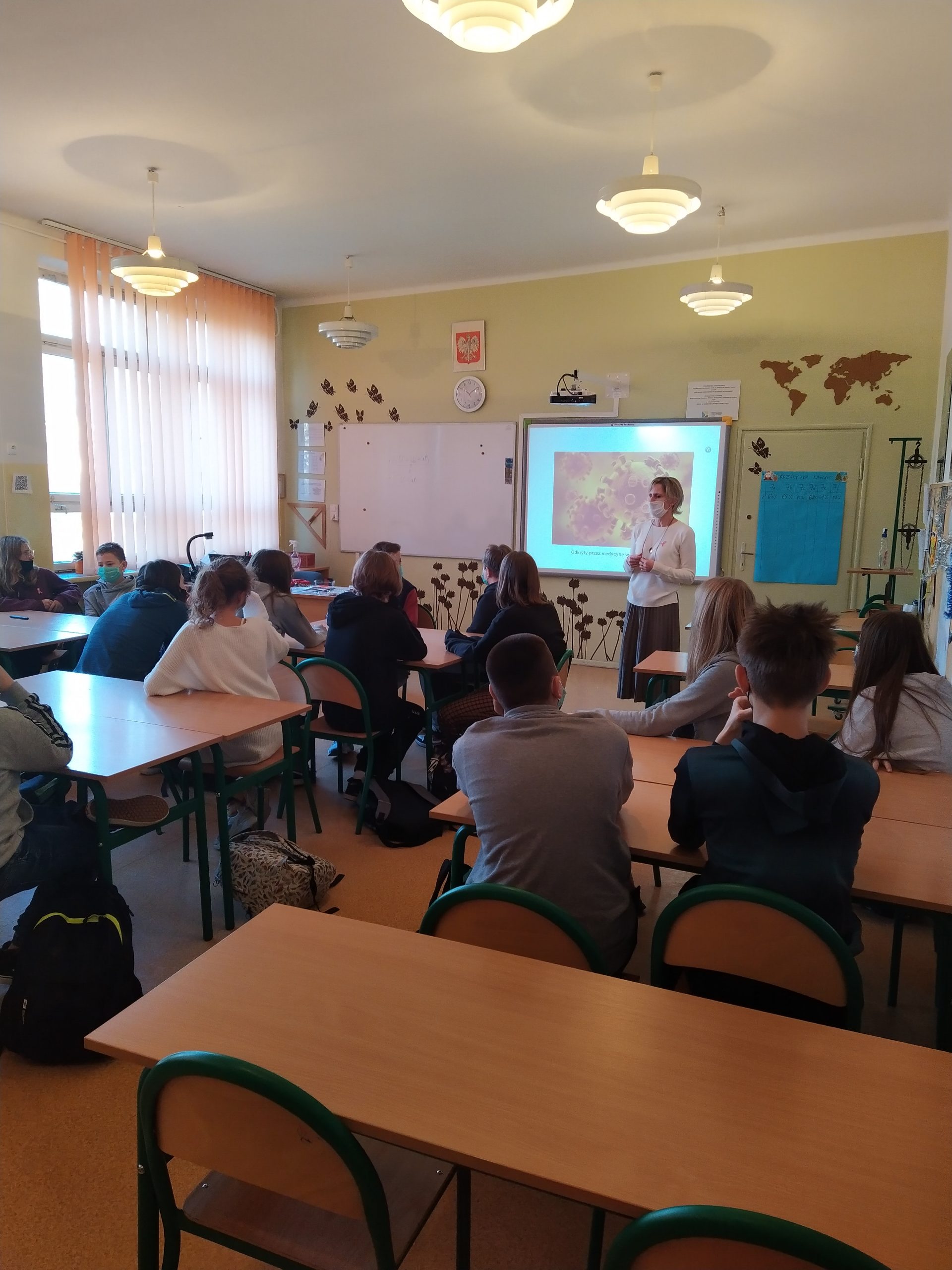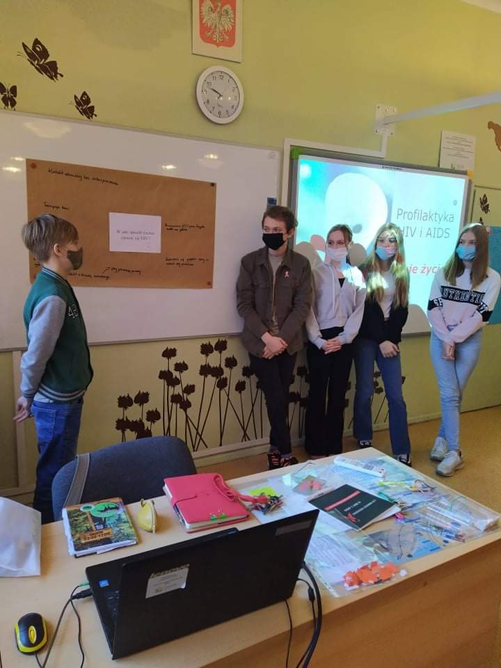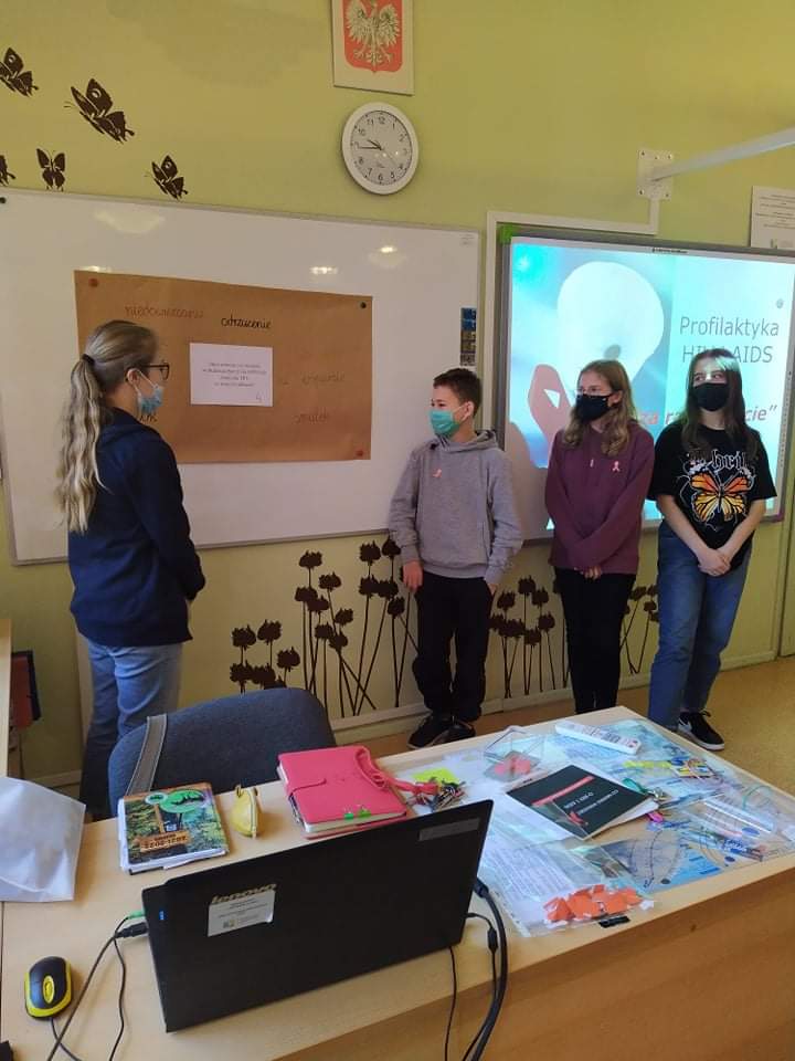 W dniu 2 grudnia w naszej szkole obchodziliśmy ,,Dzień czerwonej wstążeczki” solidaryzując się z osobami zarażonymi wirusem HIV, chorymi na AIDS. Przedstawiciele klas 7 i 8 uczestniczyli w dwugodzinnych warsztatach, prowadzonych przez p. dyr Katarzynę Rękawiecką i pedagoga p. Joannę Dolder. Podczas spotkania uczestnicy mieli okazję poznać drogi zakażenia, dyskutować o tolerancji wobec osób zarażonych, dowiedzieli się też, jak ustrzec się przed tą chorobą.