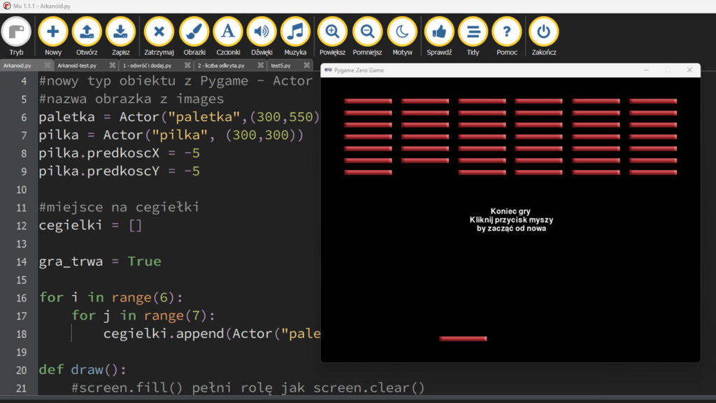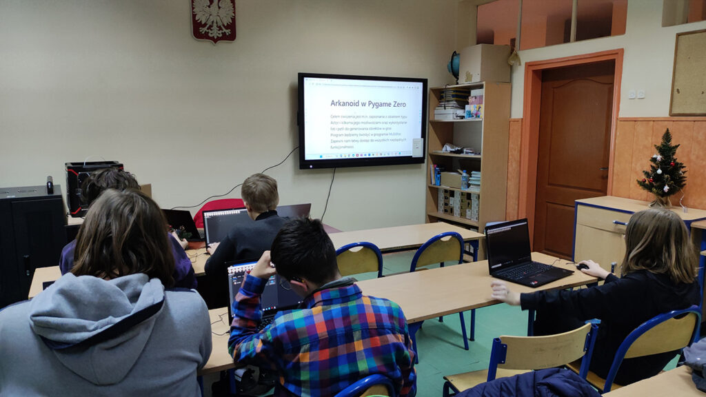 Na zajęciach TIK uczniowie rozwijają umiejętność programowania, myślenia algorytmicznego oraz komunikacji i współpracy. Młodsza grupa pracuje w środowisku graficznym Scratch, w którym zbudowała m.in. kilka ciekawych gier oraz niełatwy program do sprawdzania czy rok jest przestępny. Starsze grupy poznały podstawy języka programowania Python. Oprócz klasycznej składni korzystali też z Pygame Zero. W tym środowisku uczniowie zbudowali m.in. program graficzny służący do rysowania oraz klasyczną grę Arkanoid.
