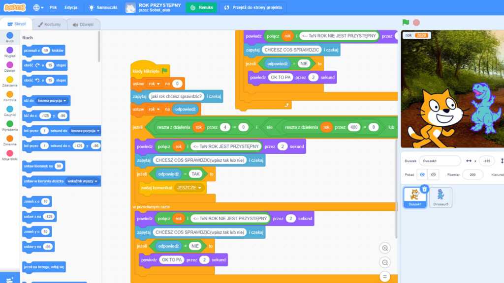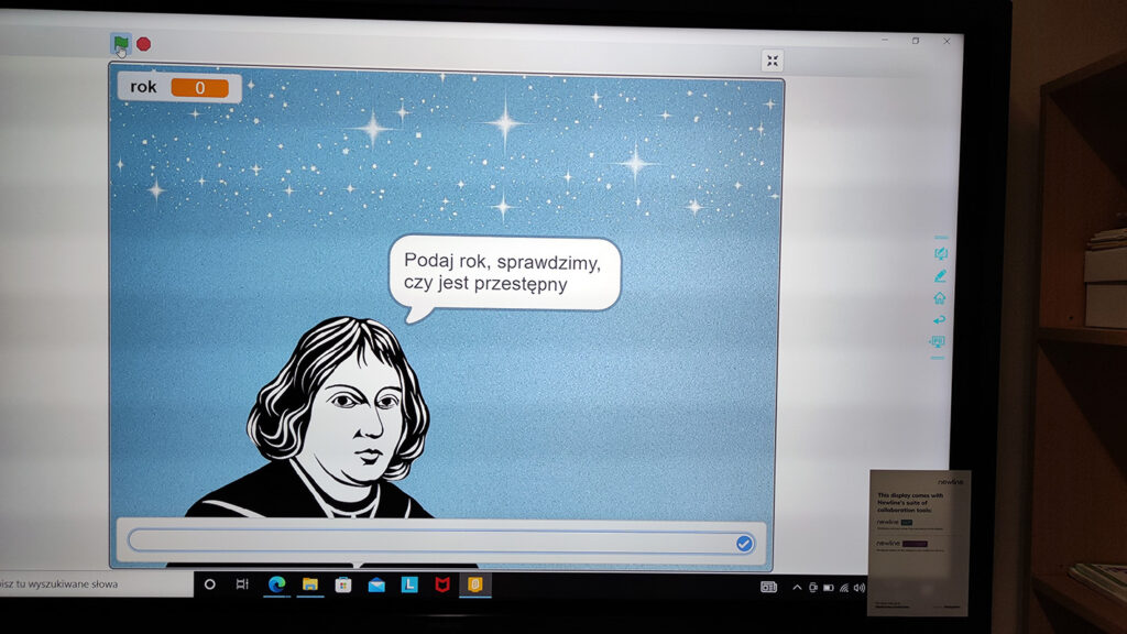 Na zdjęciu widzimy skrypty utworzone w programie Scratch.Na zdjęciu widzimy działający program w Scratch. Program prosi o podanie daty by sprawdzić czy będzie to rok przestępny.Na zdjęciu widzimy program zapisany w języku programowania Python.Na zdjęciu widzimy utworzony program przez uczniów w języku programowania.Na zajęciach widzimy uczniów słuchających lekcji, oglądających na ekranie interaktywnym treści. Uczniowie siedzą przed komputerami i jednocześnie pracują.Na zajęciach widzimy uczniów słuchających lekcji, oglądających na ekranie interaktywnym treści. Uczniowie siedzą przed komputerami i jednocześnie pracują.Na zajęciach widzimy uczniów słuchających lekcji, oglądających na ekranie interaktywnym treści. Uczniowie siedzą przed komputerami i jednocześnie pracują. Jedna osoba pokazuje znak „ok”.