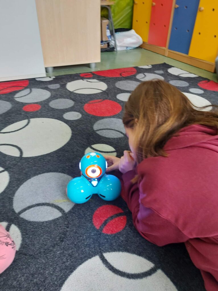 Na zdjęciu widzimy dzieci uczące się na tabletach.Na zdjęciu widać uczennicę pracująca z robotem.Na zdjęciu widać uczennicę pracująca z tablica interaktywną.Na zdjęciu widzimy dzieci pracujące z matą do kodowania.Na zdjęciu widzimy jak dzieci pracują z długopisami 3D.Na zdjęciu widzimy jak dzieci pracują z długopisami 3D.
