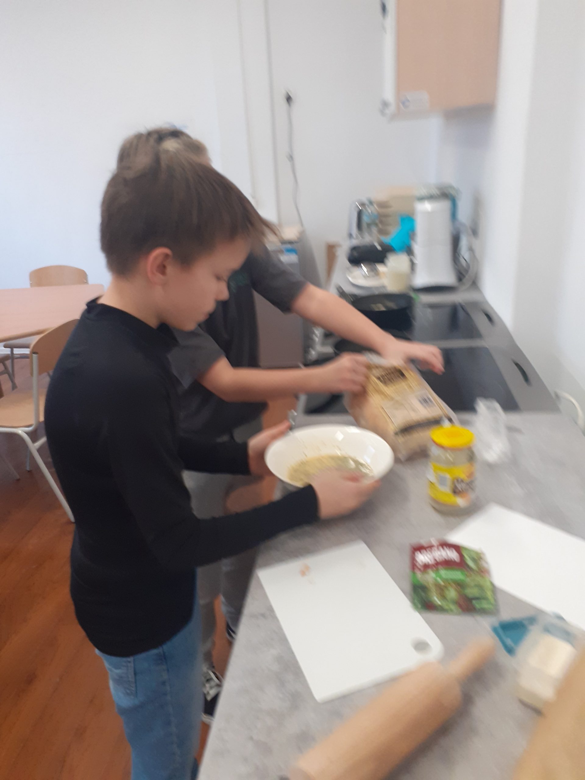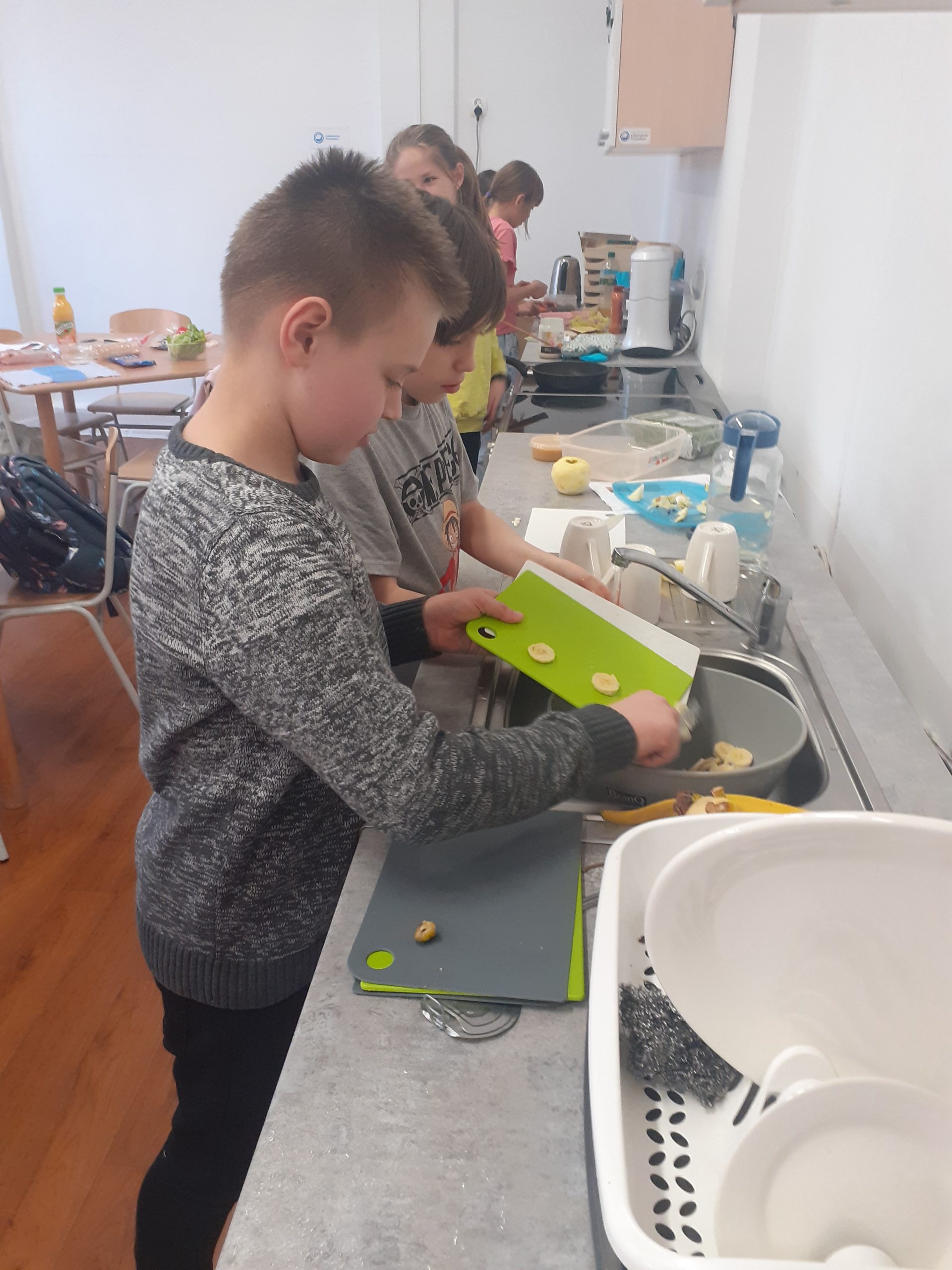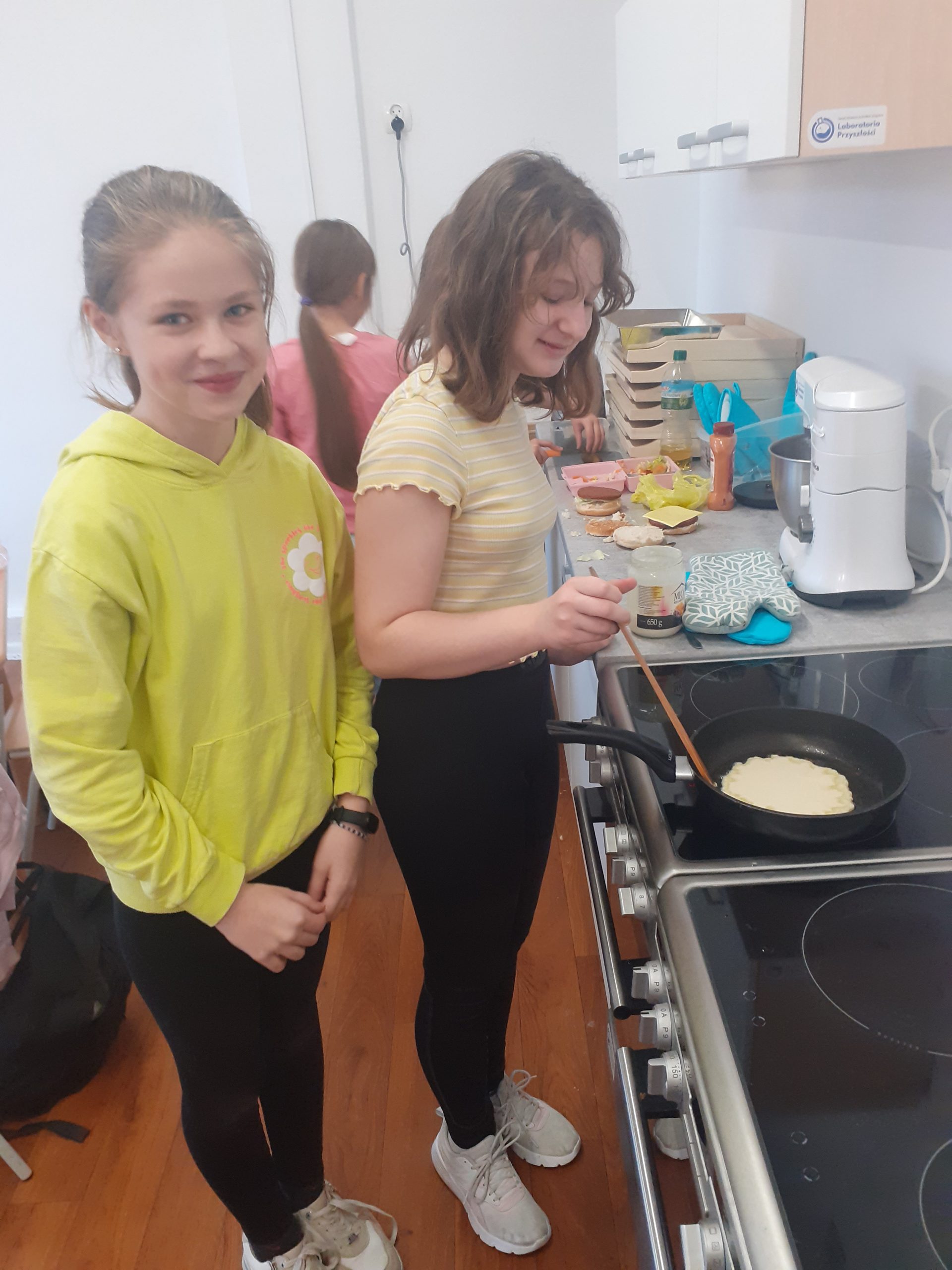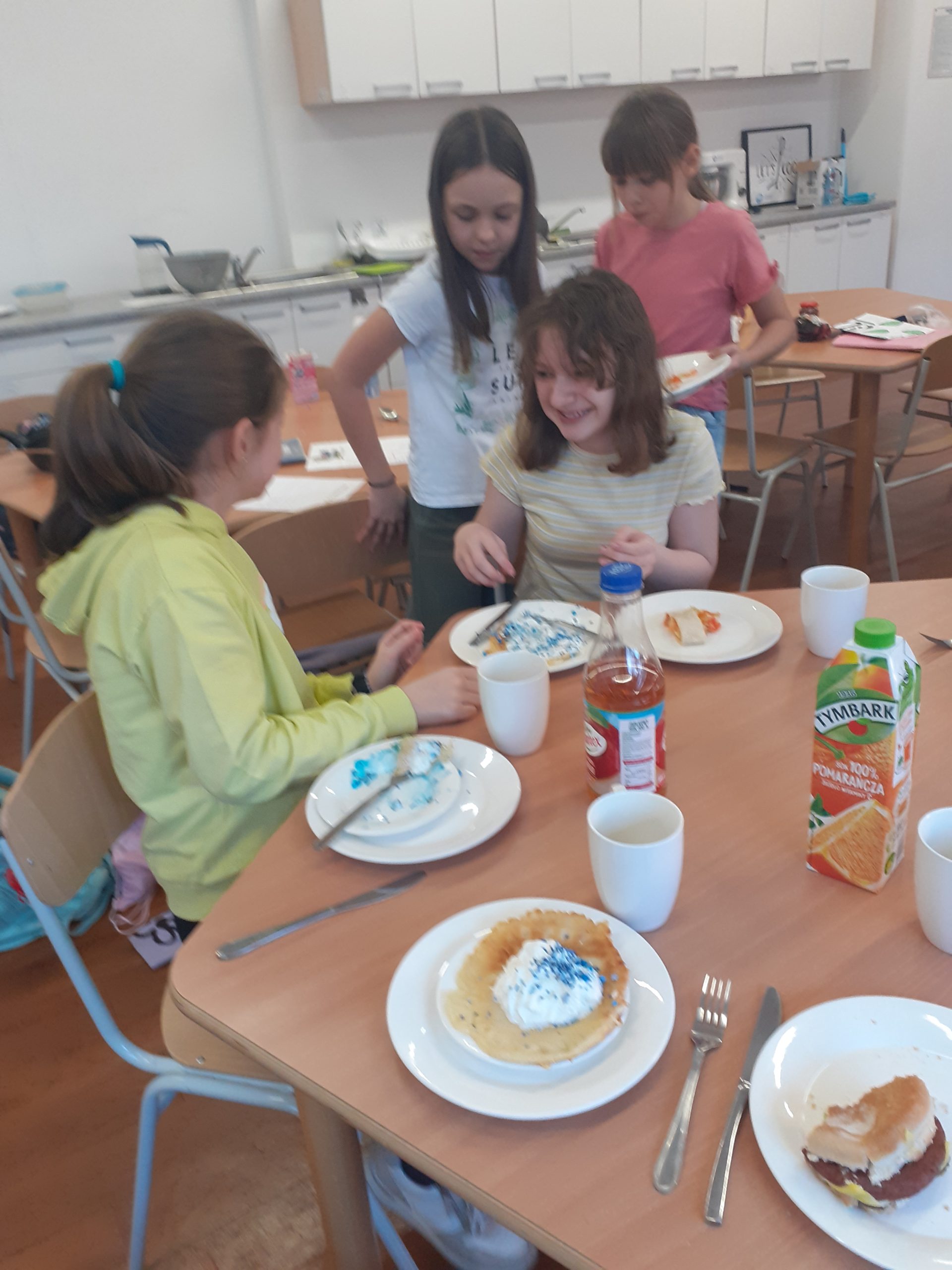 Uczniowie klasy 5a i 5b na lekcjach języka angielskiego pod kierunkiem pani Magdaleny Szymczak realizowali projekty kulinarne. Polegały one na przygotowaniu plakatów w języku angielskim z kartą dań i przepisami na wybrane potrawy. Następnie uczniowie zaprezentowali opracowane w parach projekty i odegrali scenki polegające na zamawianiu jedzenia w restauracji. Ostatnim etapem było przyrządzenie smacznych potraw z wykorzystaniem sprzętu kuchennego w Kuchcikowie. Uczniowie wykazali się pomysłowością i zaproponowali różnorodne dania, desery i napoje. Były serwowane dania na ciepło, takie jak naleśniki z rozmaitymi dodatkami, pizza, hamburgery, tosty czy chleb w jajku. Oprócz ciepłych posiłków przygotowano sałatki (grecką i owocową), a także propozycje deserów, soków i koktajli mlecznych. Degustacja przygotowanych pyszności sprawiła wszystkim wiele radości. Dlatego uważamy wizytę za udaną.