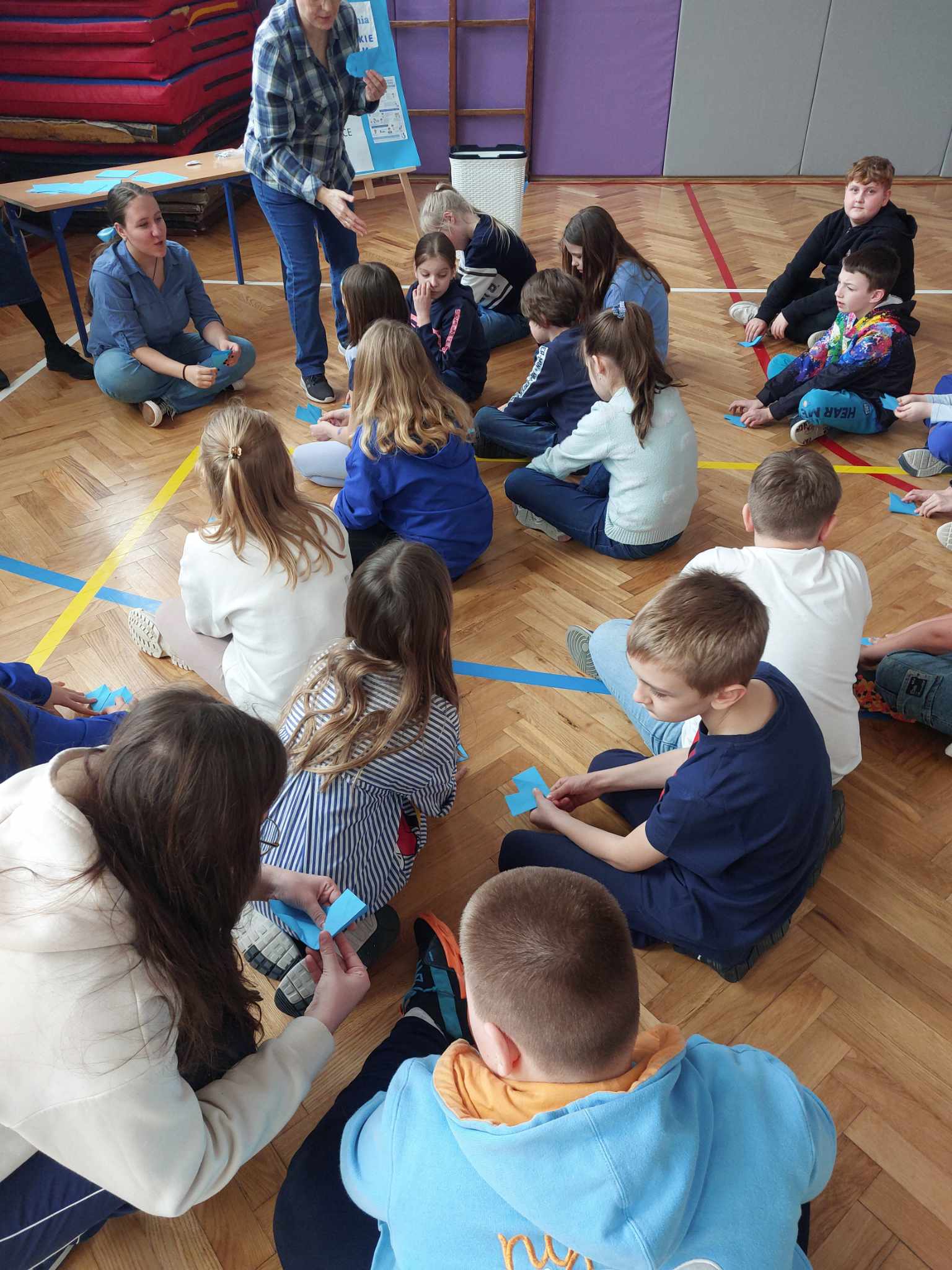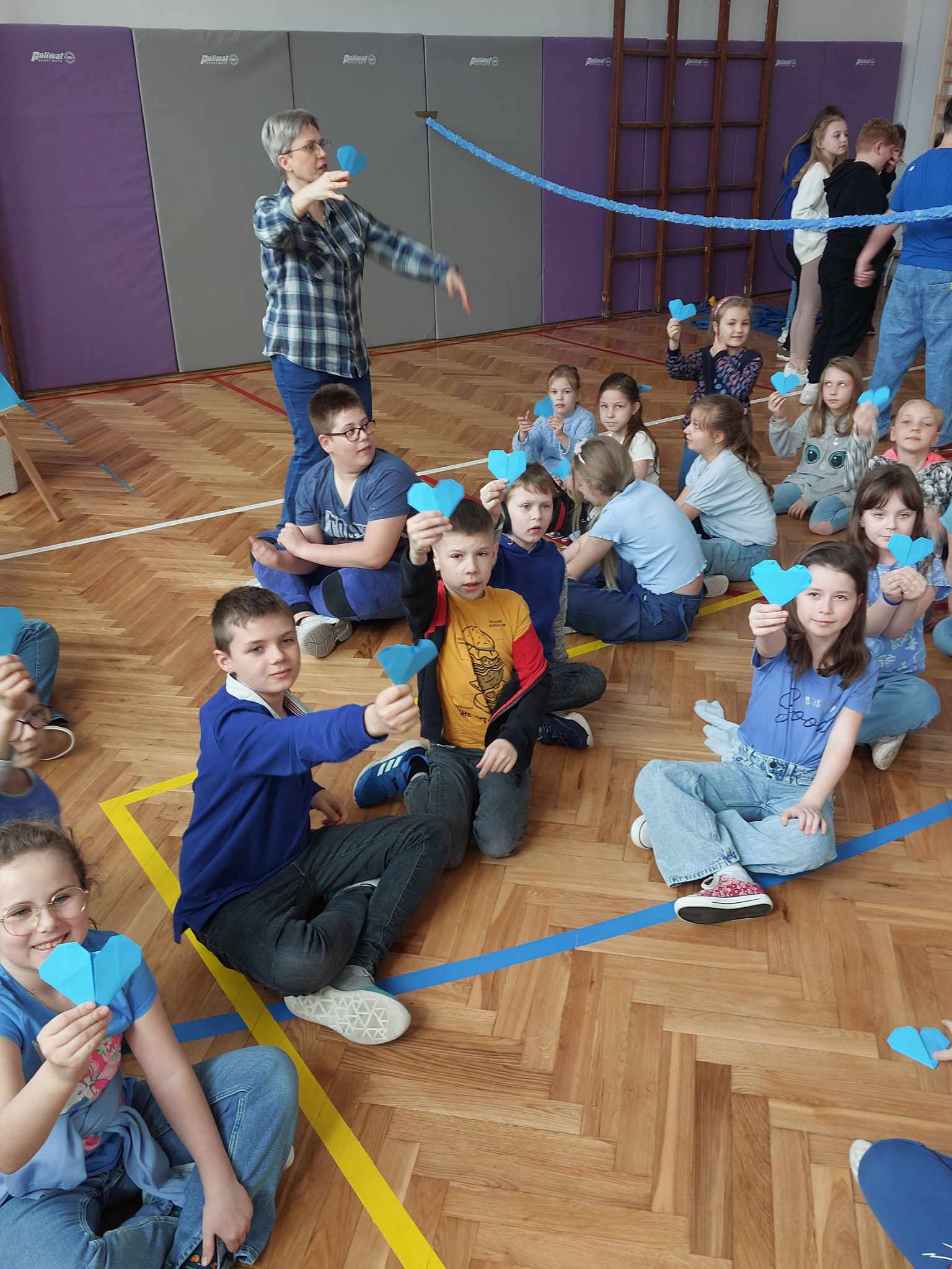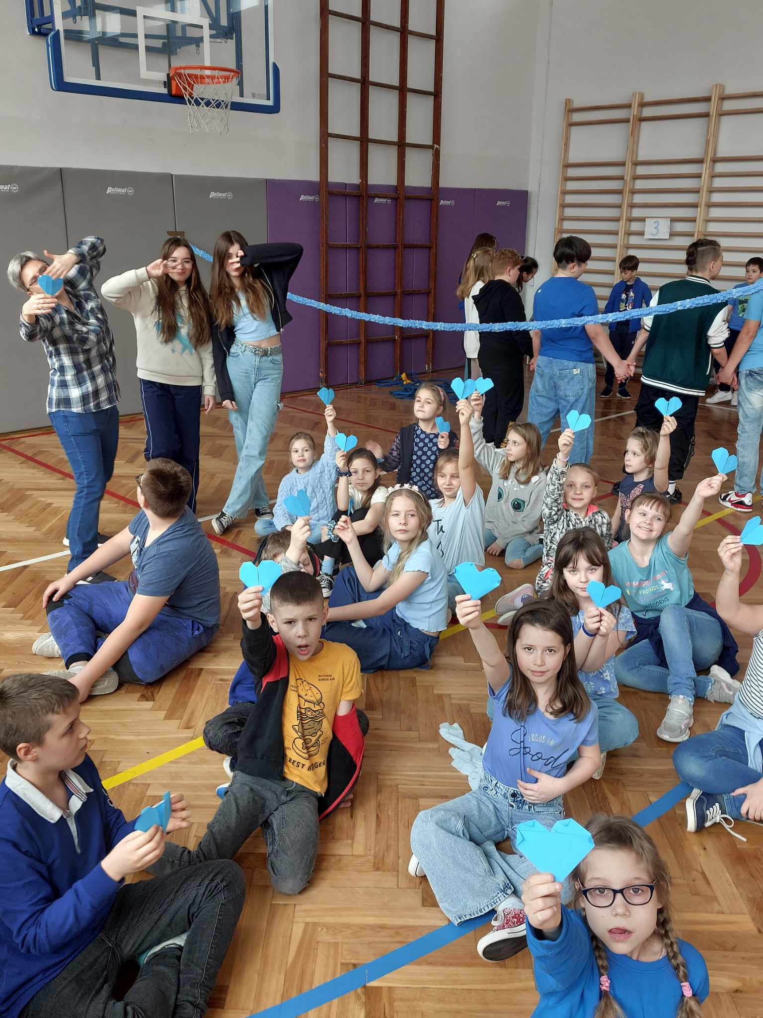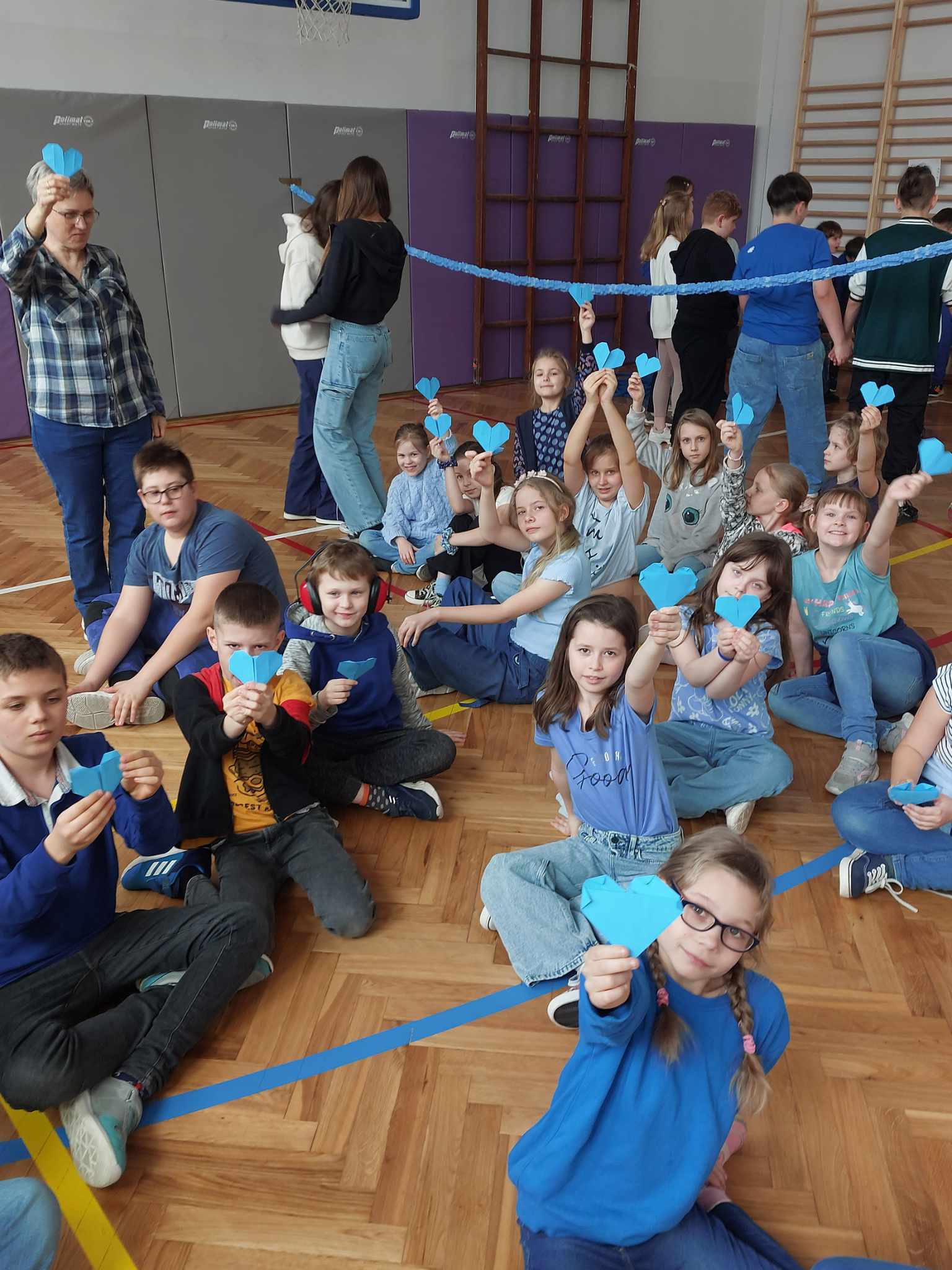 W dniu 4 kwietnia 2024 odbyły się zajęcia dla uczniów klas II i III. Wychowawcy przeprowadzili lekcje edukacyjne na temat autyzmu. Następnie na sali gimnastycznej odbyła się część warsztatowa. Uczniowie na Niebieskich Stoiskach wykonywali ciekawe działania. Na stoisku „Podaruj Serce” składali niebieskie serca metodą origami. Kolejne stoisko „Pomocna Dłoń”- to miejsce gdzie tworzyli wspólne plakaty z odrysowanych i wyciętych swoich dłoni, na kolejnym „Wspólny Relaks” kolorowali. Na ostatnim „Razem Działamy” mieli zorganizowane zabawy ruchowe wymagające współpracy. Uczniowie klas II b i III a wraz z nauczycielami wyszli przed szkołę, aby wręczyć przechodniom część wykonanych serc. Dlatego, aby szerzyć świadomość na temat spektrum autyzmu. Podejmowane działania przyniosły uczniom wiele radości, ale i dobrych myśli dotyczących autyzmu.
