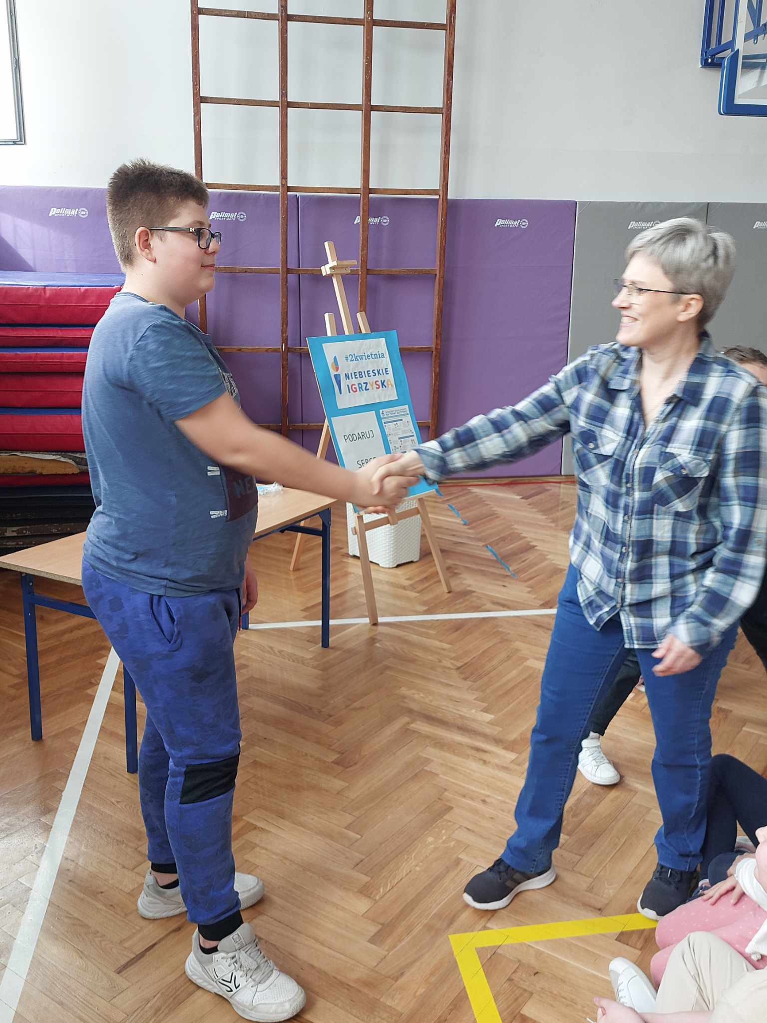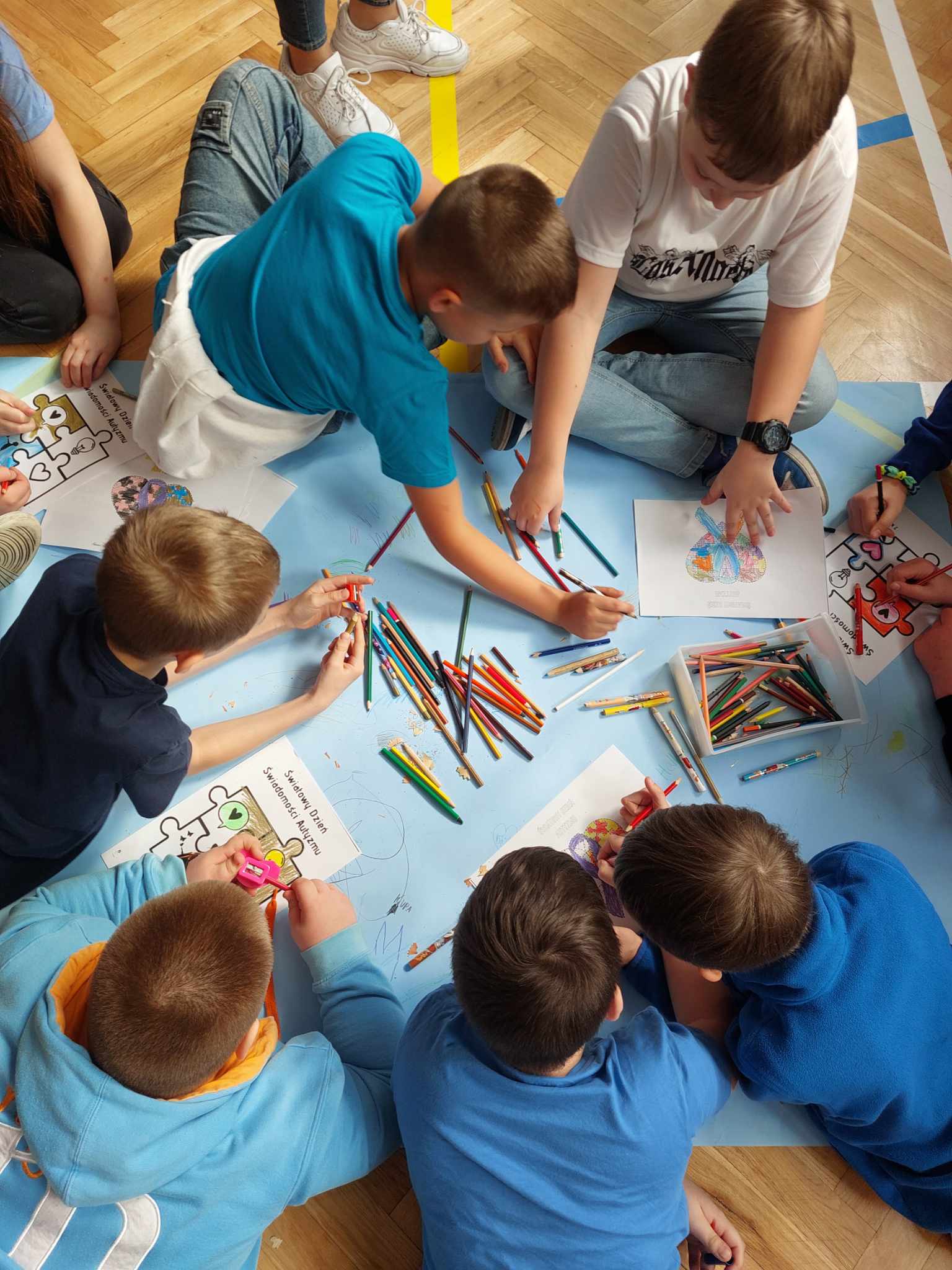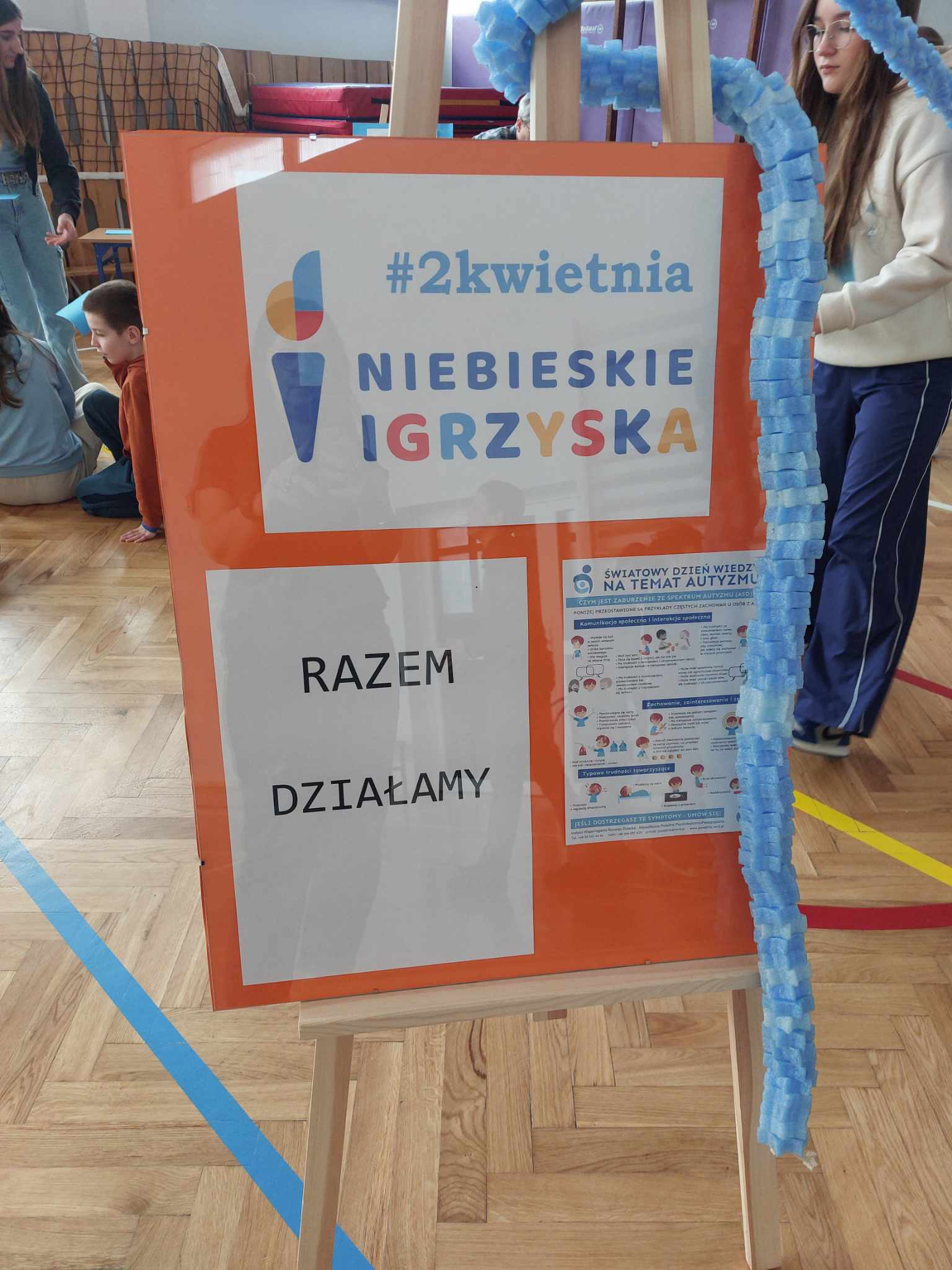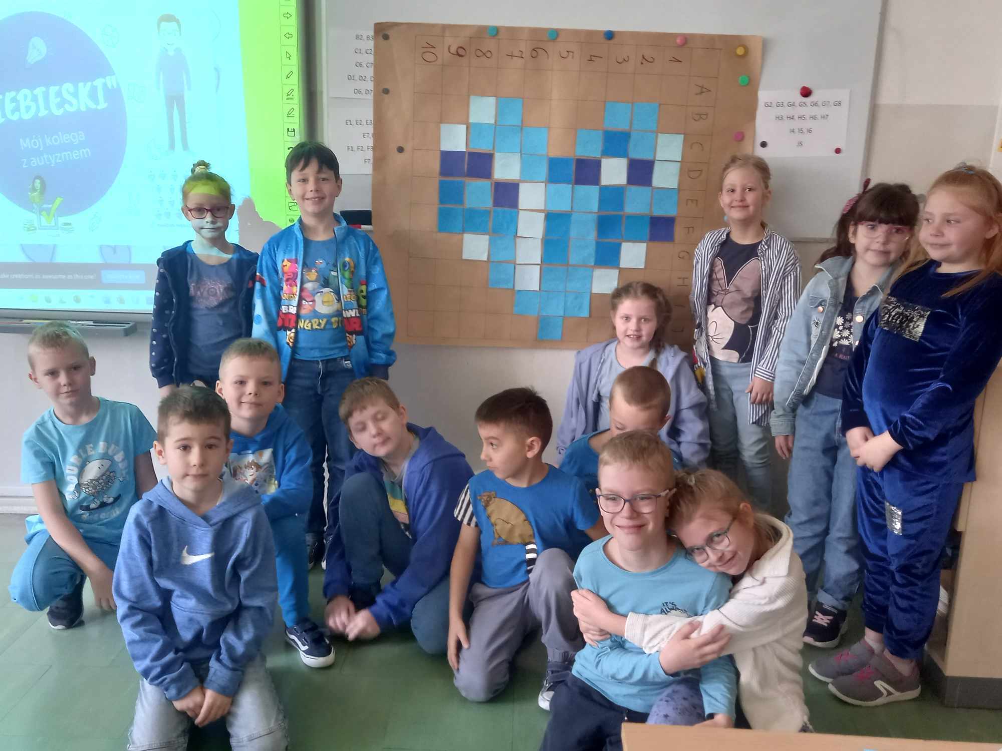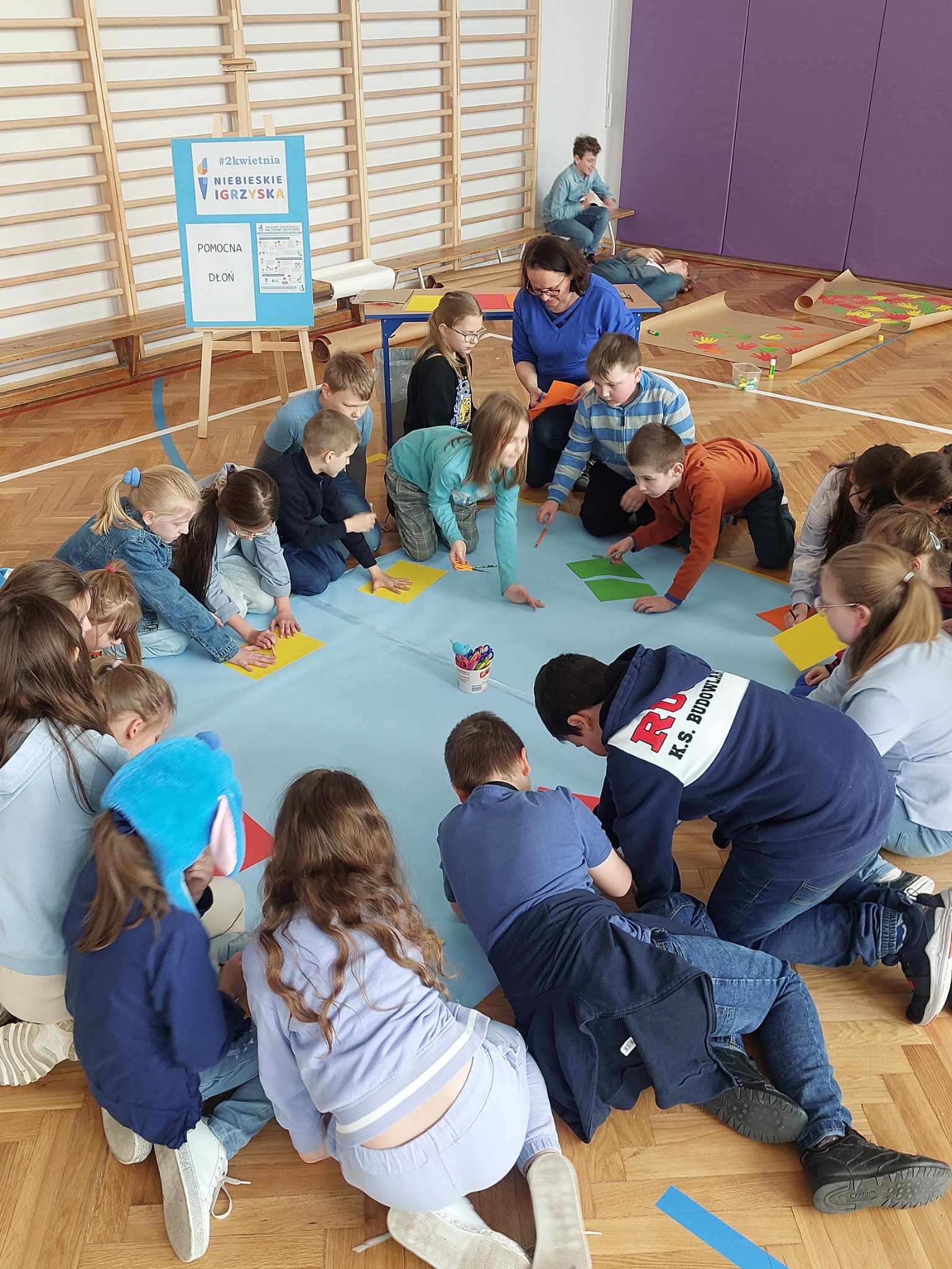 W dniu 4 kwietnia 2024 odbyły się zajęcia dla uczniów klas II i III. Wychowawcy przeprowadzili lekcje edukacyjne na temat autyzmu. Następnie na sali gimnastycznej odbyła się część warsztatowa. Uczniowie na Niebieskich Stoiskach wykonywali ciekawe działania. Na stoisku „Podaruj Serce” składali niebieskie serca metodą origami. Kolejne stoisko „Pomocna Dłoń”- to miejsce gdzie tworzyli wspólne plakaty z odrysowanych i wyciętych swoich dłoni, na kolejnym „Wspólny Relaks” kolorowali. Na ostatnim „Razem Działamy” mieli zorganizowane zabawy ruchowe wymagające współpracy. Uczniowie klas II b i III a wraz z nauczycielami wyszli przed szkołę, aby wręczyć przechodniom część wykonanych serc. Dlatego, aby szerzyć świadomość na temat spektrum autyzmu. Podejmowane działania przyniosły uczniom wiele radości, ale i dobrych myśli dotyczących autyzmu.