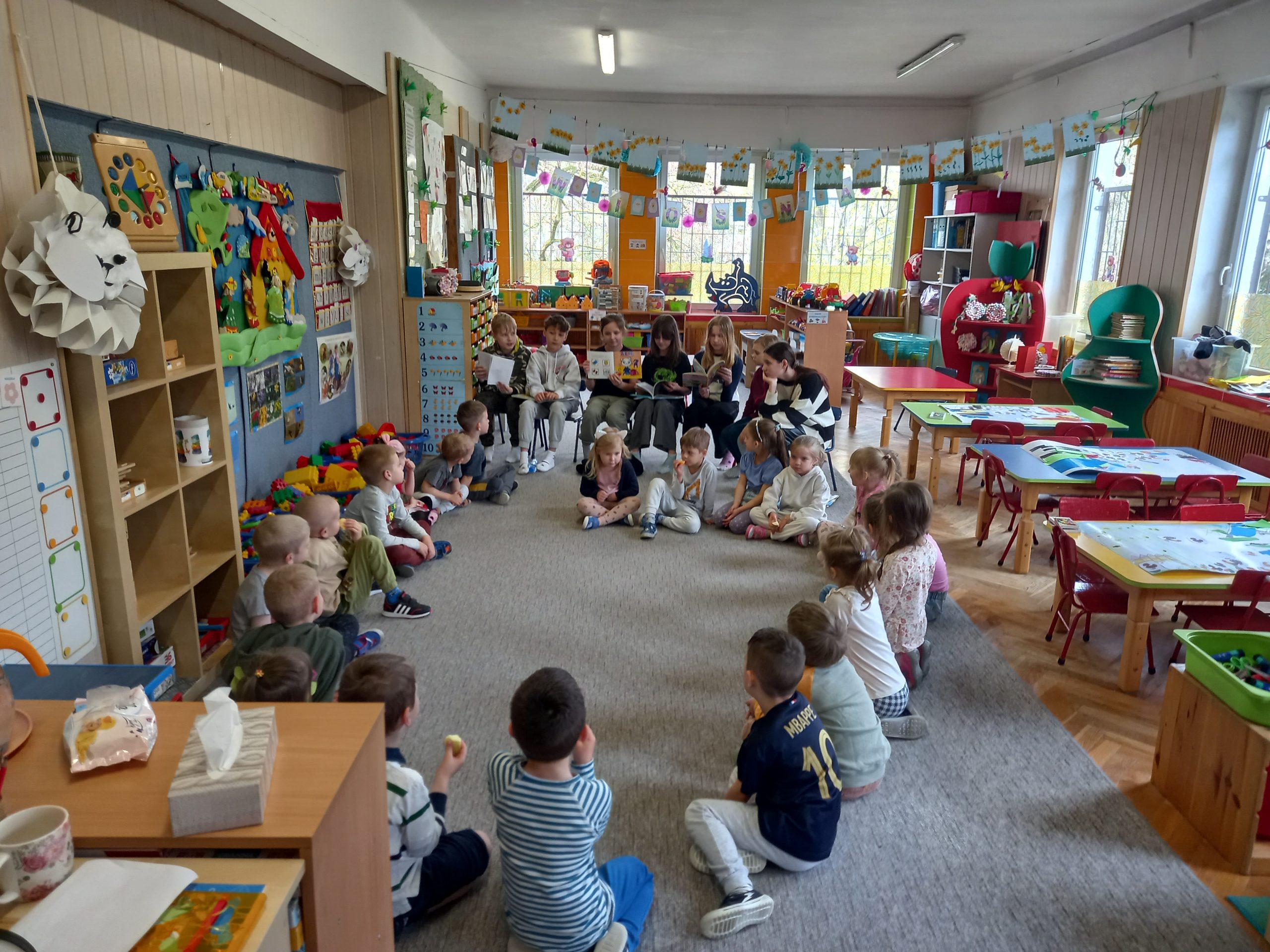 W czwartek 4 kwietnia przedstawiciele klasy 5d odwiedzili przedszkolaki z Przedszkola Miejskiego nr 120. Skład przedstawicieli: Ala, Laura, Ewa, Polina, Zuzia, Karol i Aleksander wraz z p Kamilą Namiecińską. W ramach cyklicznej współpracy, przypomnijmy że ostatnio odbyły się 2 wizyty przyszłych Pierwszoklasistów z tego przedszkola. Oraz Dni Otwarte w naszej szkole. Tym razem uczniowie klasy 5d prowadzili zajęcia z języka angielskiego we wszystkich 6 grupach przedszkolnych. Takich jak: Żabki, Pszczółki, Motylki, Biedronki, Mrówki oraz Żuczki.