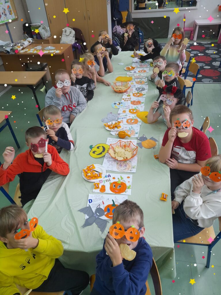 Halloween i Święto Dyni 31 października to dla klasy 2b kolejna okazja do wspólnego biesiadowania. Po przygotowaniu dekoracji i symbolicznych masek – dyniowych binokli – uczniowie zasiedli wspólnie do stołu częstując się domowymi ciasteczkami. Słodycze w kształcie duchów, nietoperzy i dyń. Tego dnia na lekcjach panie nie szczędziły uczniom także psikusów. Celem ich było sprawdzenie ich uwagę, koncentracji na zadaniu i zrozumienia jego treści.