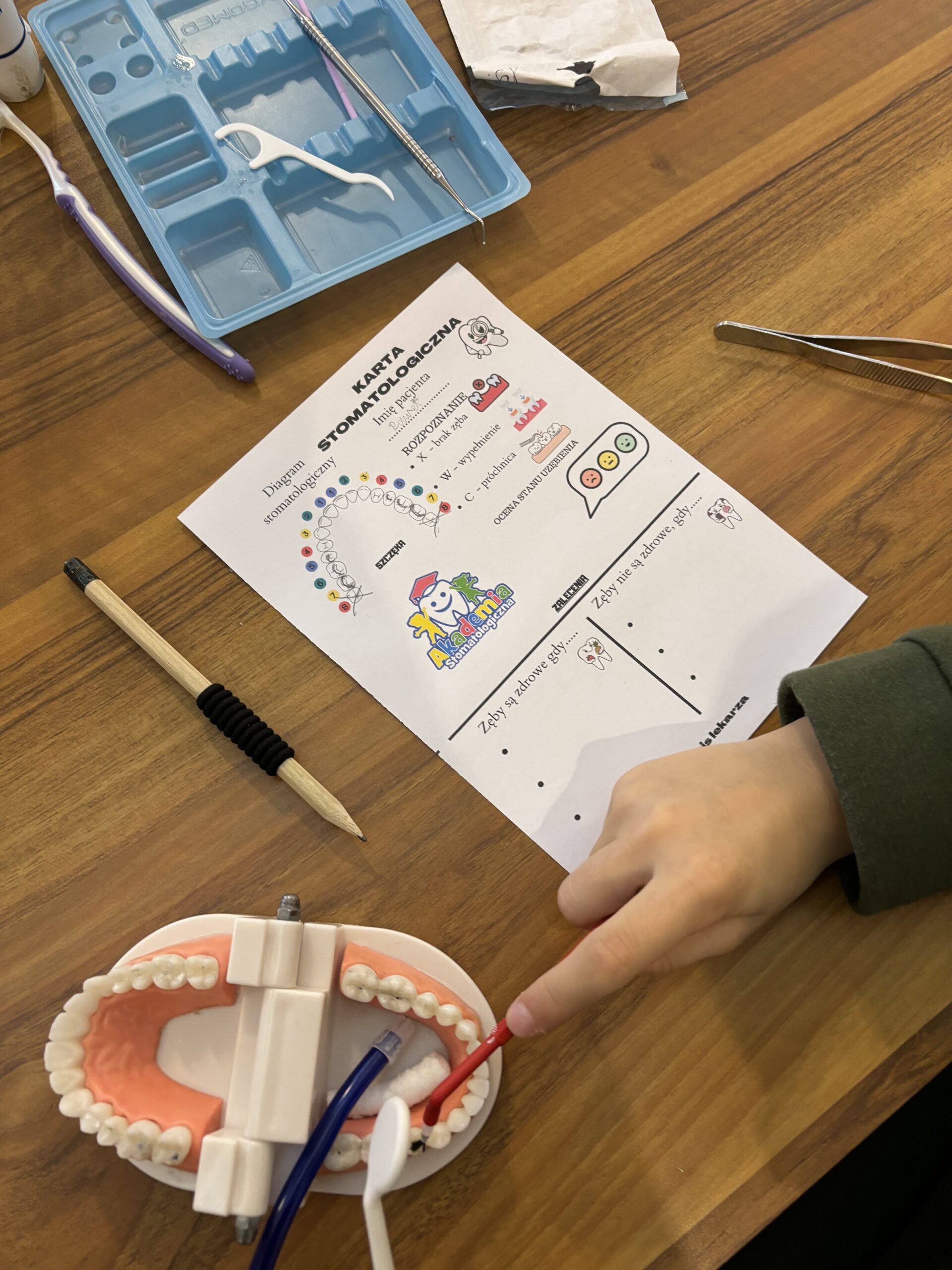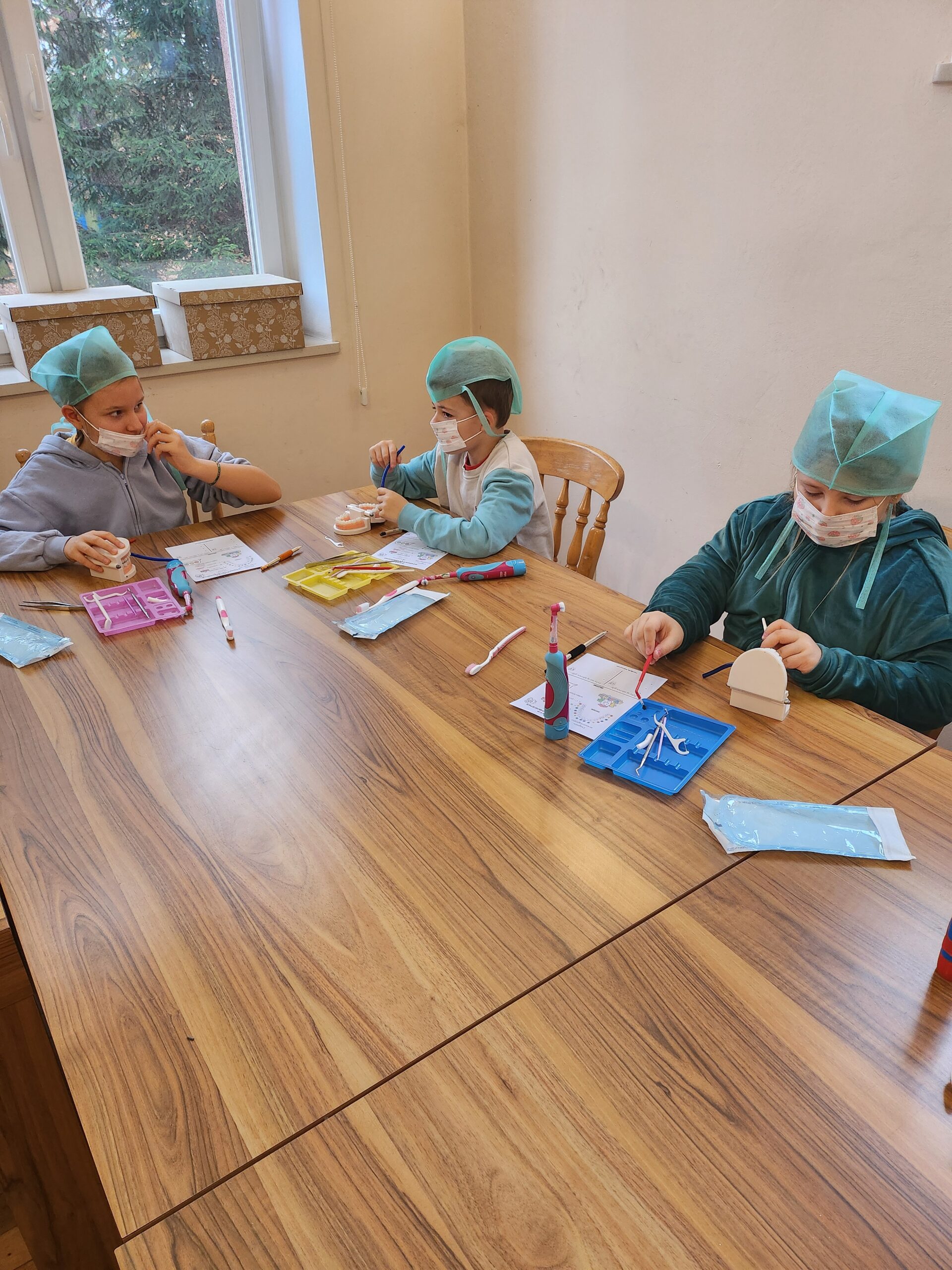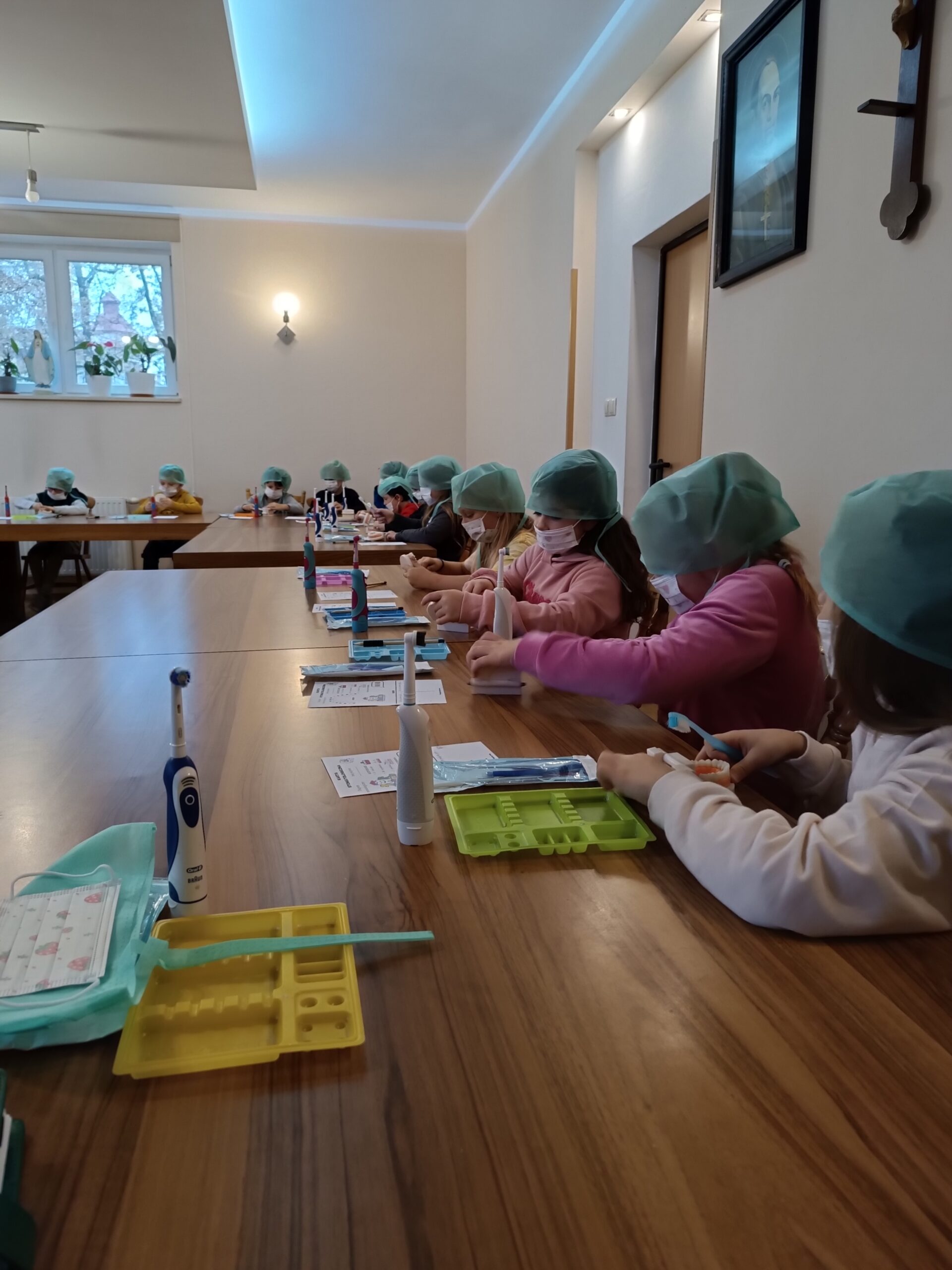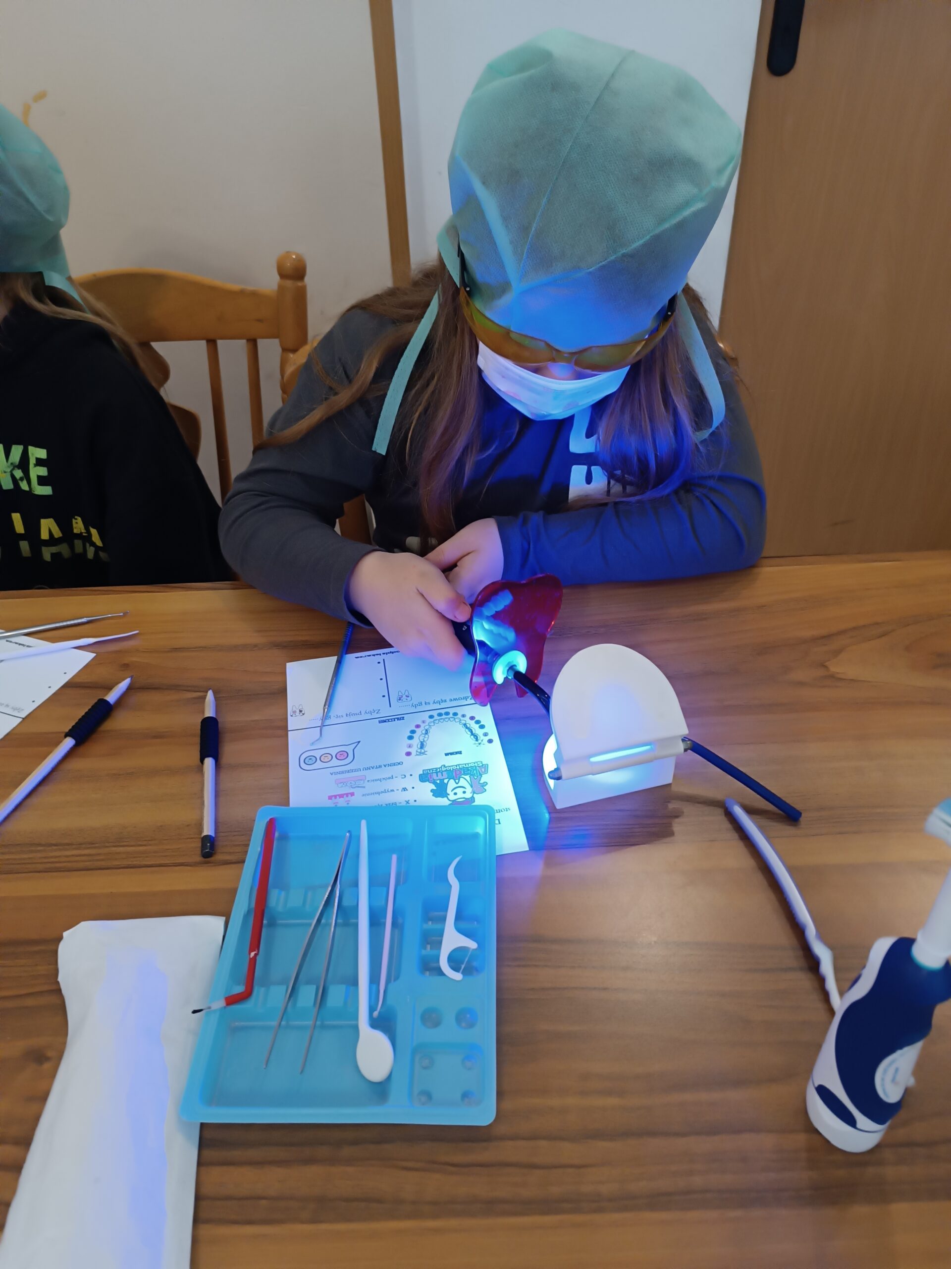 Podczas drugiej części warsztatów, każdy Uczeń, przy swoim stanowisku pracy zamienił się na moment w młodego stomatologa. Przećwiczył w praktyce, na modelu szczęki m. in. prawidłowe mycie zębów, nitkowanie. Uczniowie szukali ubytków w stanie uzębienia, lakierowali zęby smakowymi lakierami czy zakładali plomby światłoutwardzalne.