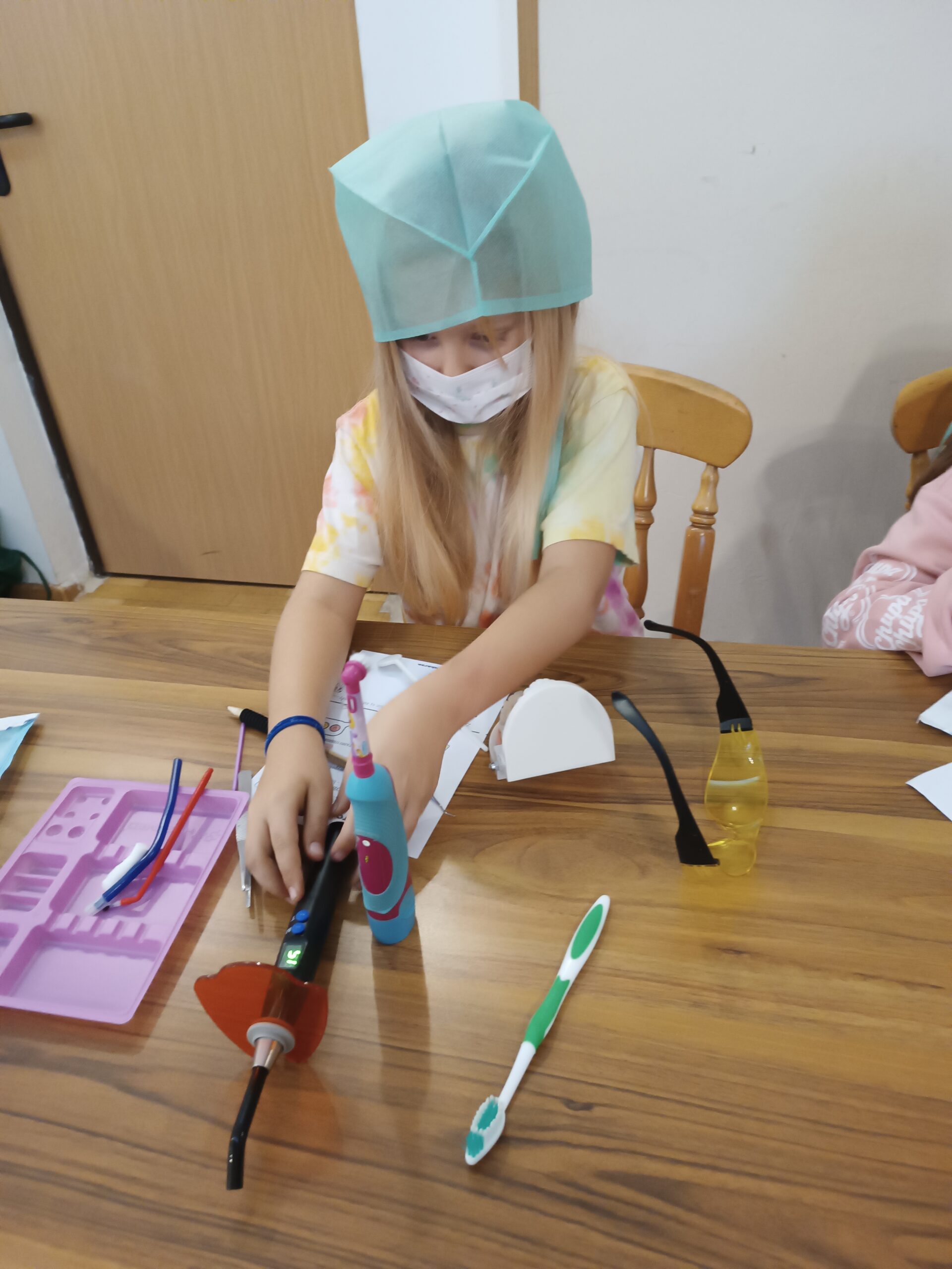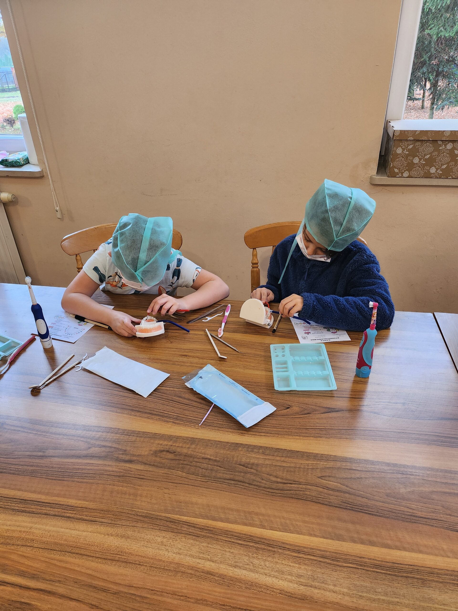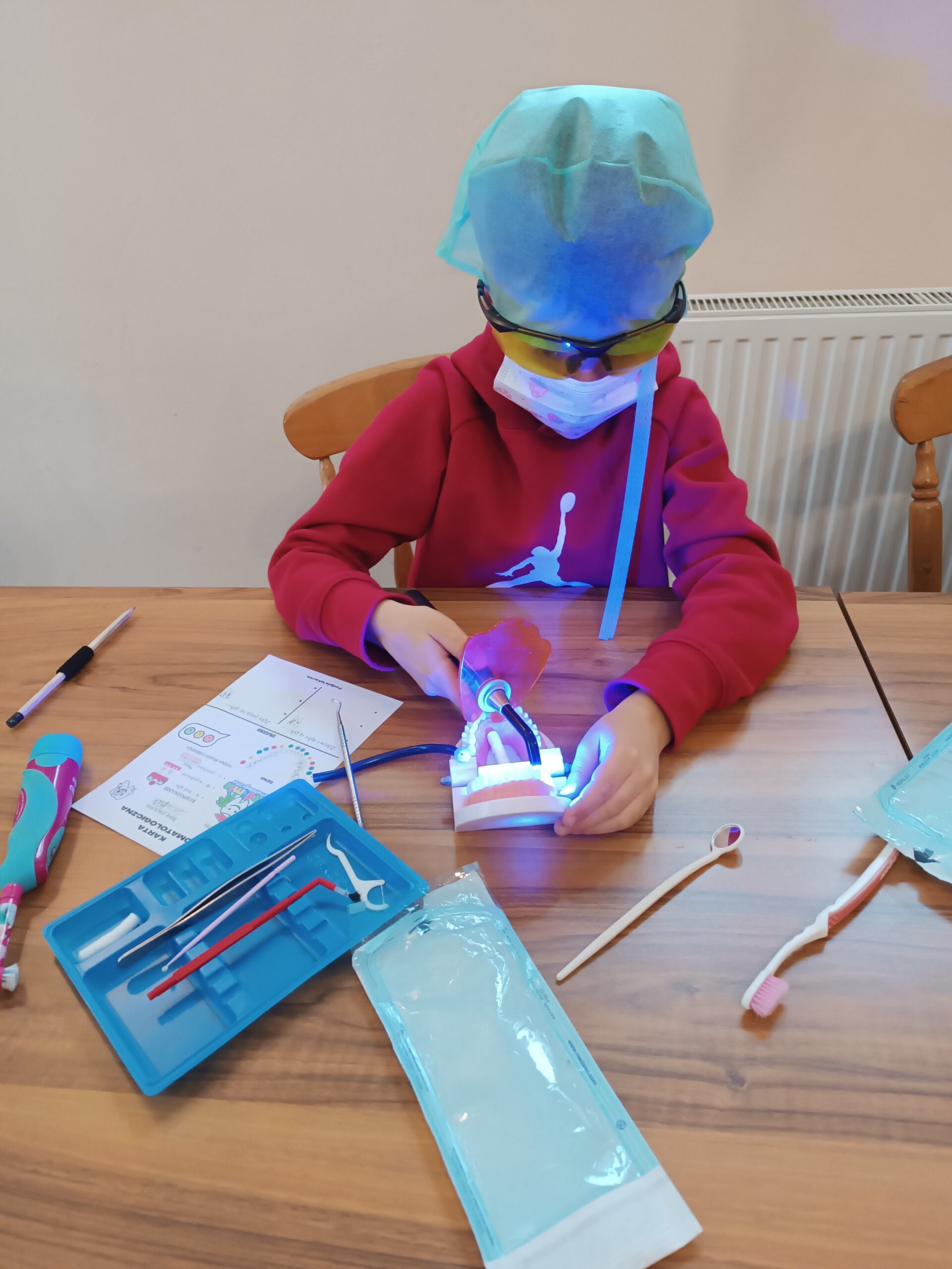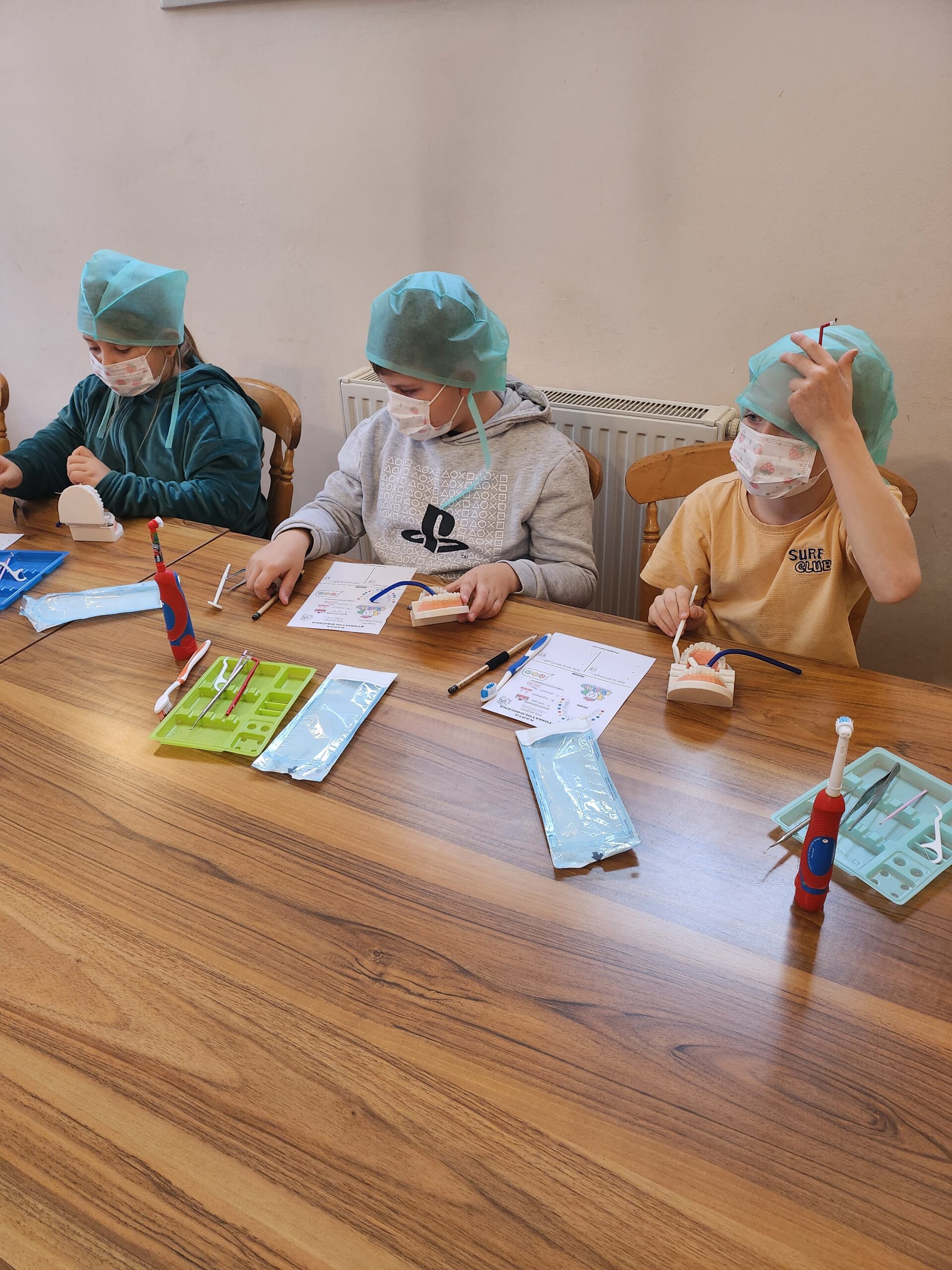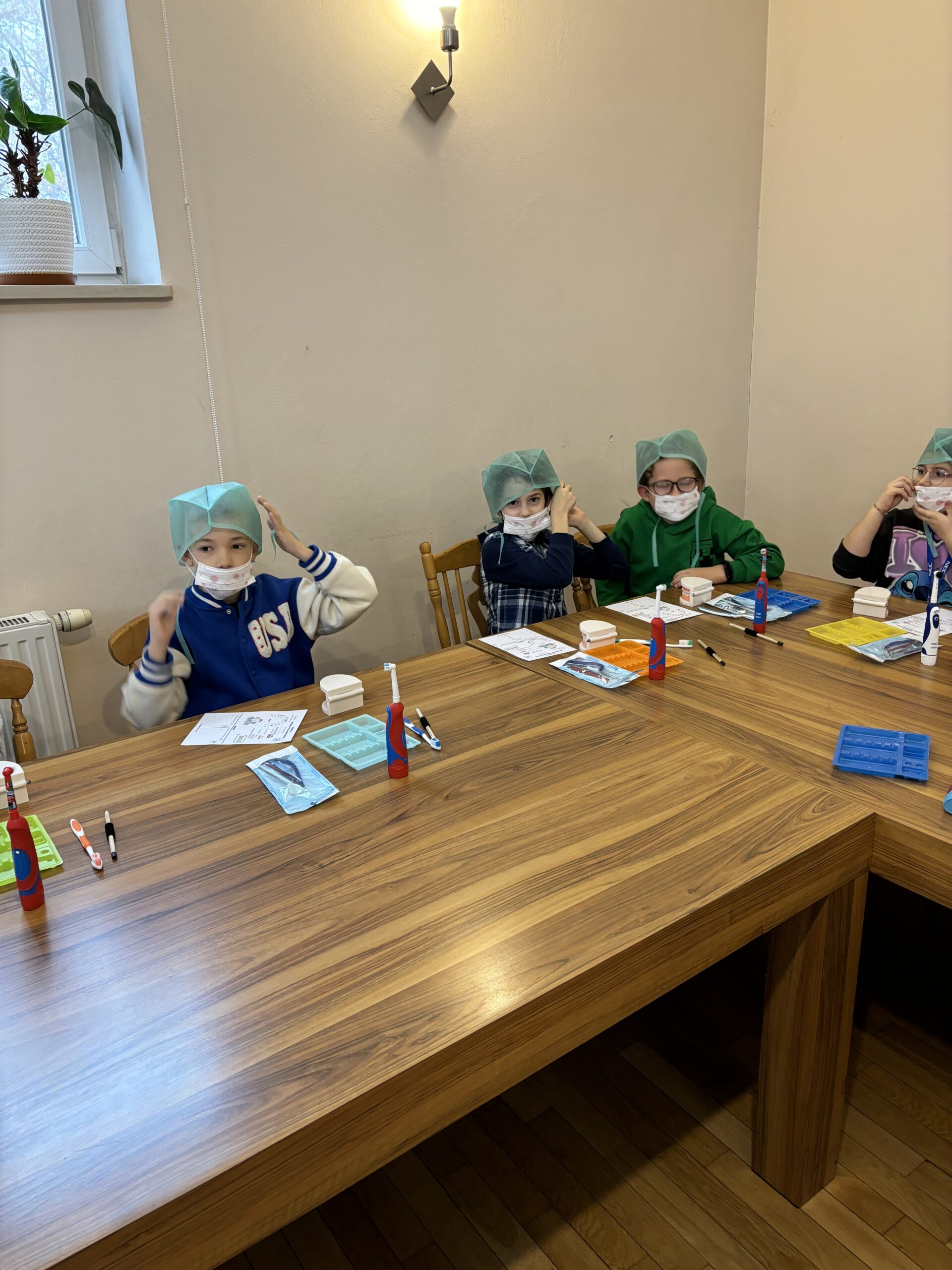 Podczas drugiej części warsztatów, każdy Uczeń, przy swoim stanowisku pracy zamienił się na moment w młodego stomatologa. Przećwiczył w praktyce, na modelu szczęki m. in. prawidłowe mycie zębów, nitkowanie. Uczniowie szukali ubytków w stanie uzębienia, lakierowali zęby smakowymi lakierami czy zakładali plomby światłoutwardzalne.