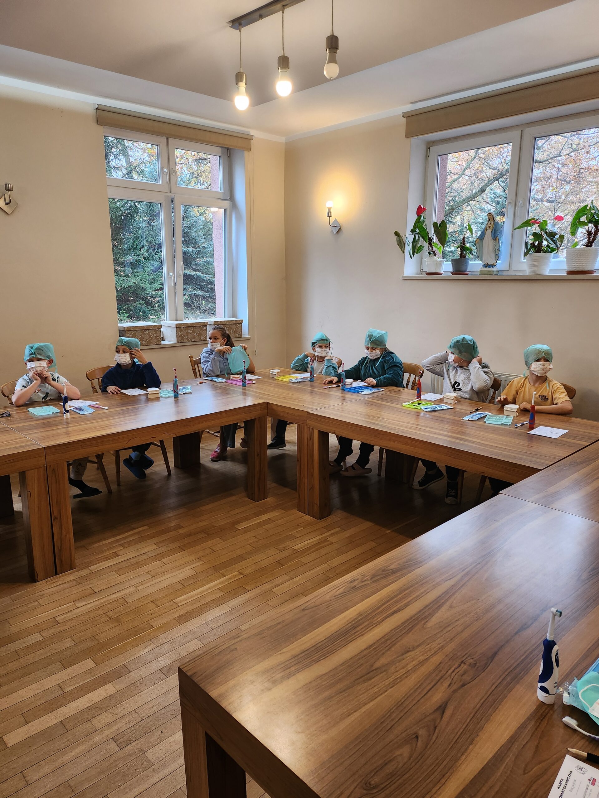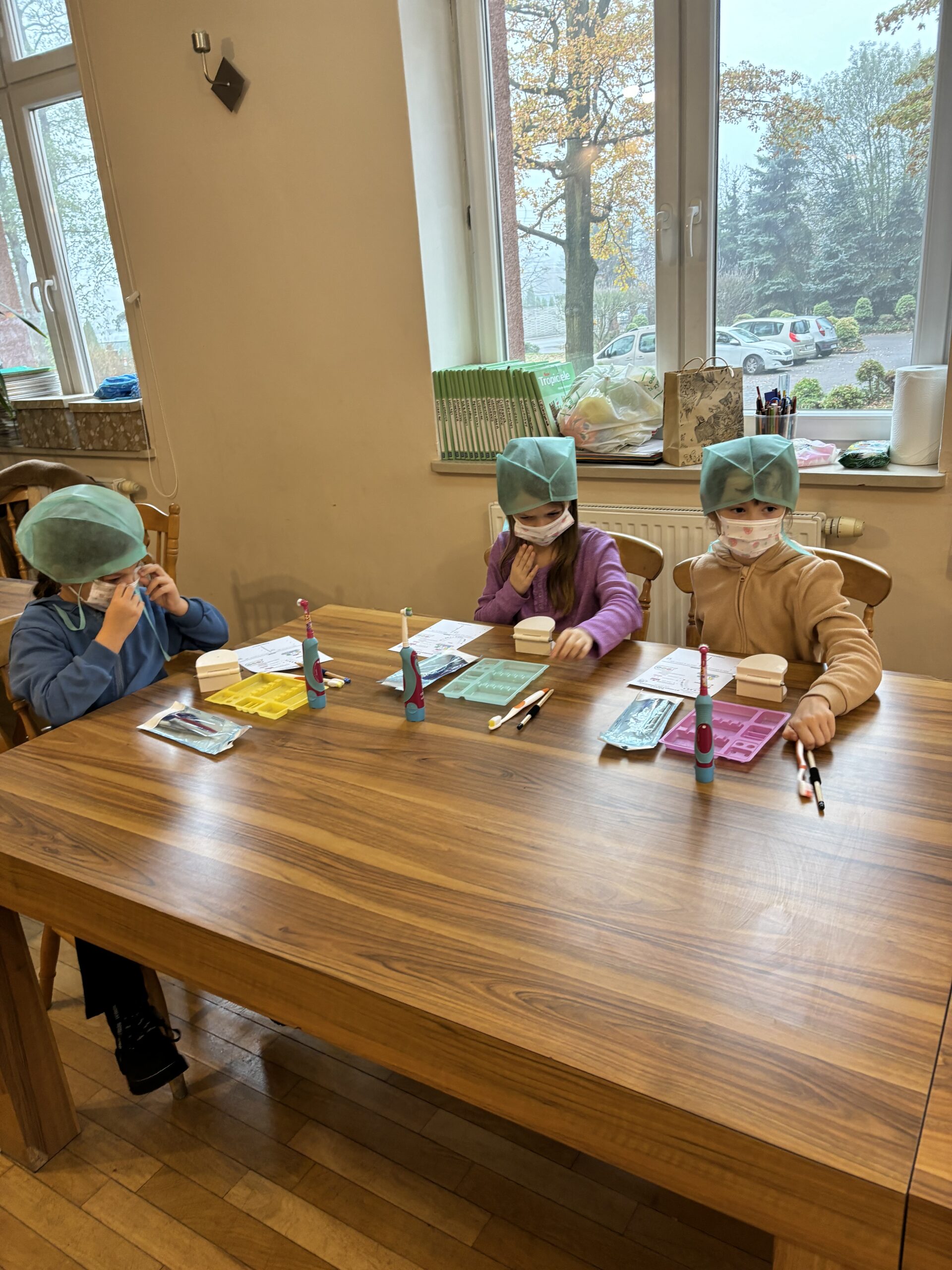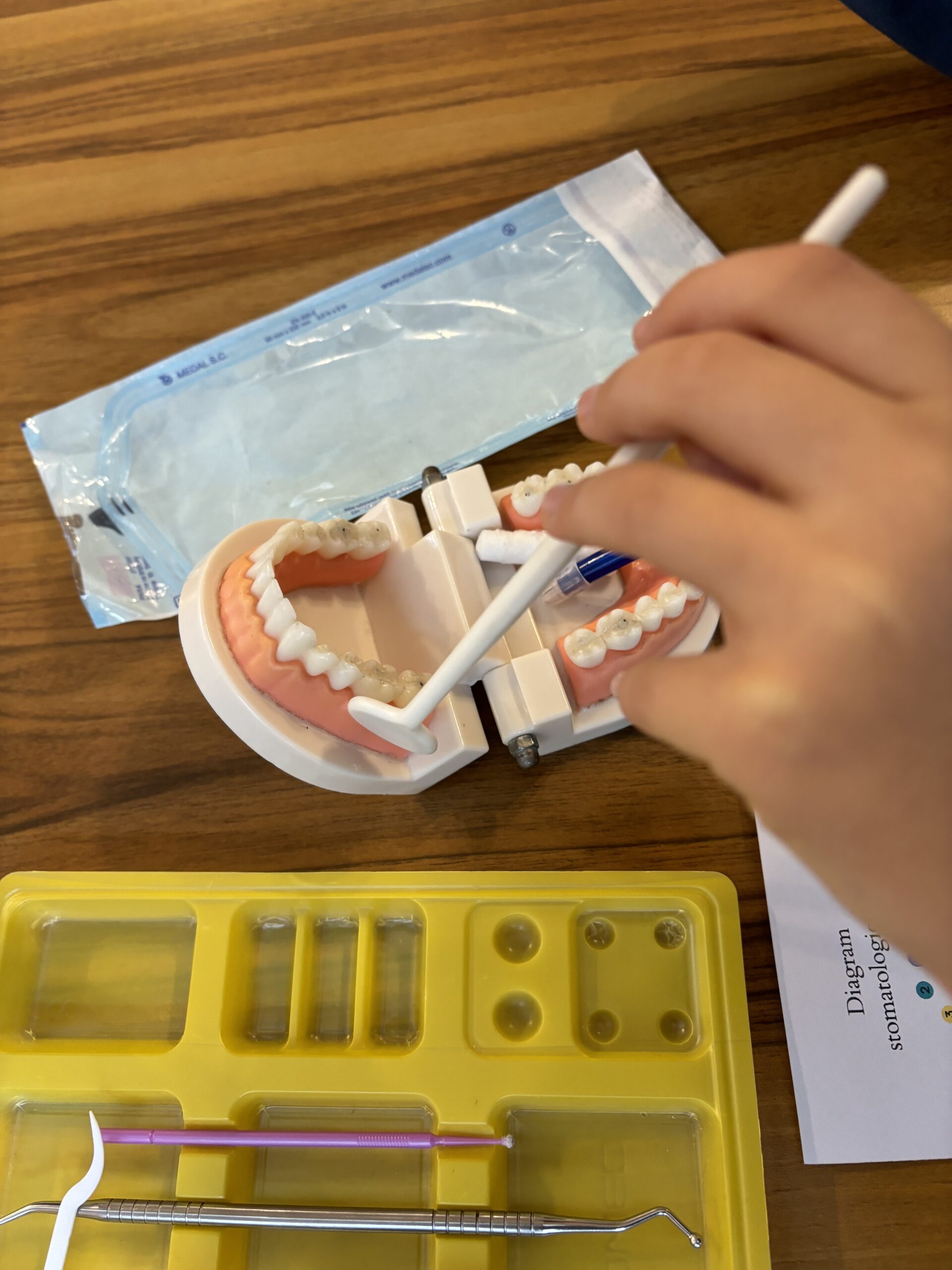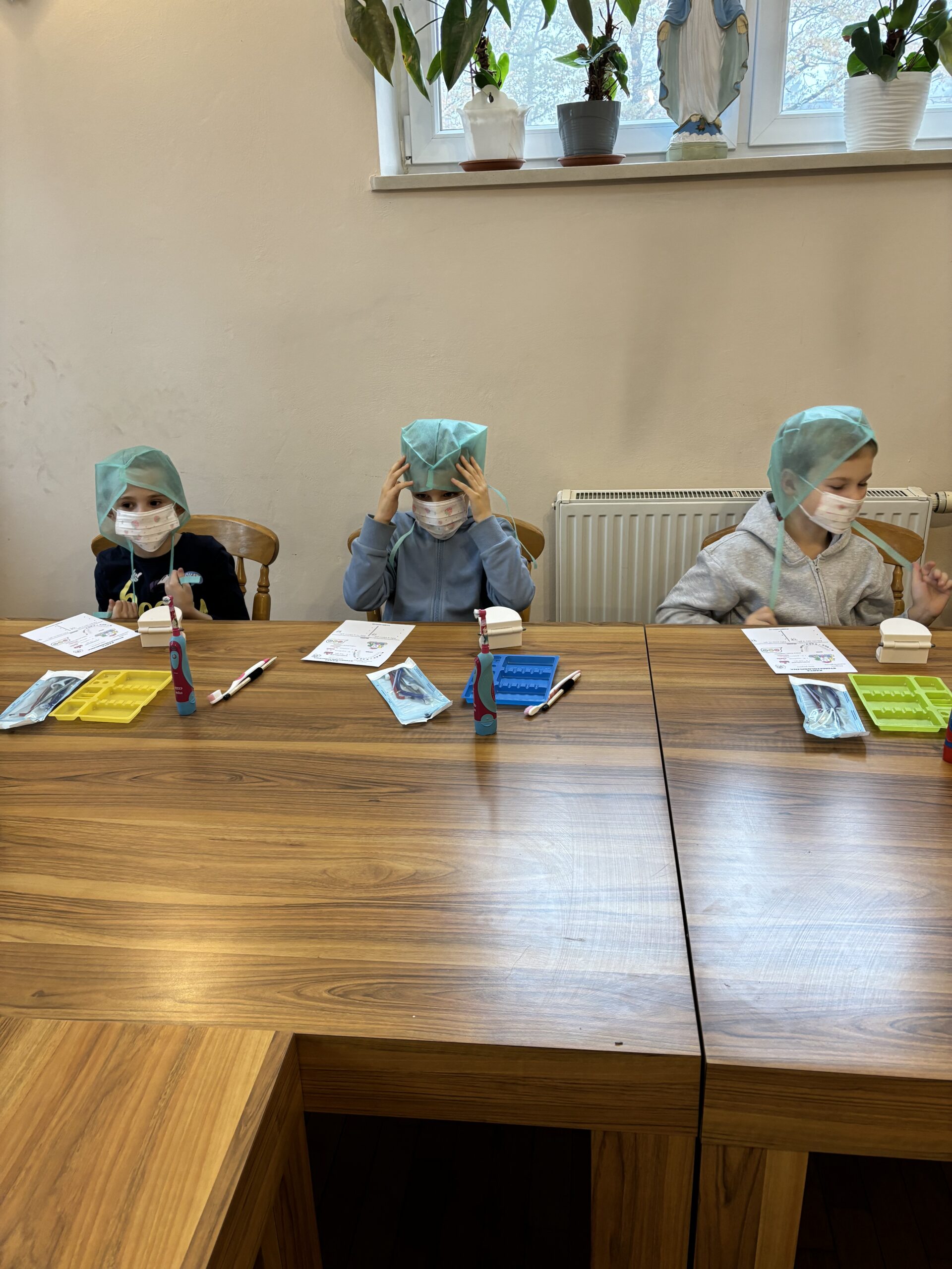Podczas drugiej części warsztatów, każdy Uczeń, przy swoim stanowisku pracy zamienił się na moment w młodego stomatologa. Przećwiczył w praktyce, na modelu szczęki m. in. prawidłowe mycie zębów, nitkowanie. Uczniowie szukali ubytków w stanie uzębienia, lakierowali zęby smakowymi lakierami czy zakładali plomby światłoutwardzalne.