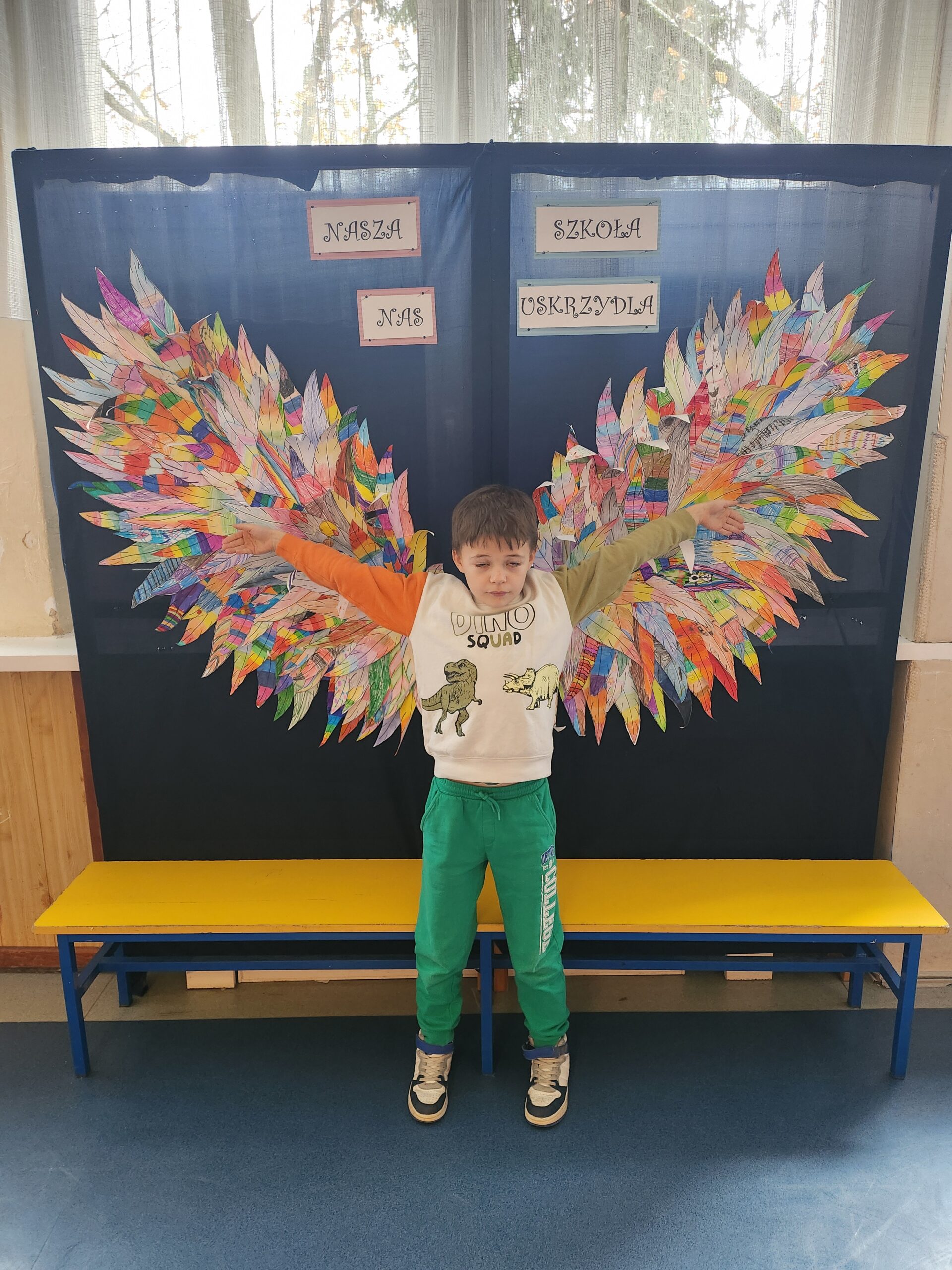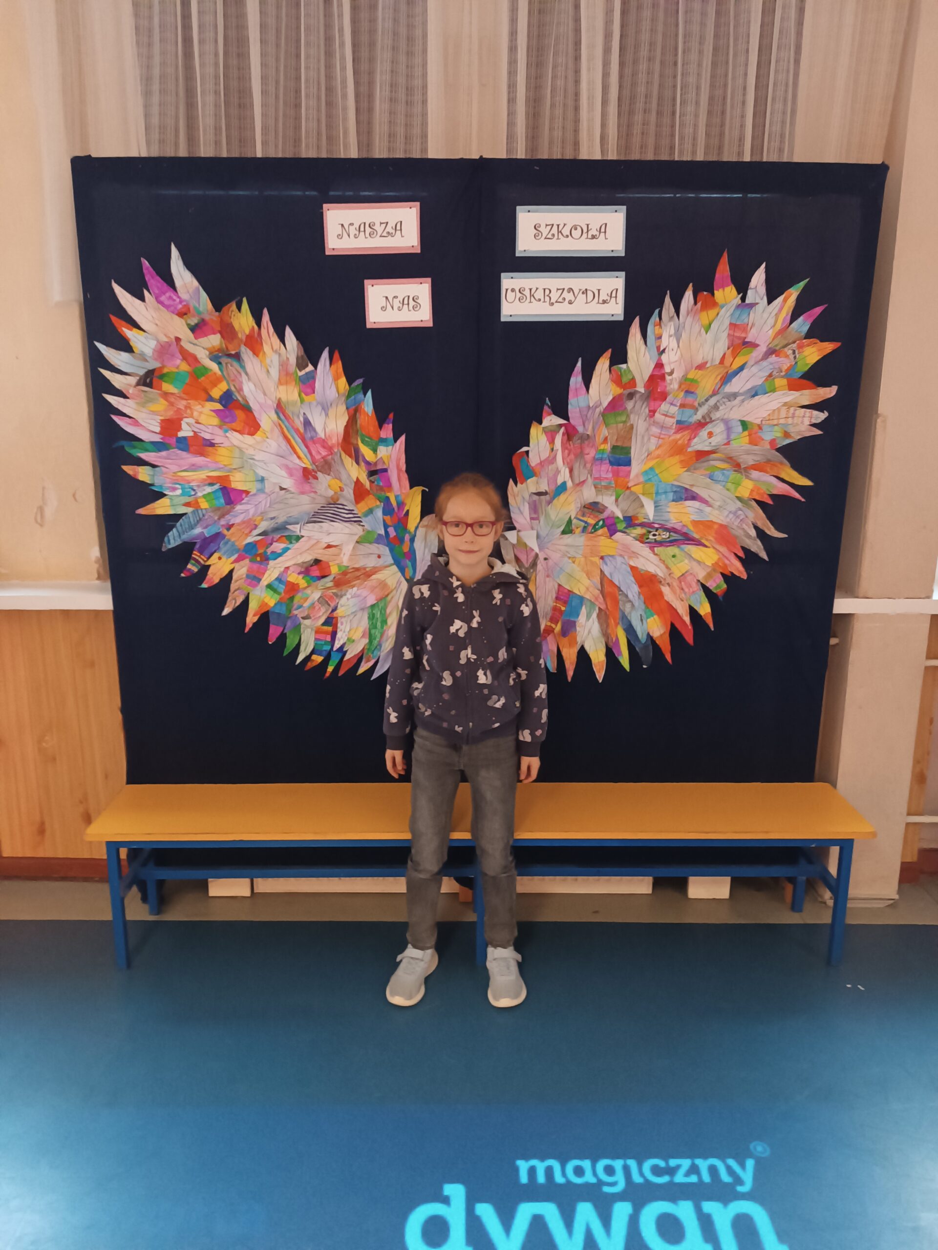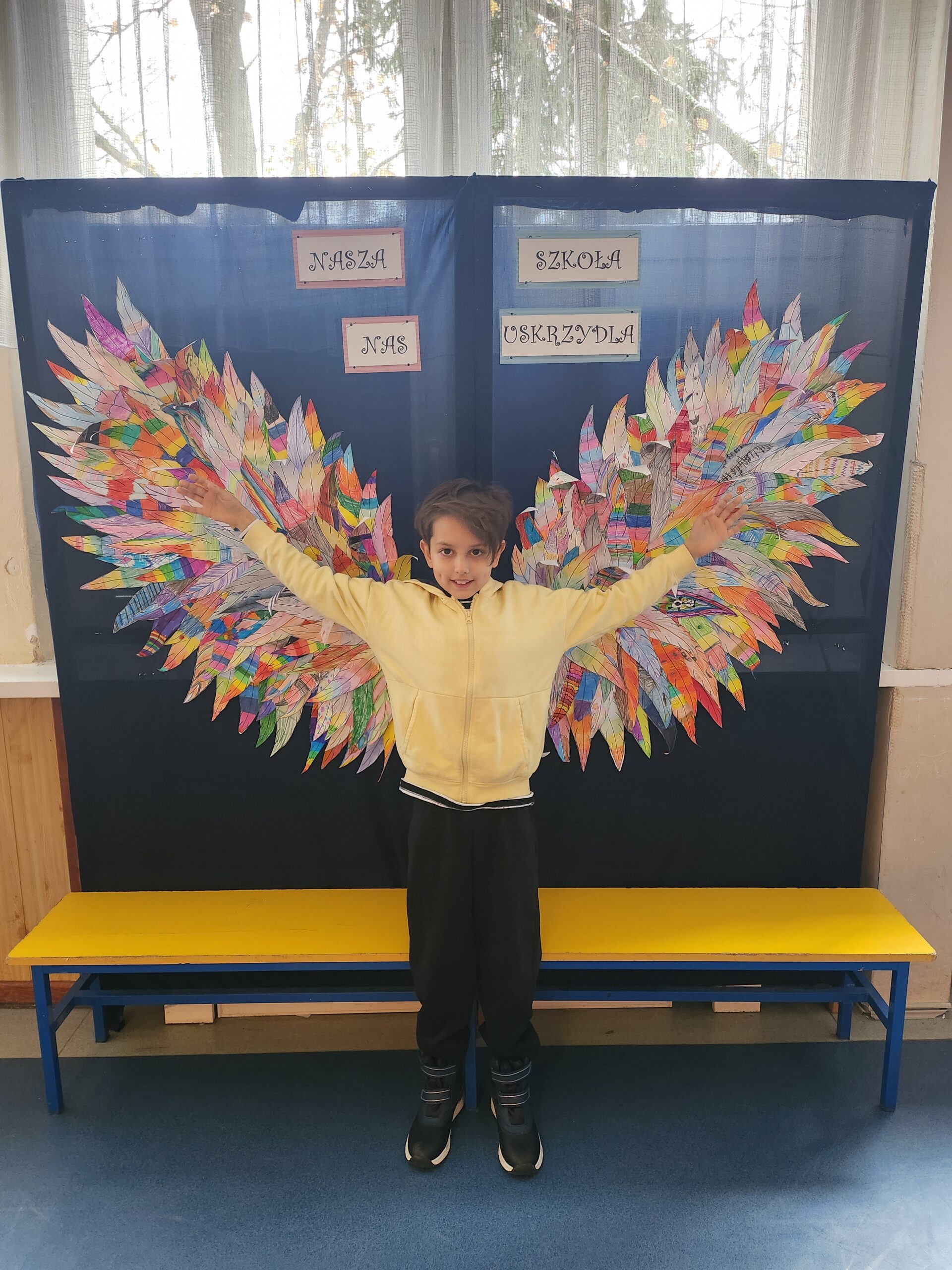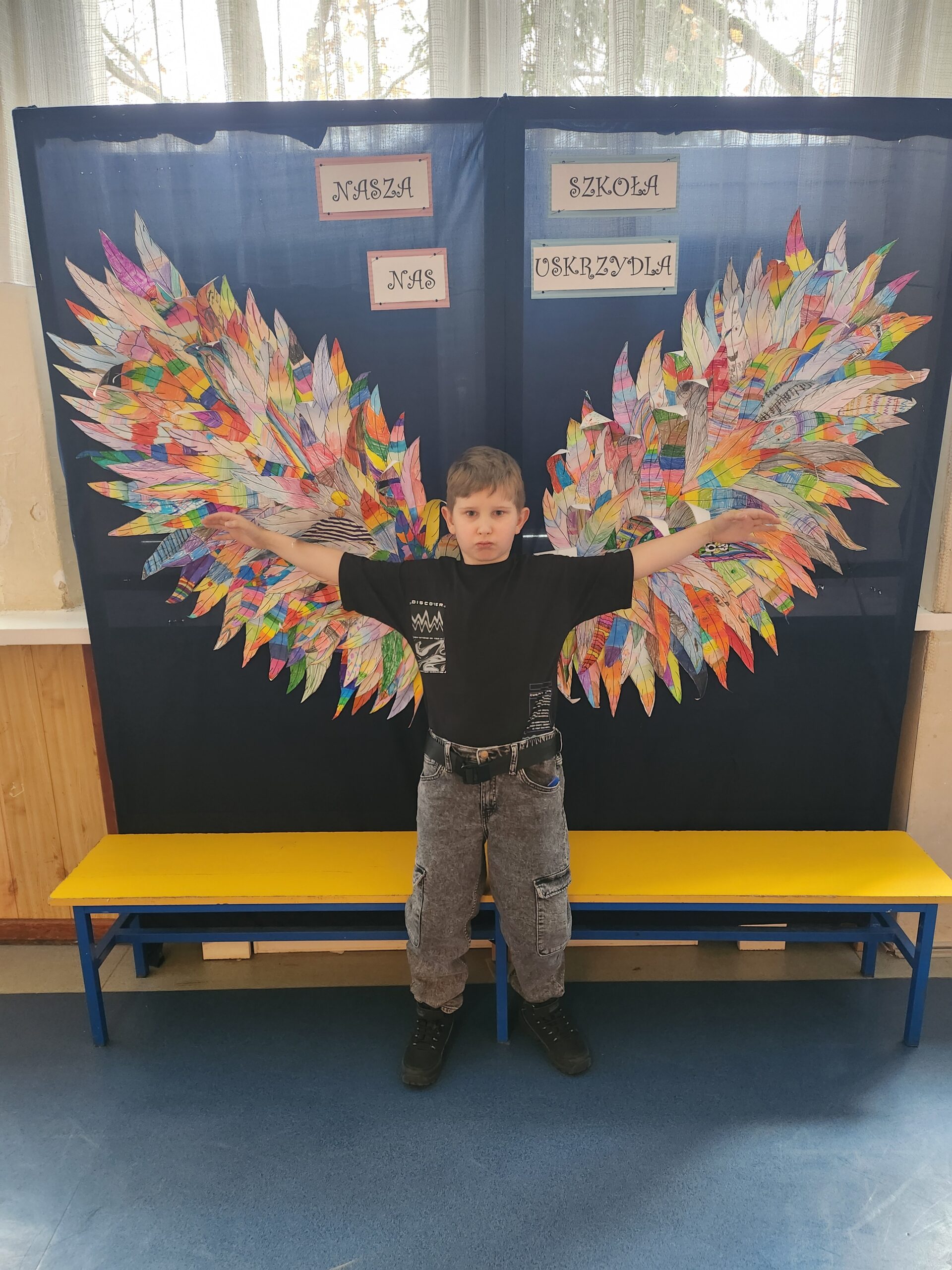 Ponadto dzieci z klas 1 – 3, wykonały wspólne dzieło pt. „Nasza Szkoła Nas Uskrzydla”. Powstała instalacja ozdobiła pierwsze piętro naszej szkoły, dając możliwość wykonania „uskrzydlających fotografii”.