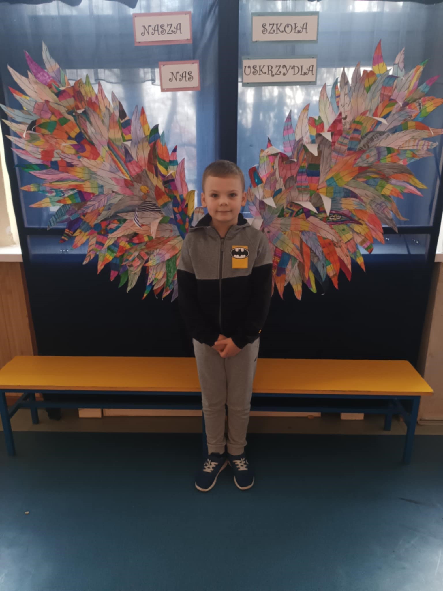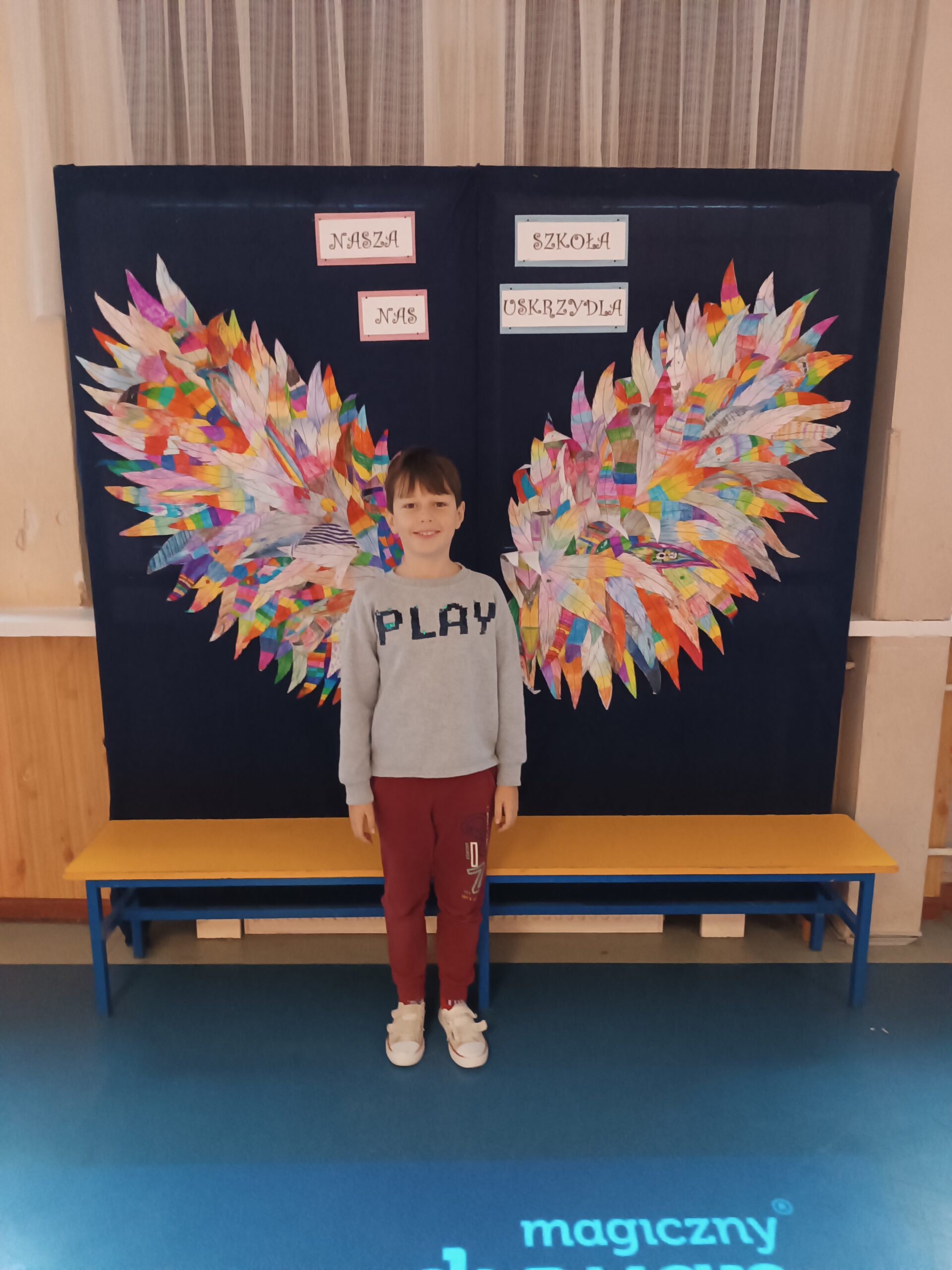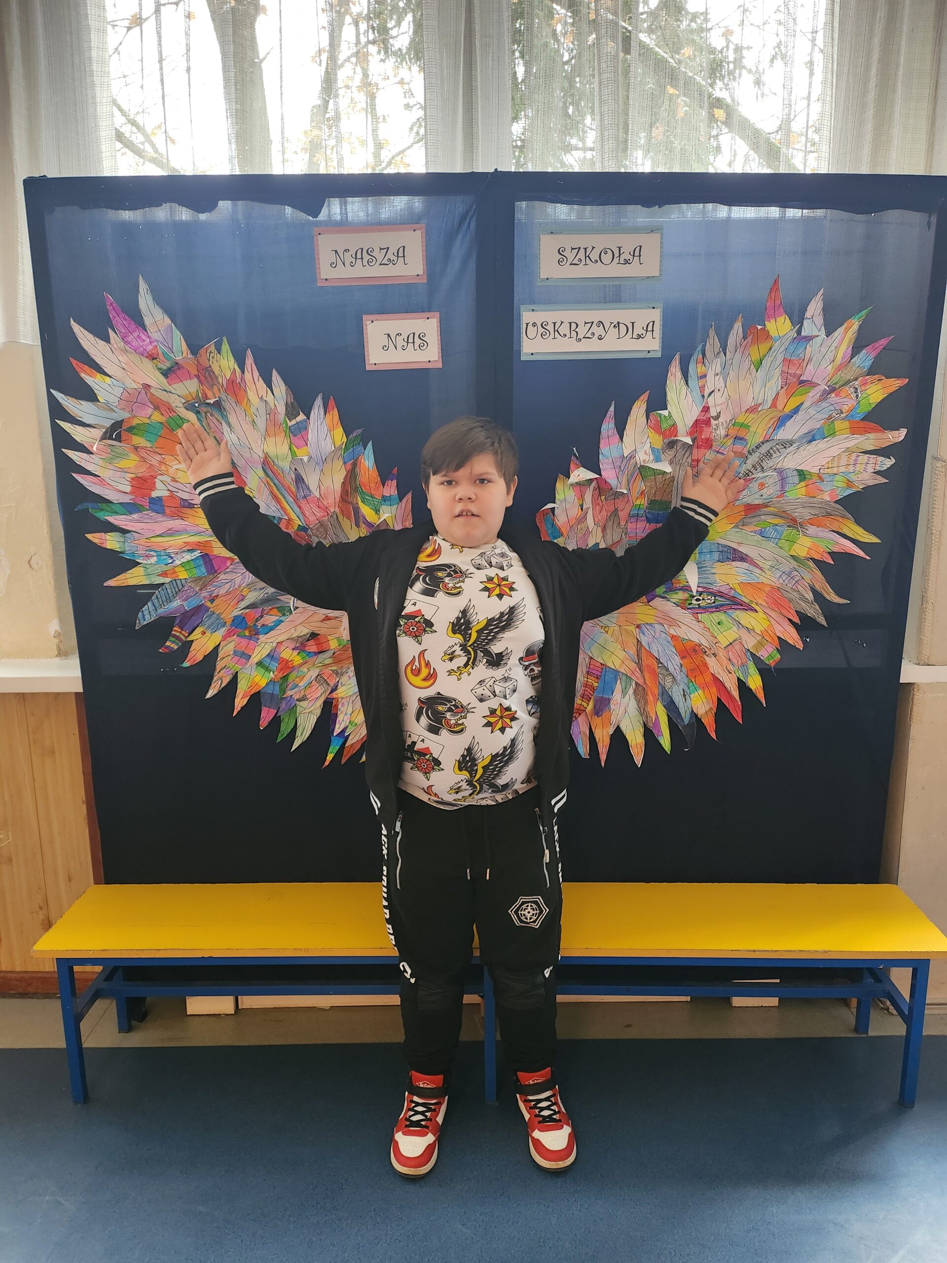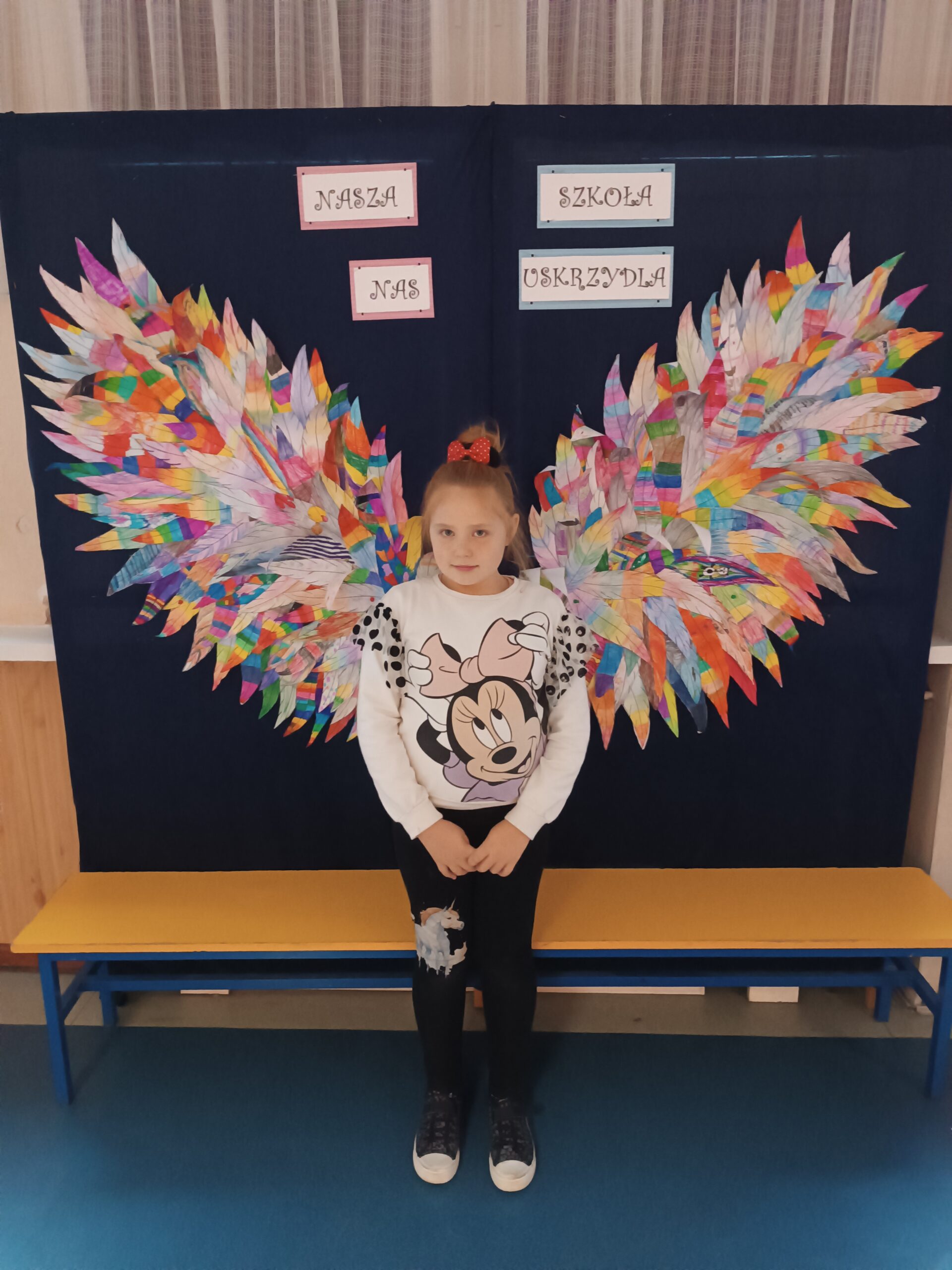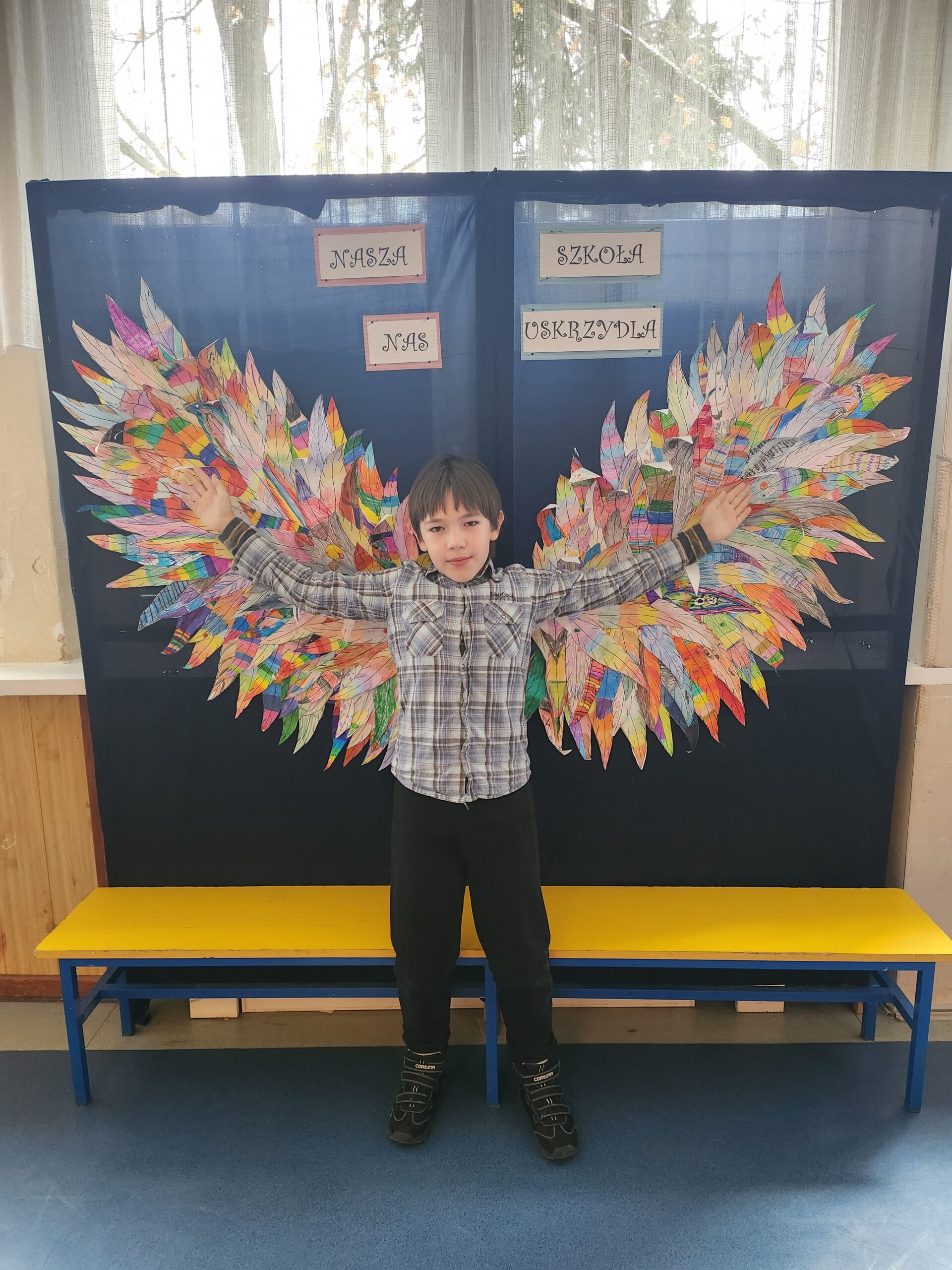 Ponadto dzieci z klas 1 – 3, wykonały wspólne dzieło pt. „Nasza Szkoła Nas Uskrzydla”. Powstała instalacja ozdobiła pierwsze piętro naszej szkoły, dając możliwość wykonania „uskrzydlających fotografii”.