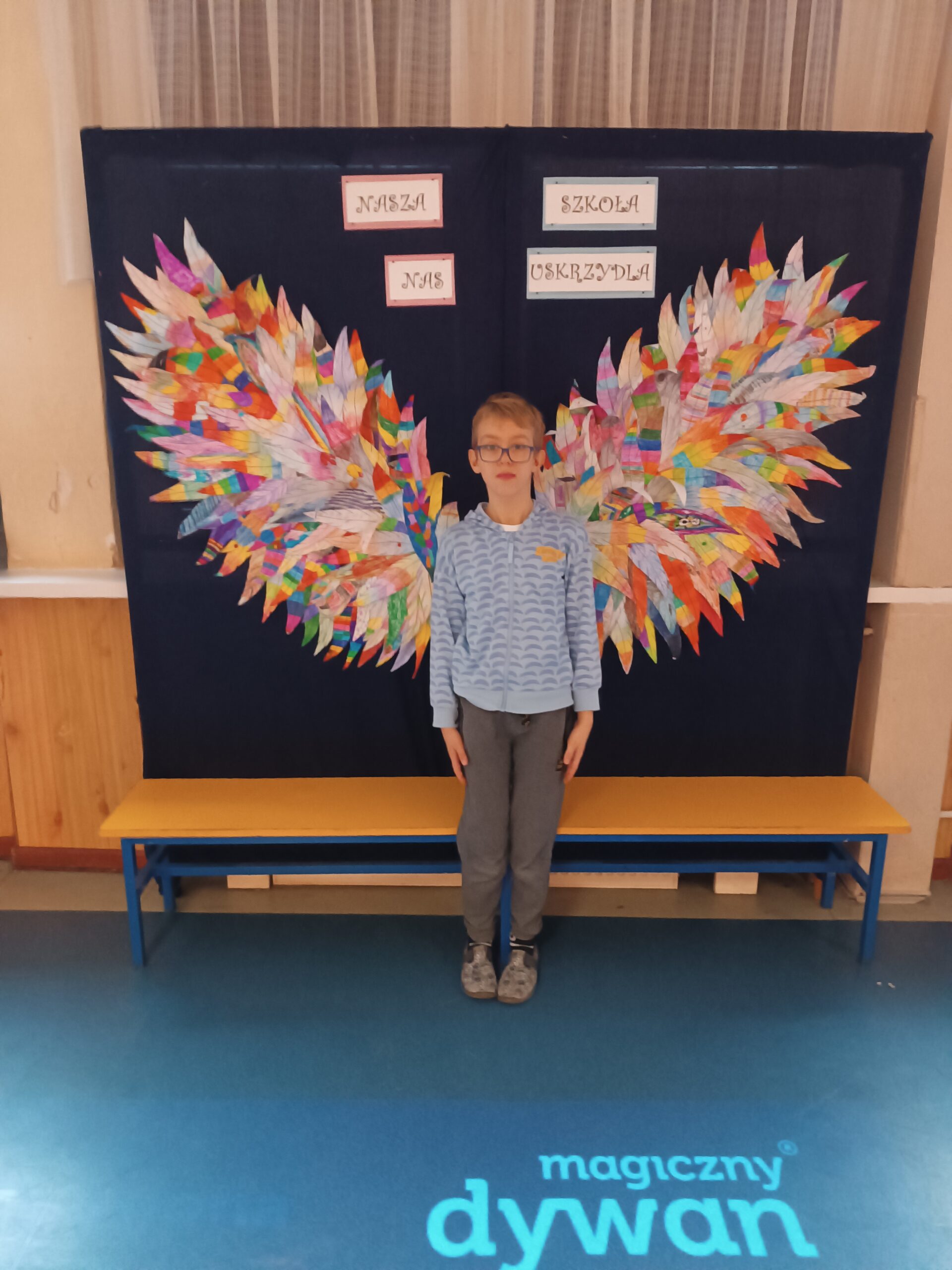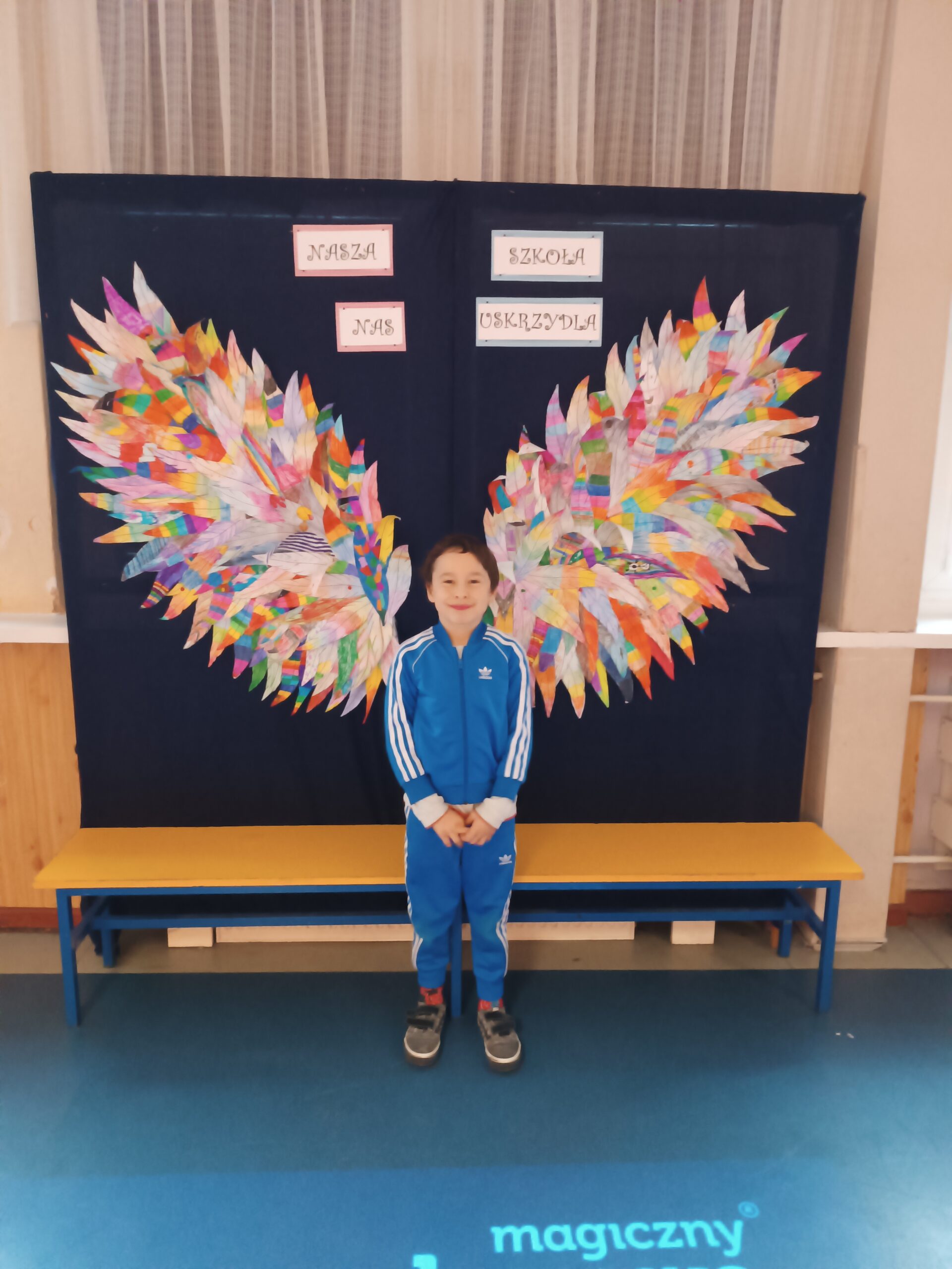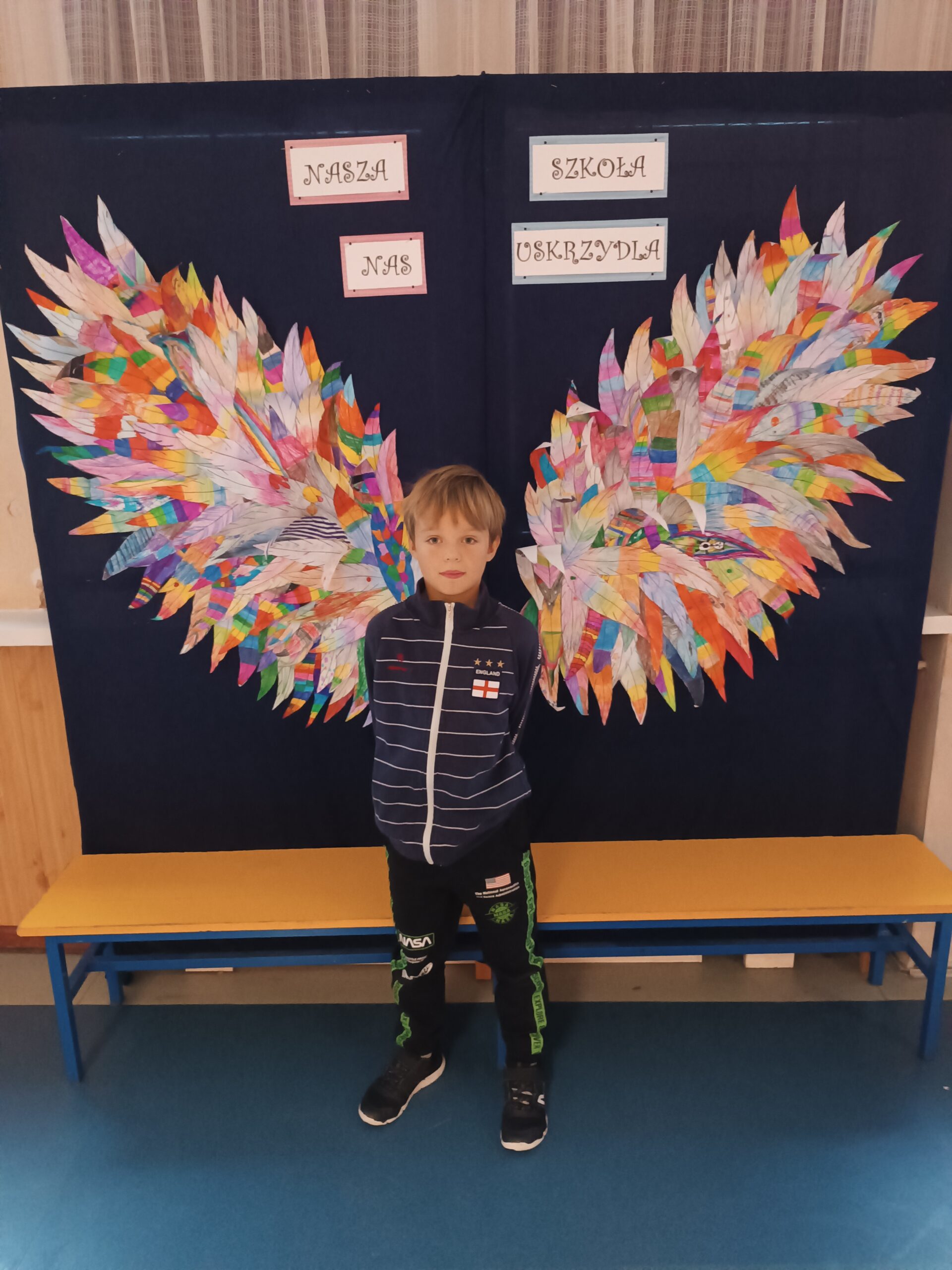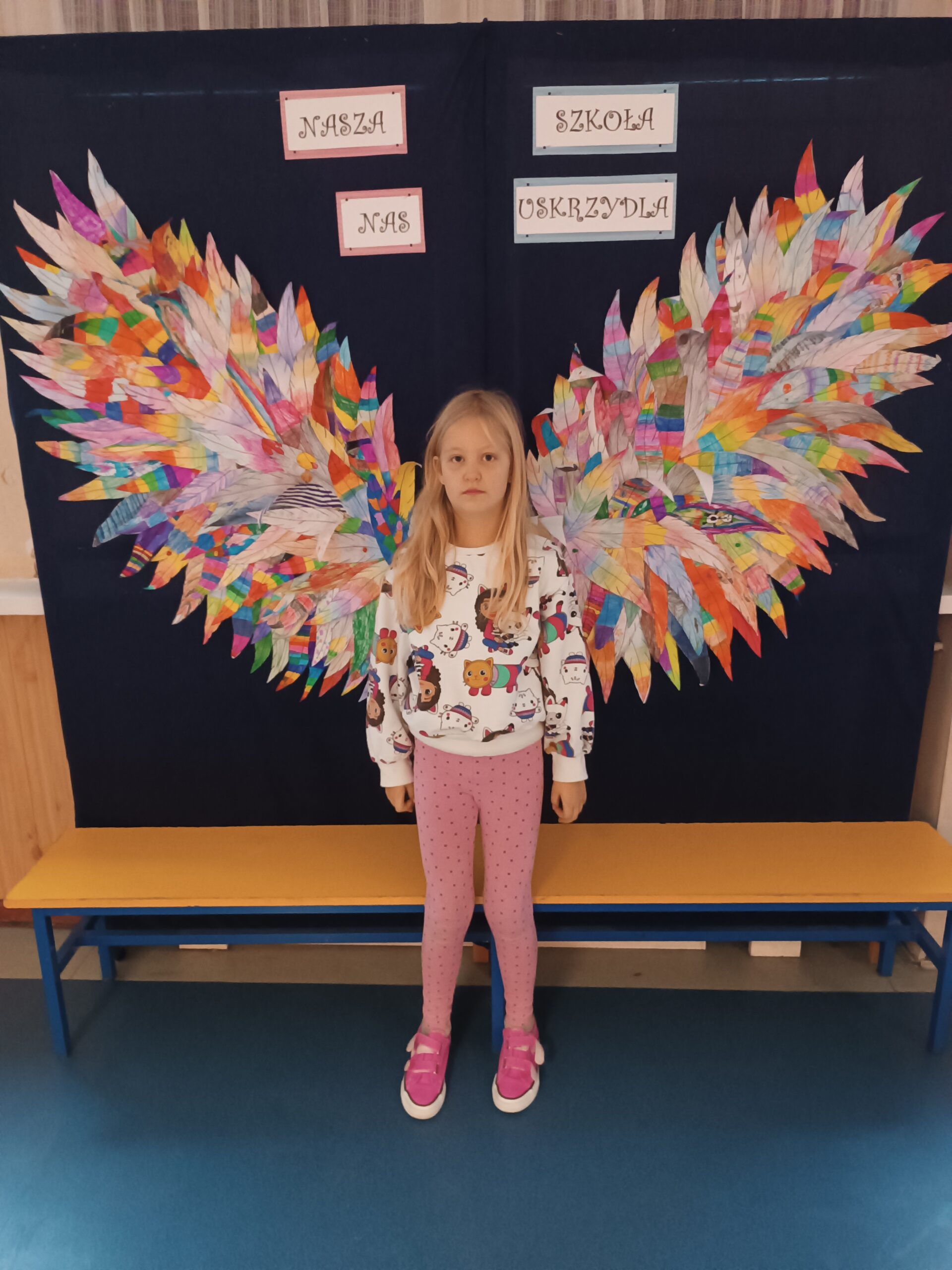 Ponadto dzieci z klas 1 – 3, wykonały wspólne dzieło pt. „Nasza Szkoła Nas Uskrzydla”. Powstała instalacja ozdobiła pierwsze piętro naszej szkoły, dając możliwość wykonania „uskrzydlających fotografii”.
