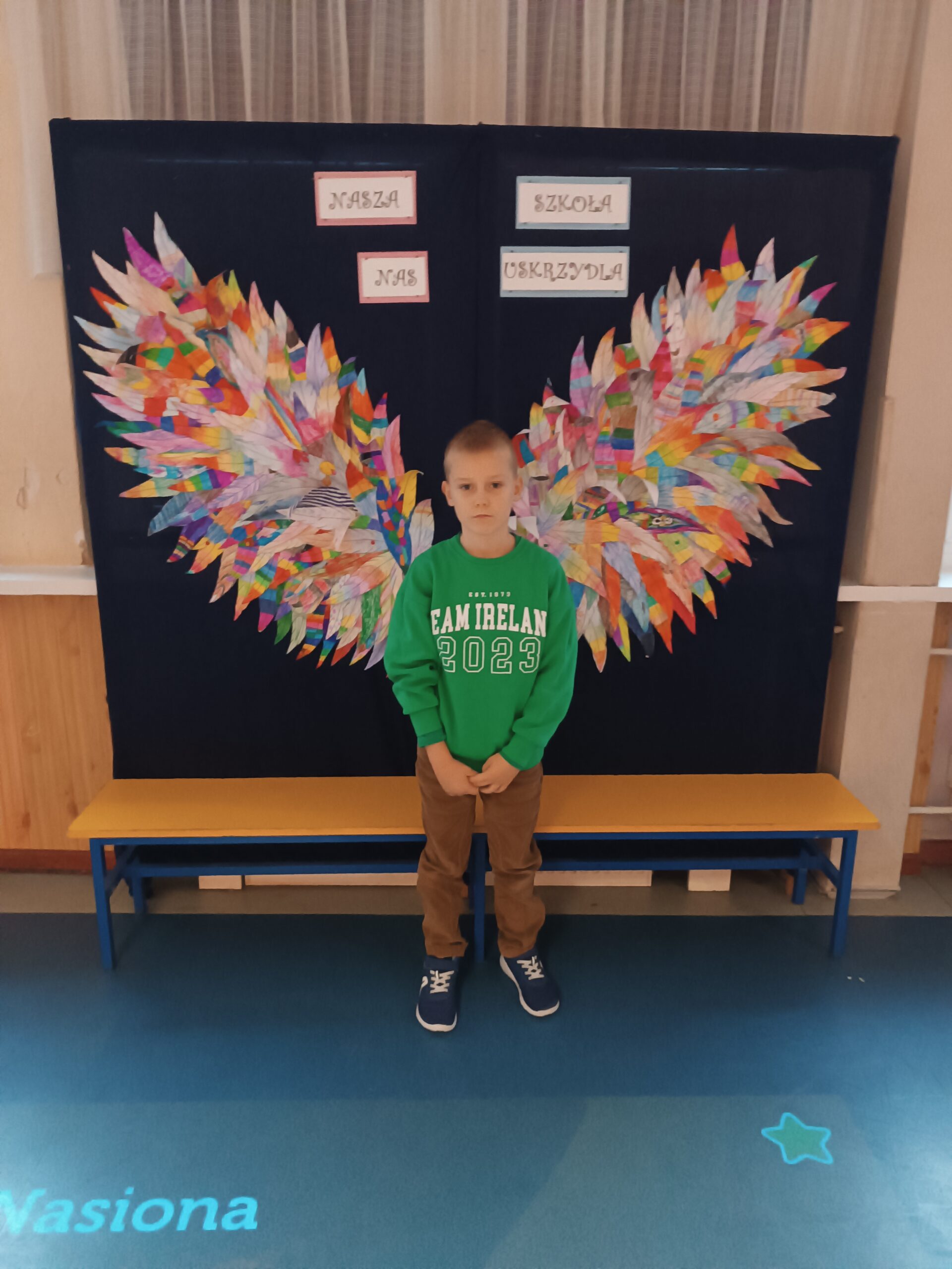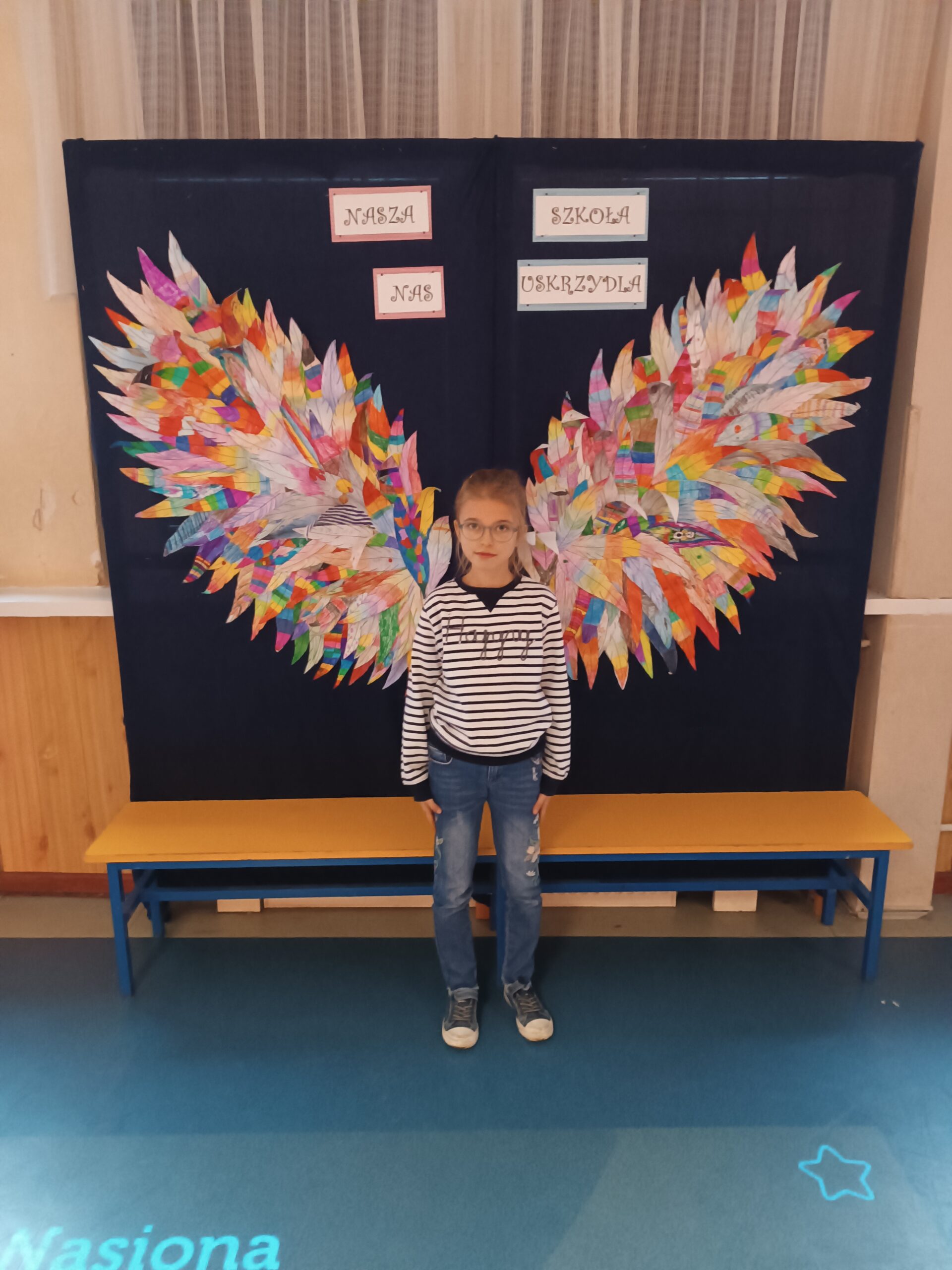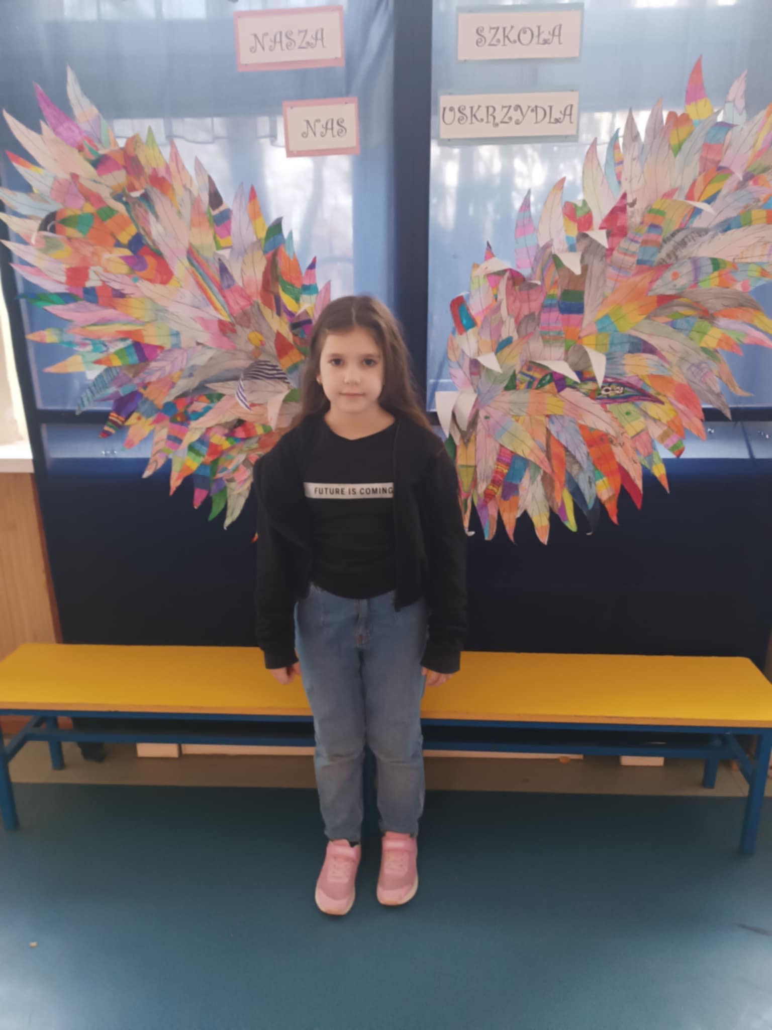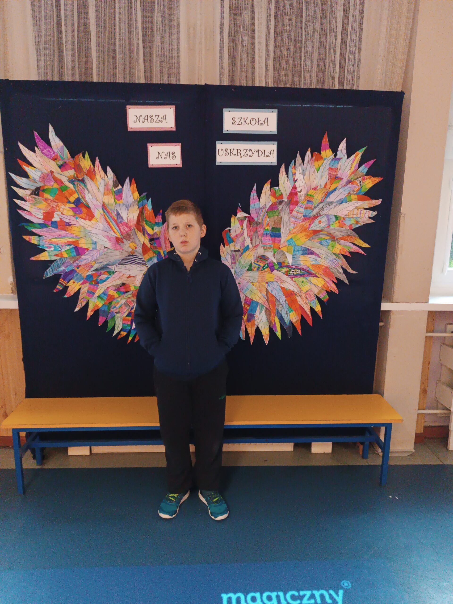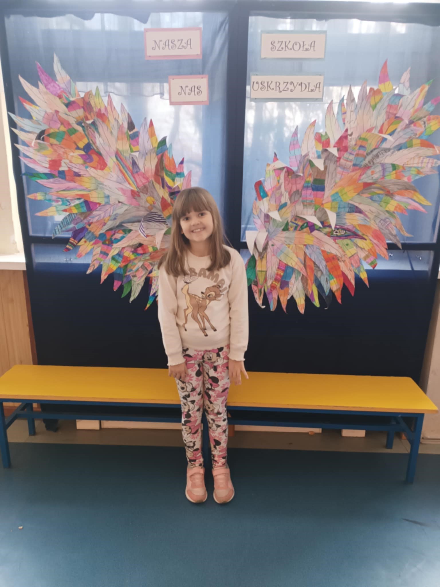 Ponadto dzieci z klas 1 – 3, wykonały wspólne dzieło pt. „Nasza Szkoła Nas Uskrzydla”. Powstała instalacja ozdobiła pierwsze piętro naszej szkoły, dając możliwość wykonania „uskrzydlających fotografii”.