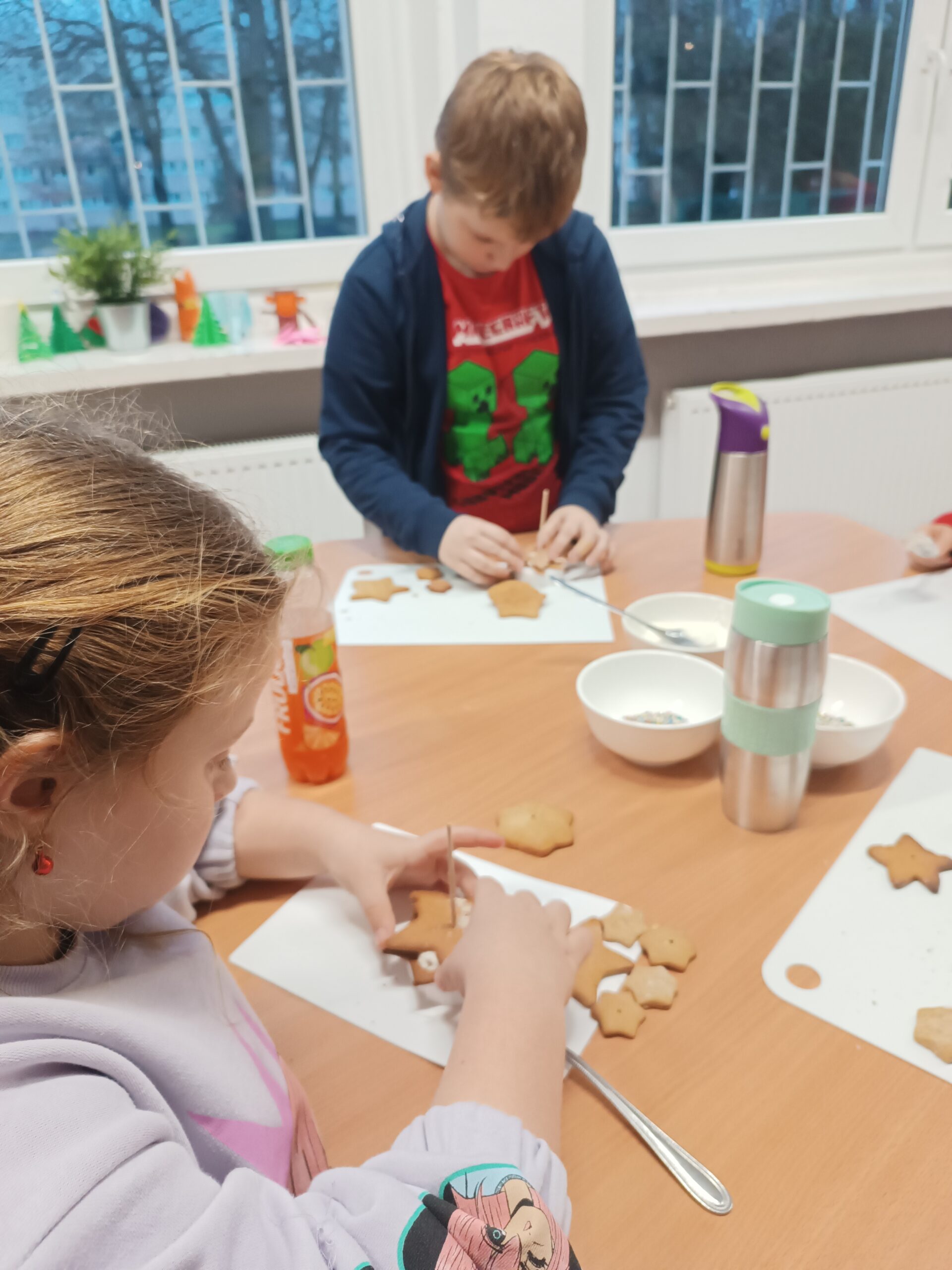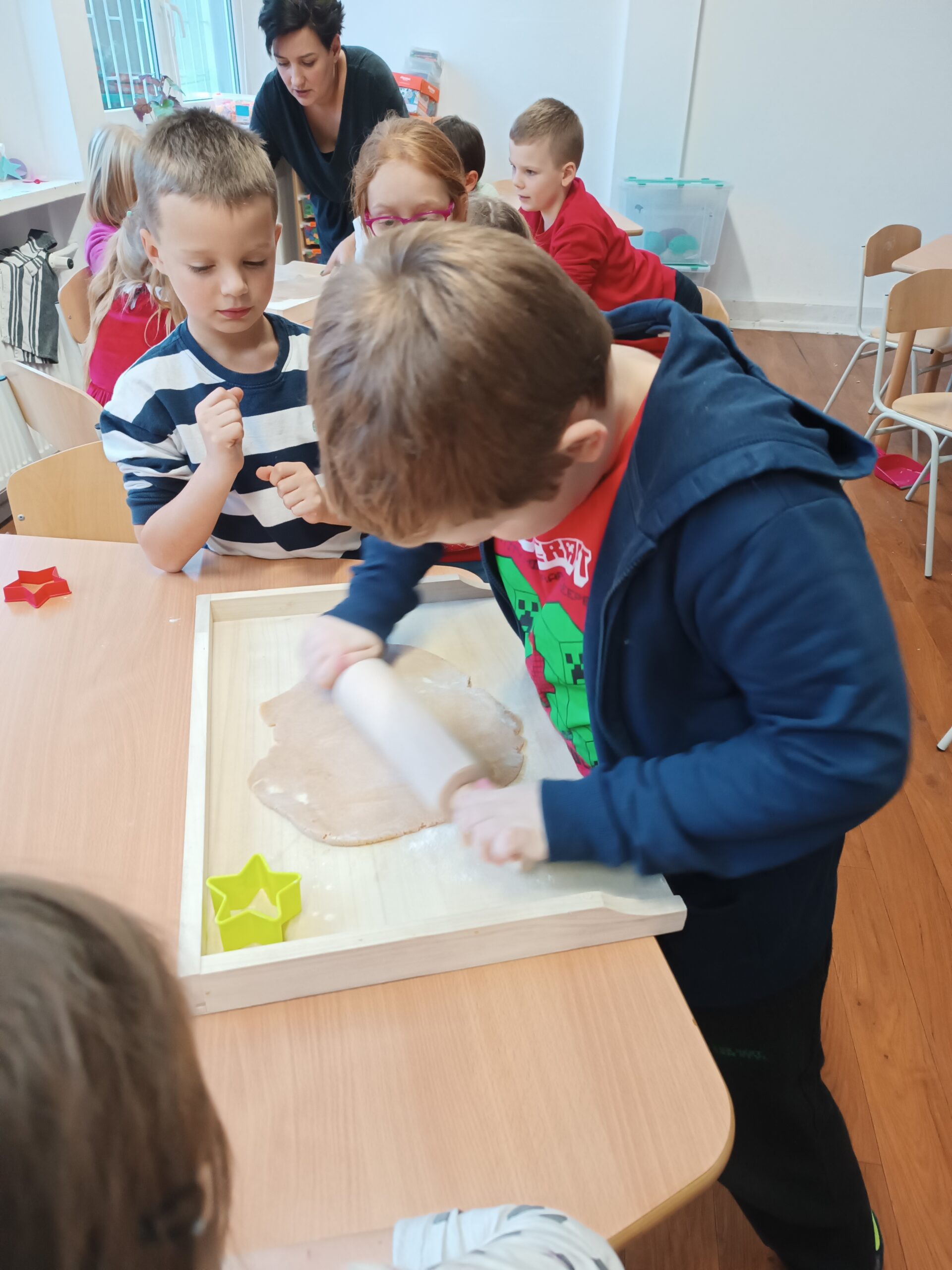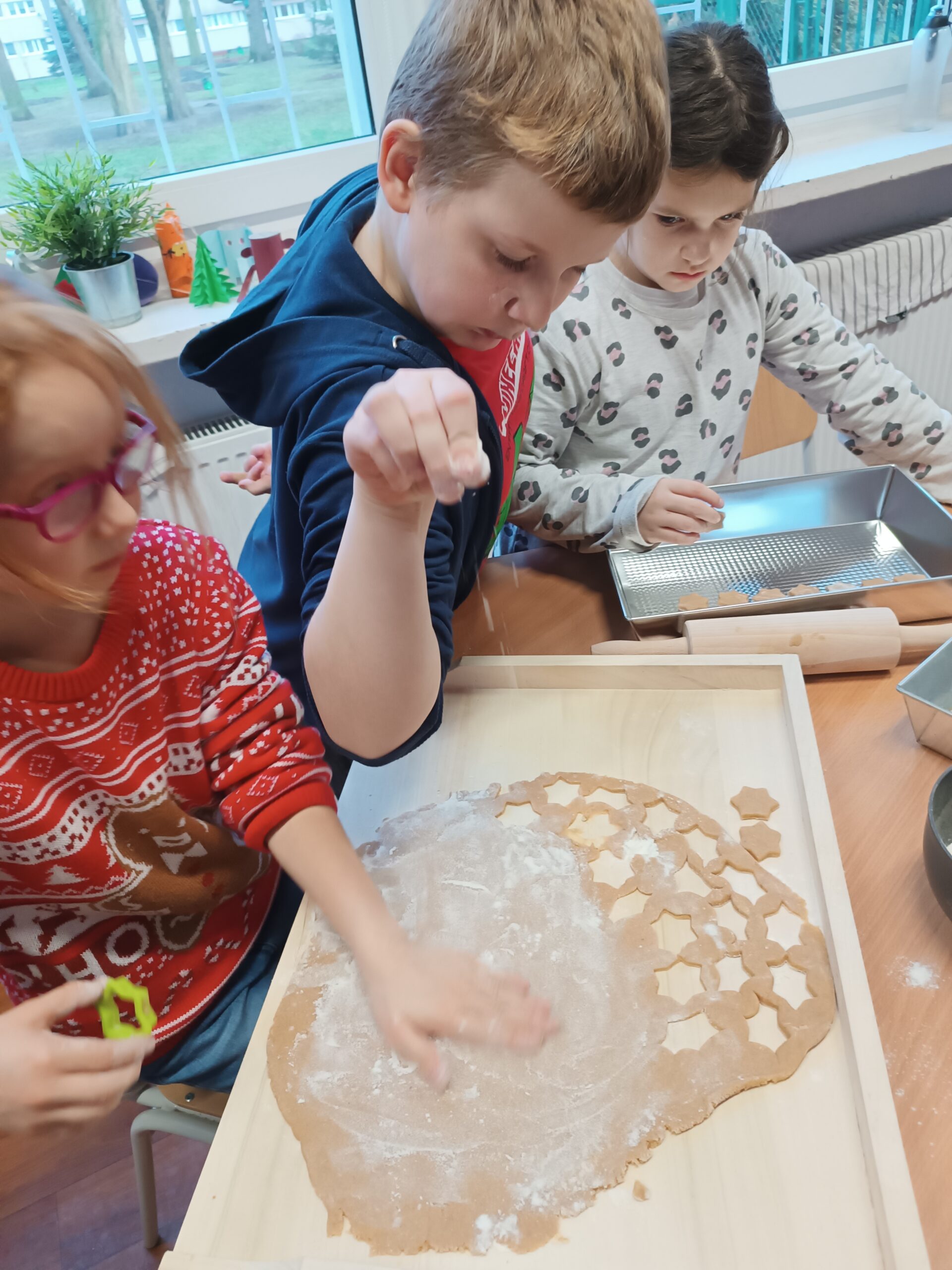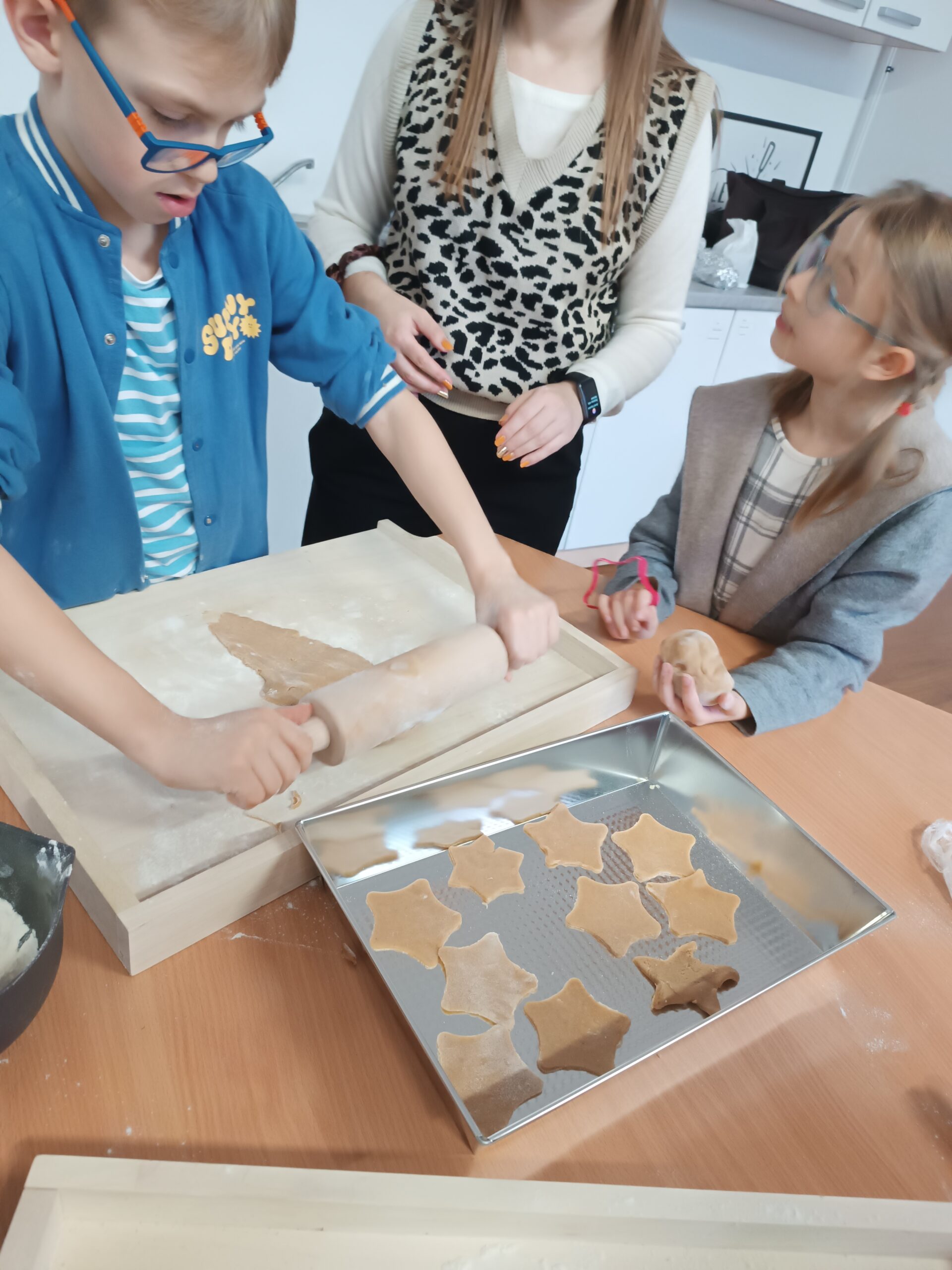 Tego dnia czekała na uczniów jeszcze jedna wyjątkowa niespodzianka… Dzięki uprzejmości Pani Agnieszki ze Słodyczarni 2a odbyła warsztaty cukiernicze. Dzieci wspólnie z Panią wykonały piernikowe choinki. Przygotowały ciasto, wykroiły pierniczki, które następnie po upieczeniu dekorowały i uformowały w kształt choinek.