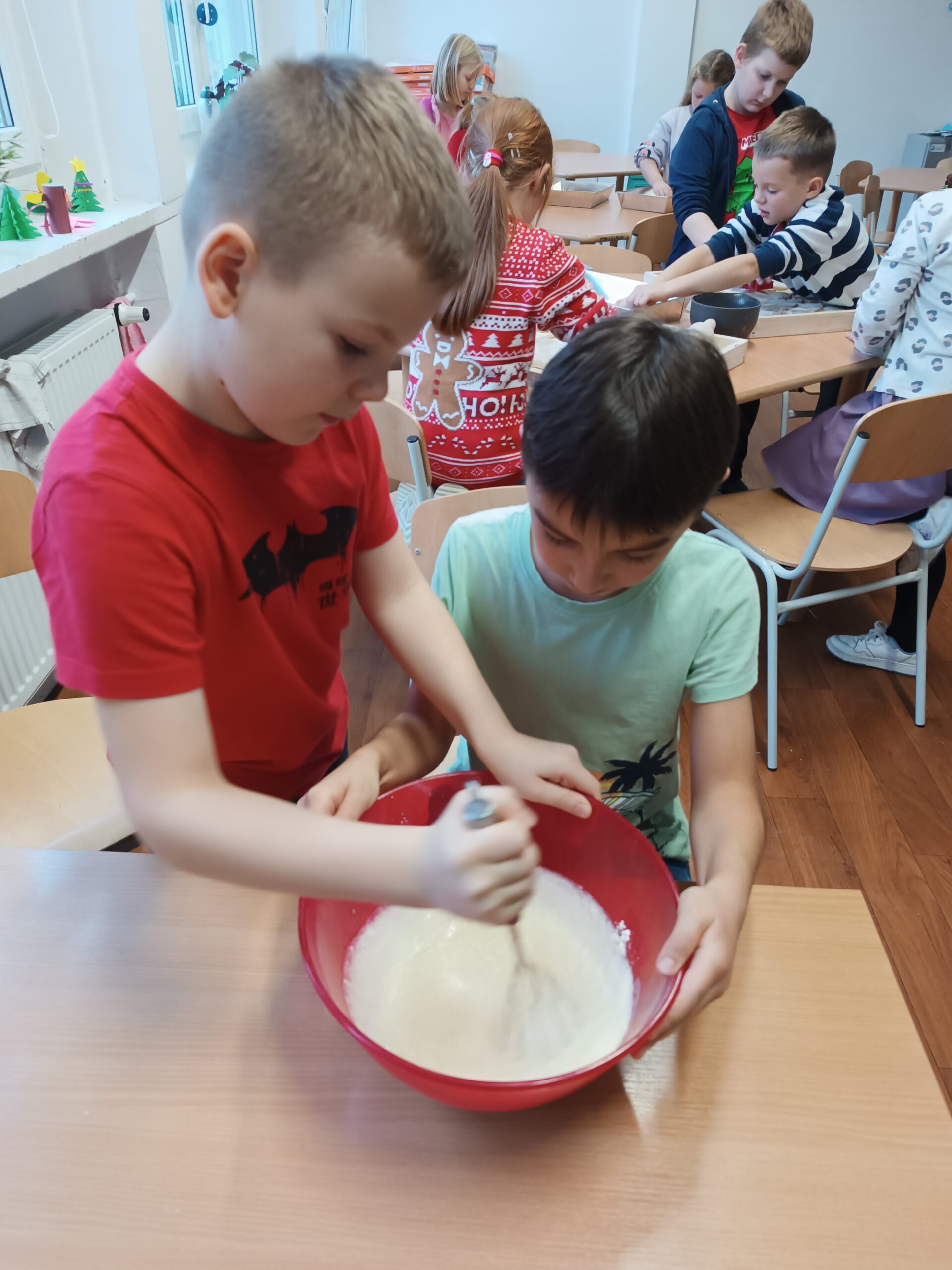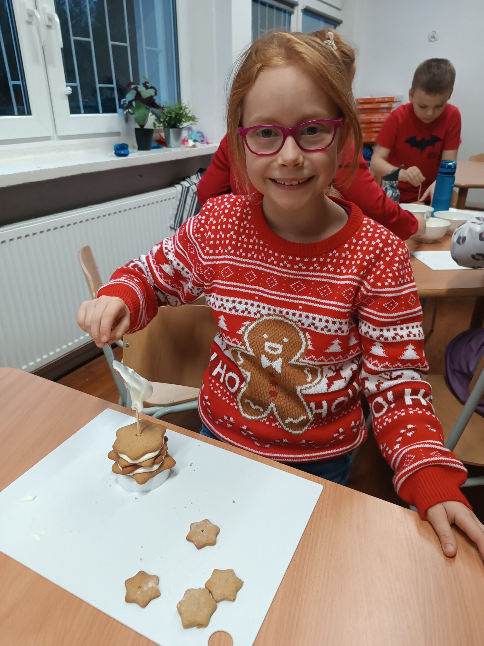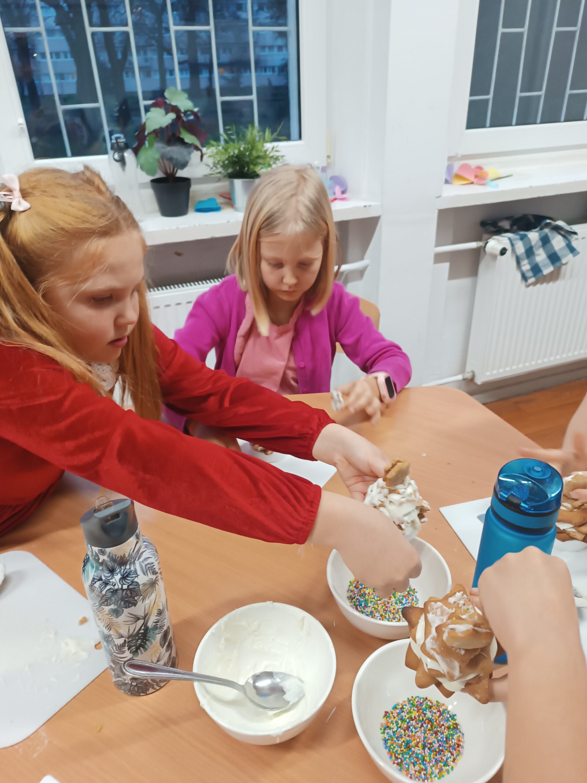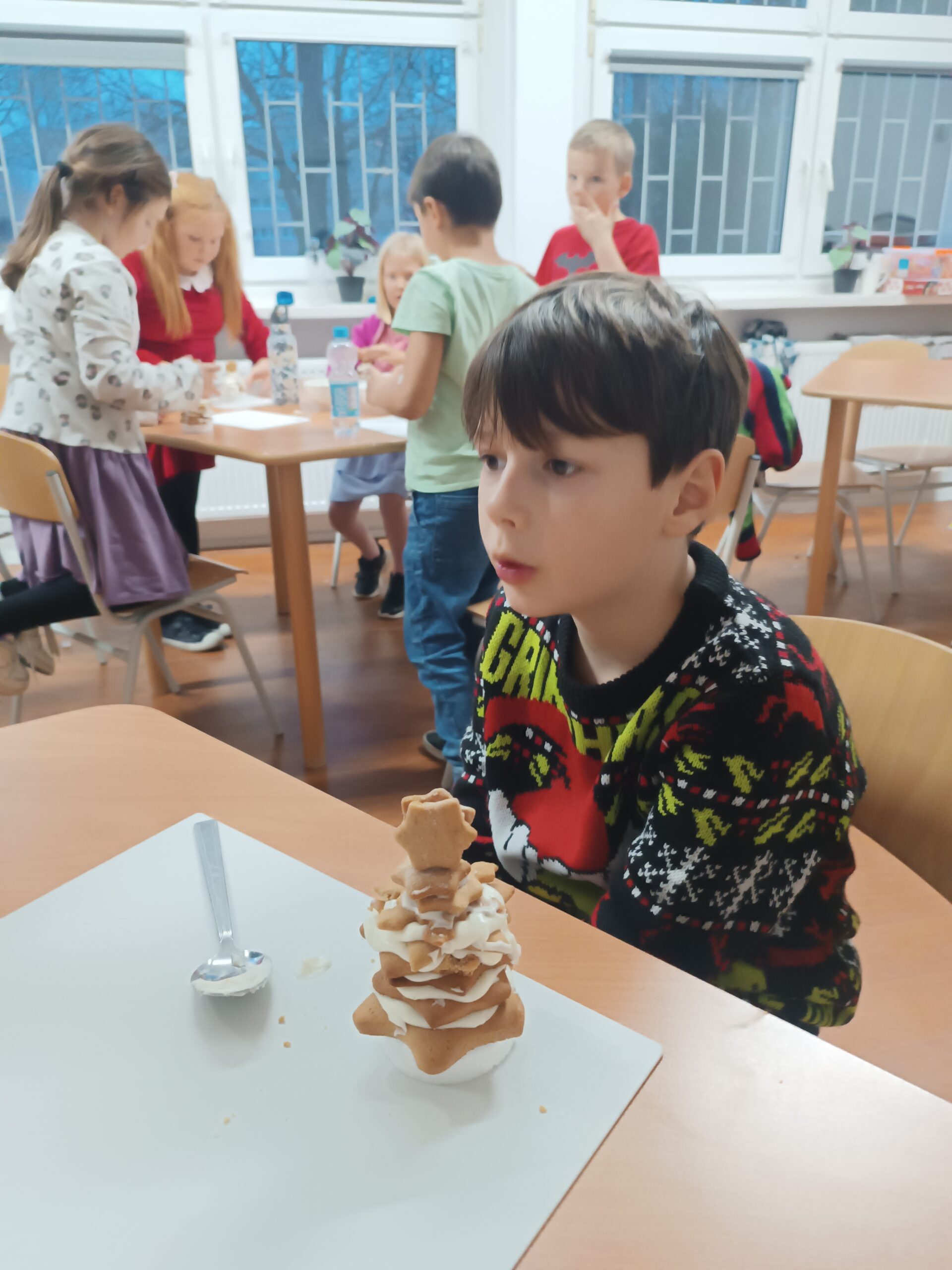 Tego dnia czekała na uczniów jeszcze jedna wyjątkowa niespodzianka… Dzięki uprzejmości Pani Agnieszki ze Słodyczarni 2a odbyła warsztaty cukiernicze. Dzieci wspólnie z Panią wykonały piernikowe choinki. Przygotowały ciasto, wykroiły pierniczki, które następnie po upieczeniu dekorowały i uformowały w kształt choinek.