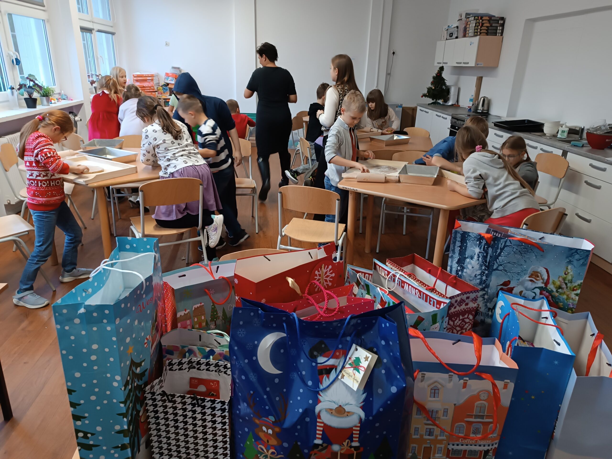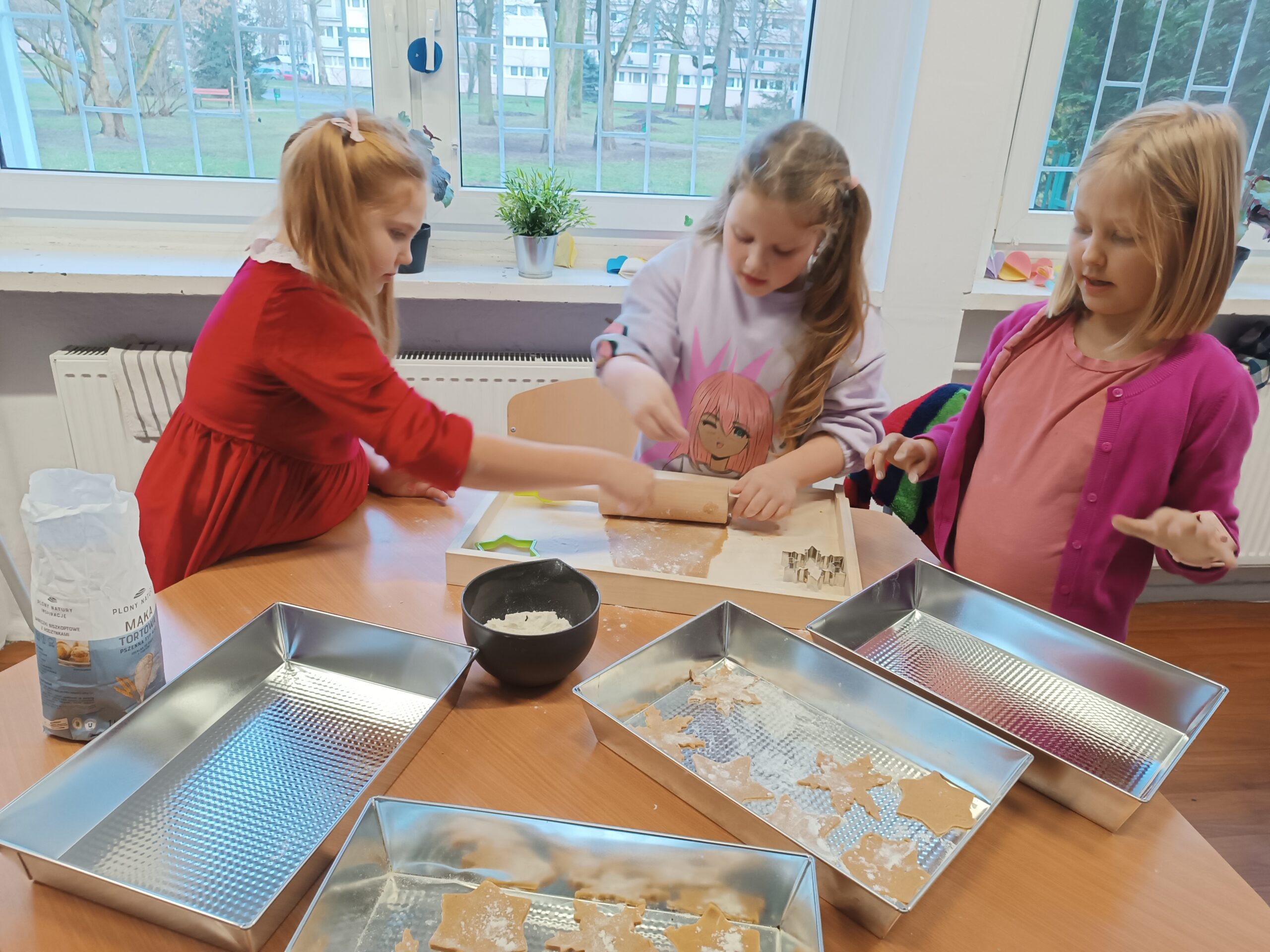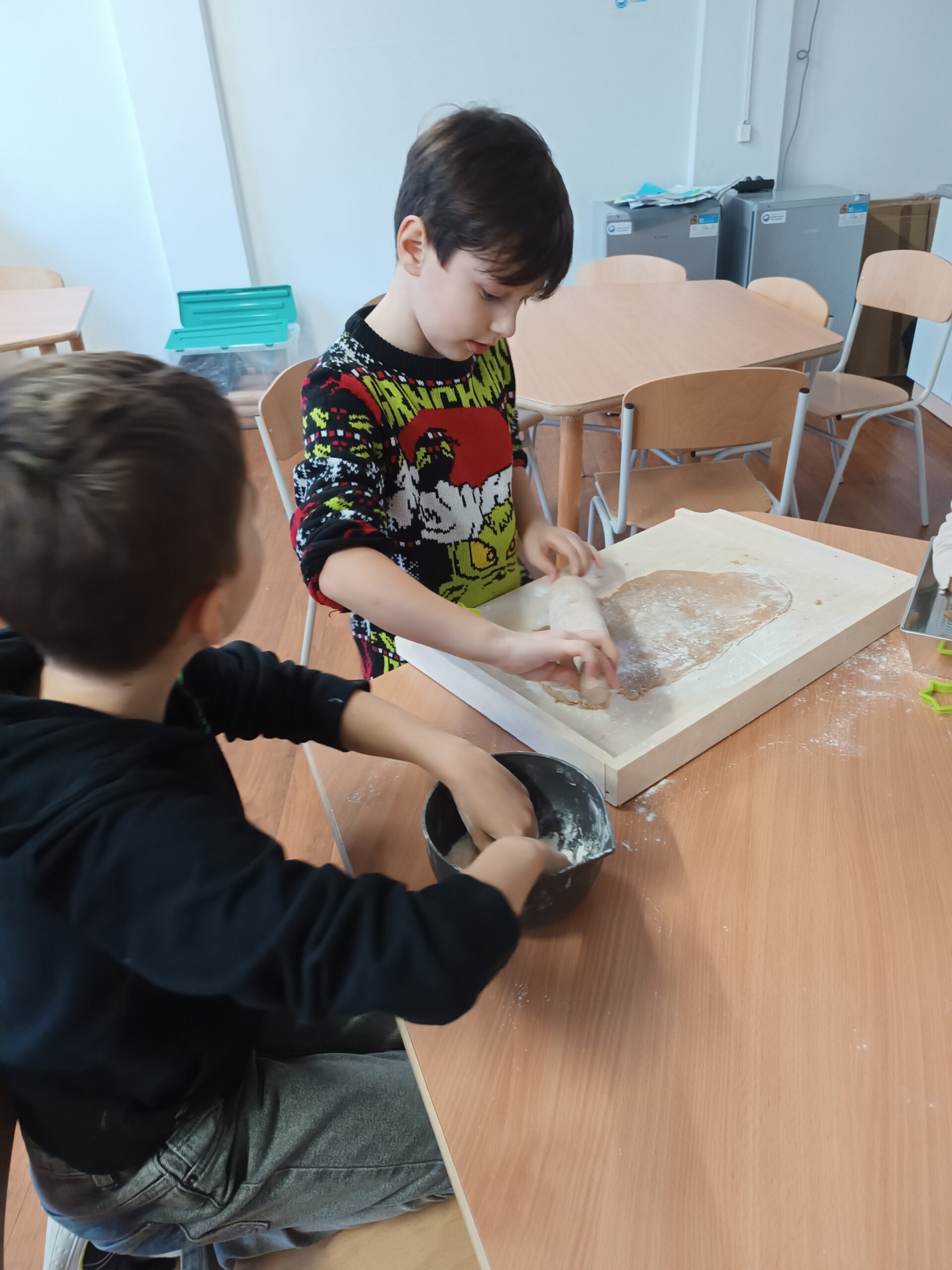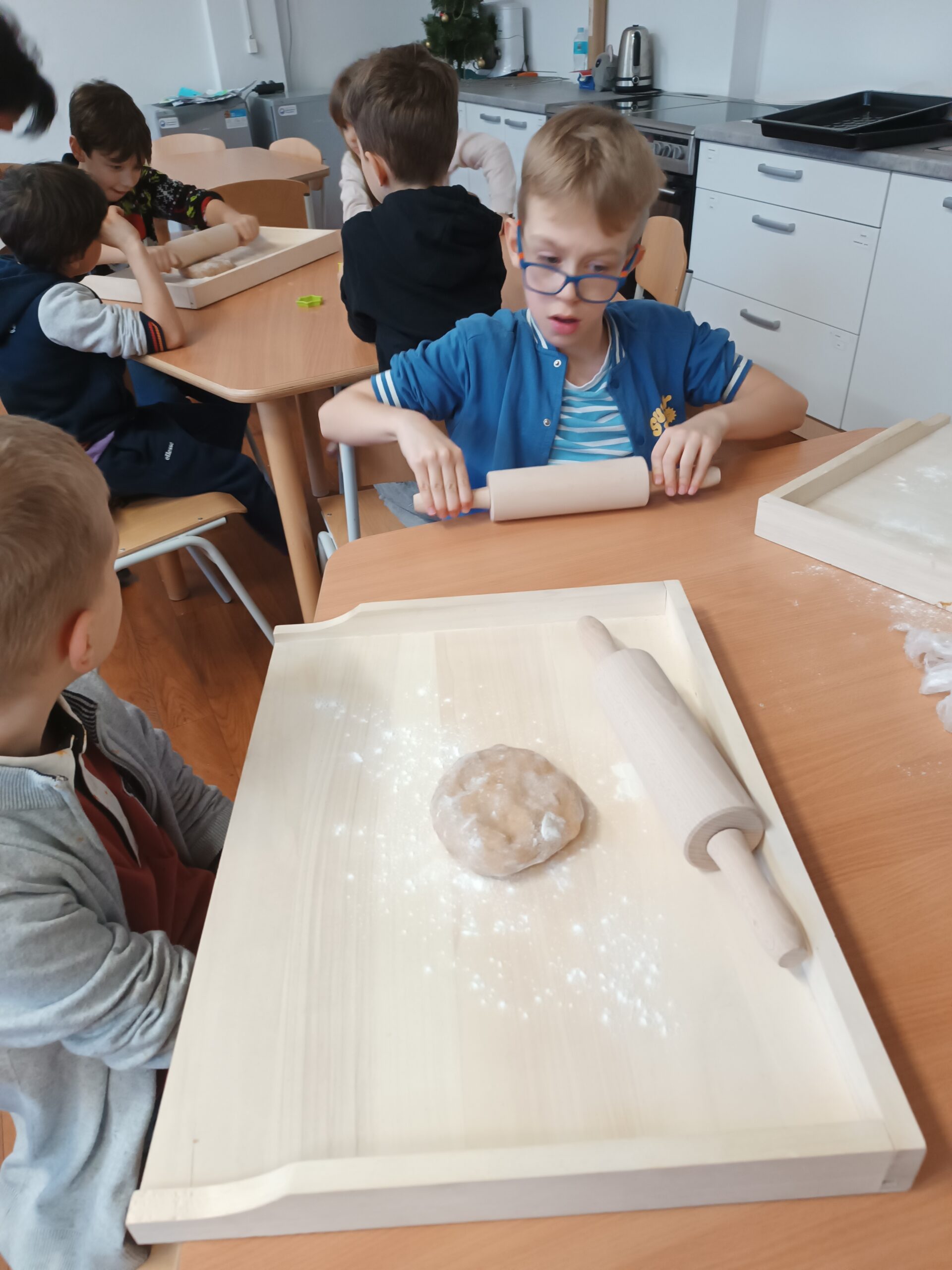 Tego dnia czekała na uczniów jeszcze jedna wyjątkowa niespodzianka… Dzięki uprzejmości Pani Agnieszki ze Słodyczarni 2a odbyła warsztaty cukiernicze. Dzieci wspólnie z Panią wykonały piernikowe choinki. Przygotowały ciasto, wykroiły pierniczki, które następnie po upieczeniu dekorowały i uformowały w kształt choinek.