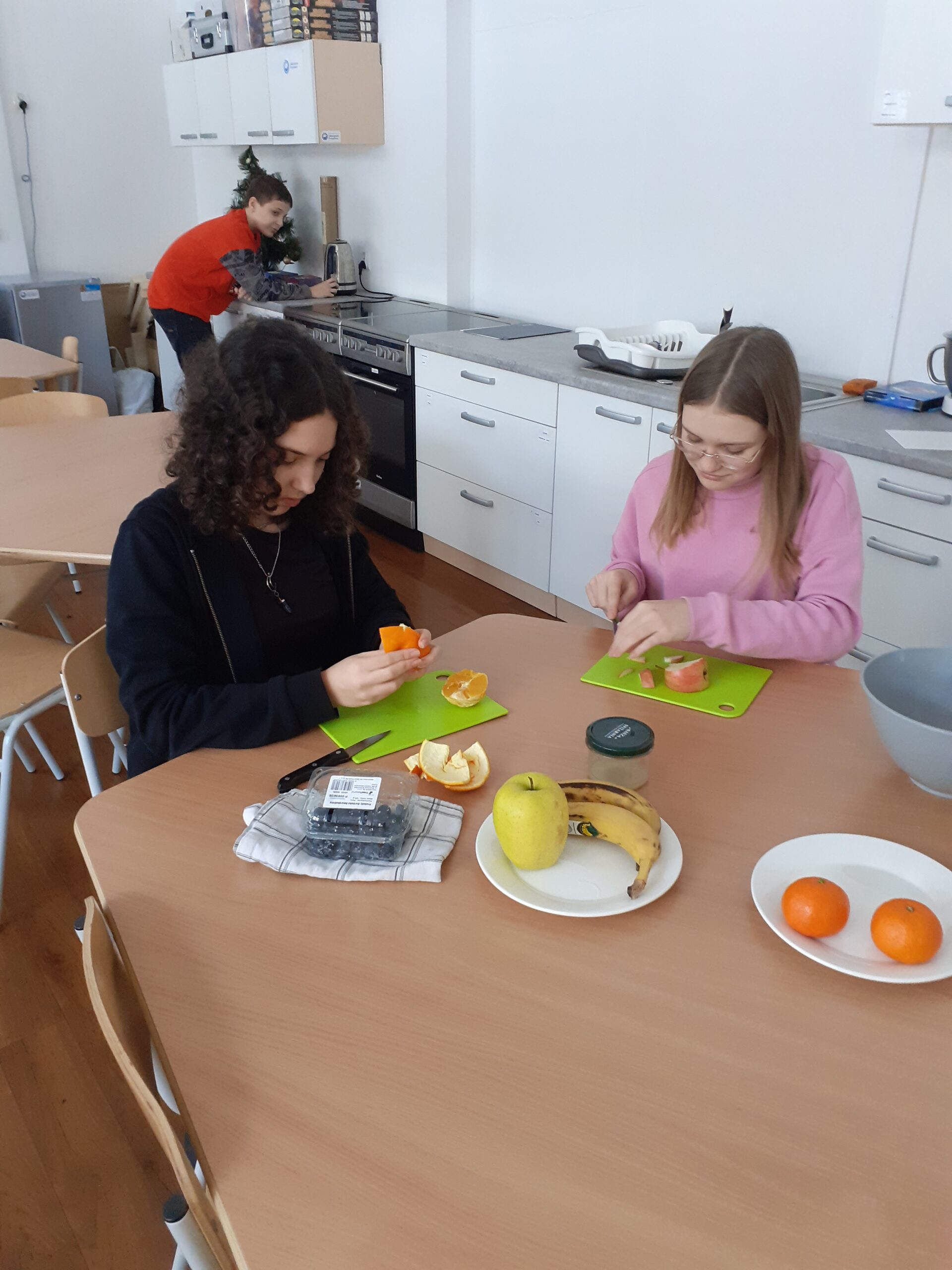 Następnie uczennice umyły, obrały i pokroiły owoce oraz wymieszały je w misce z dodatkiem soku z cytryny.