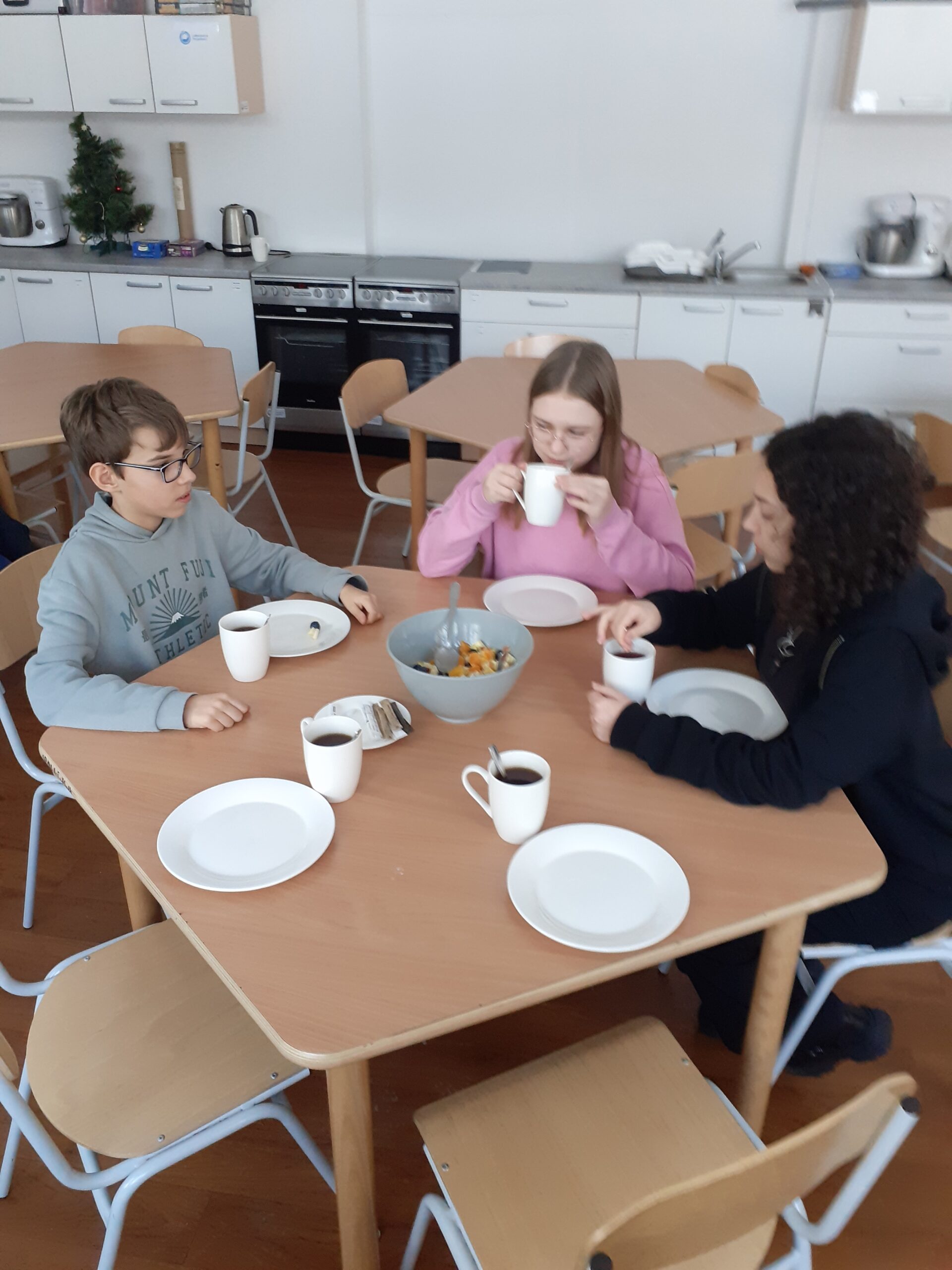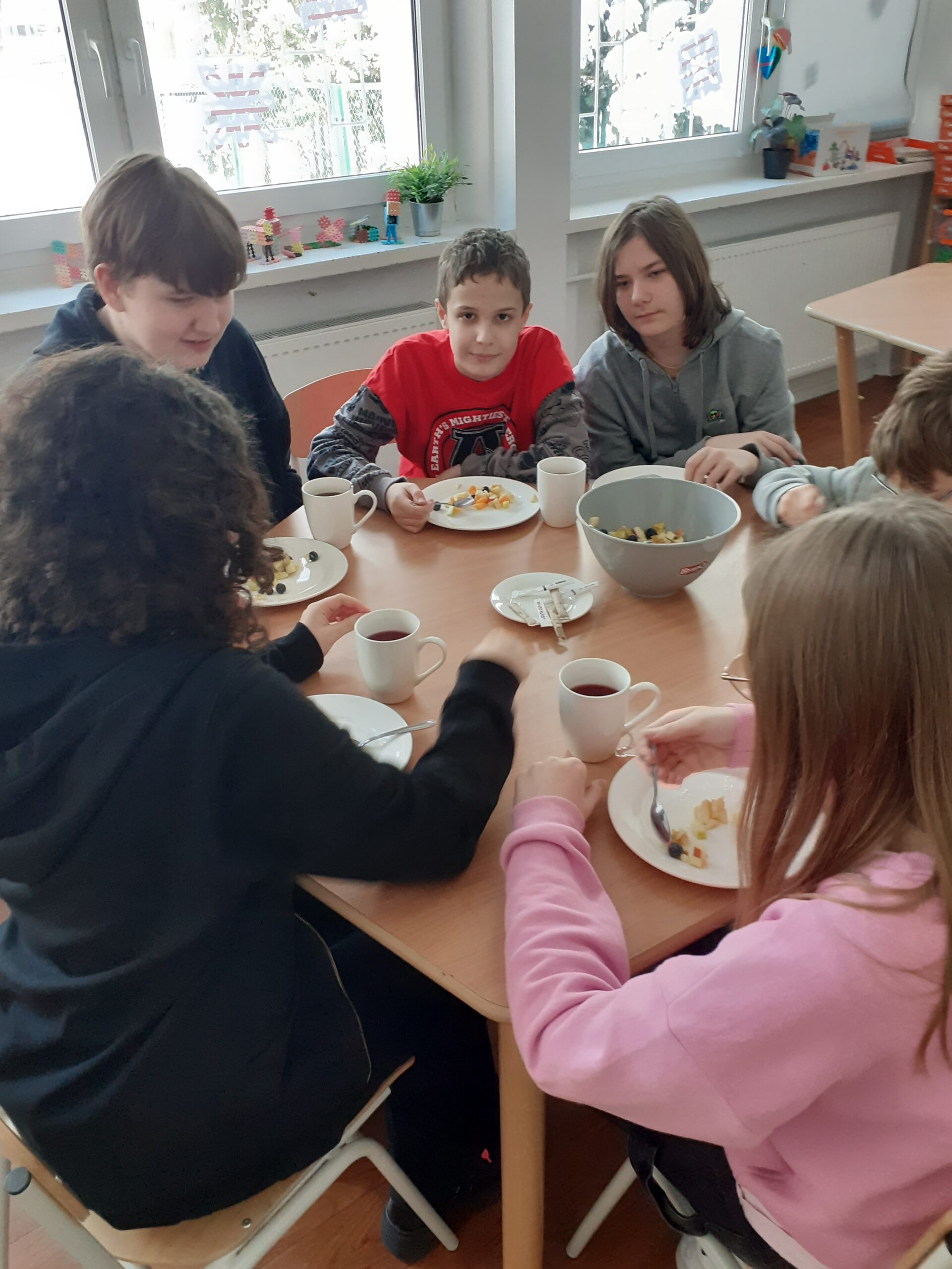 Na koniec uczniowie zasiedli do stołu i skosztowali zaserwowaną sałatkę i herbatkę. Wizyta w Kuchcikowie sprawiła im wiele radości.