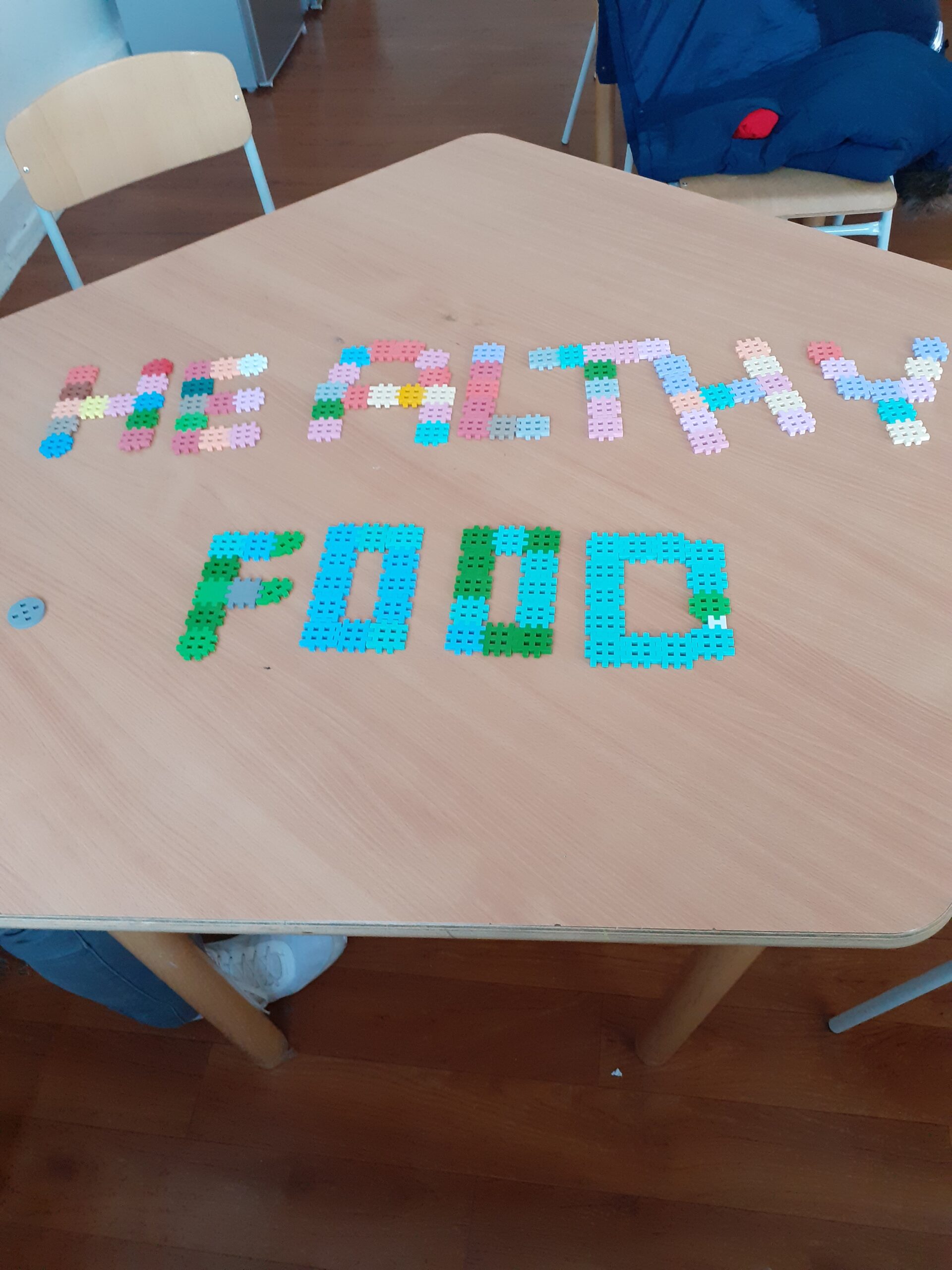 W czasie oczekiwania na degustację sałatki owocowej pozostali uczniowie układali z puzzli napis w języku angielskim. Był on tematycznie związany z lekcją dotyczącą zdrowego odżywiania.