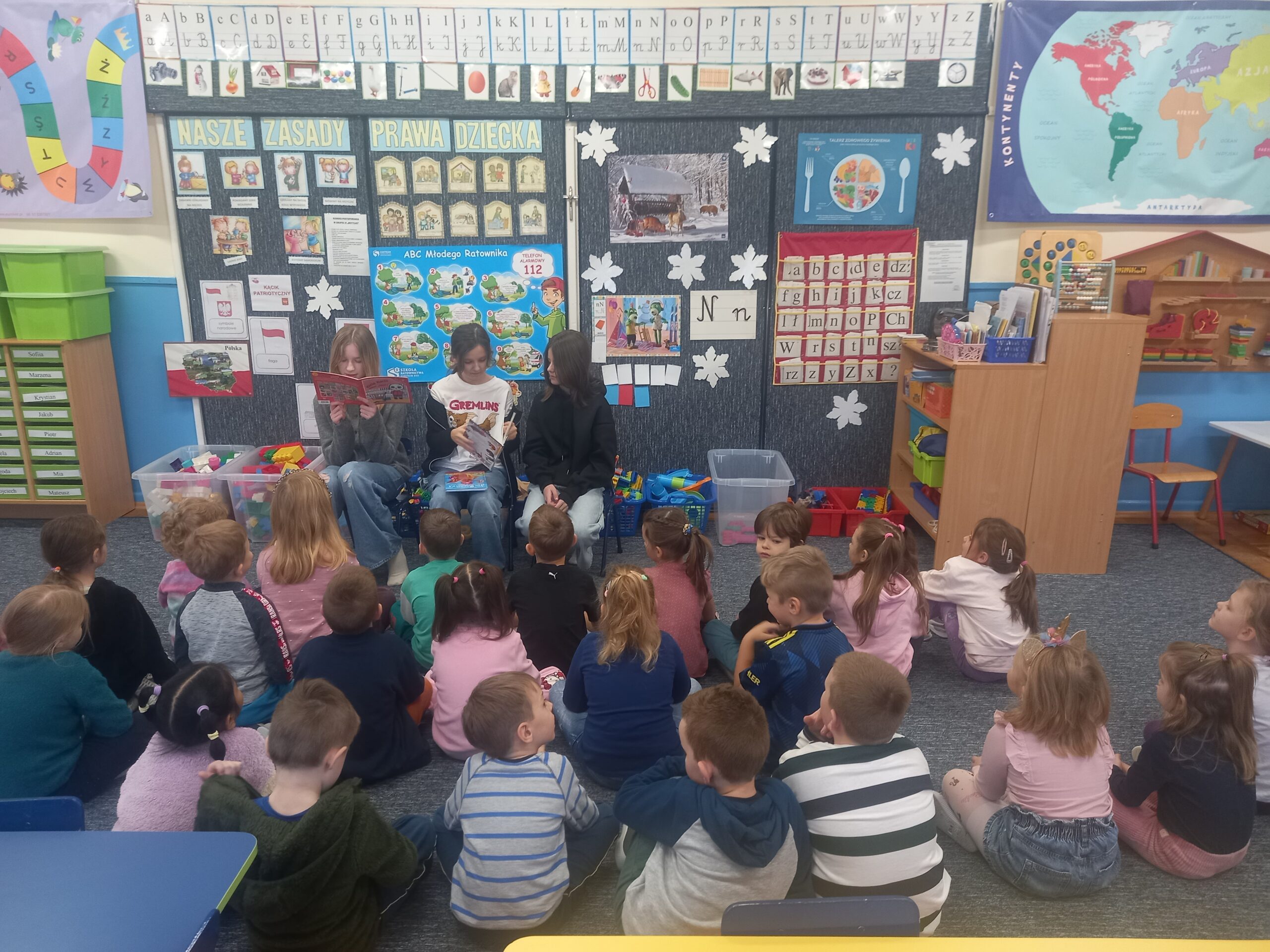 Uczniowie biorą udział w kampanii Cała Polska czyta dzieciom.
