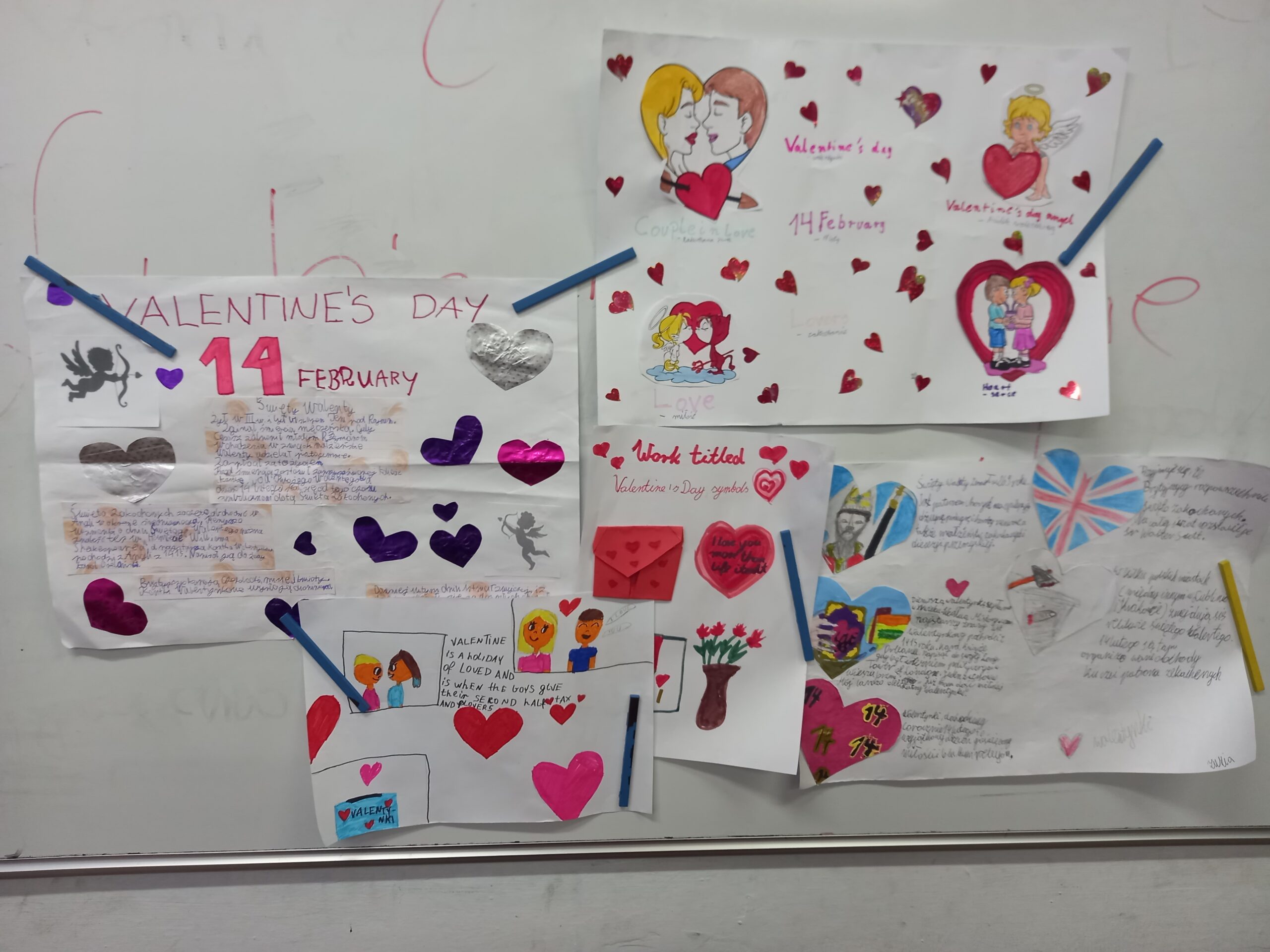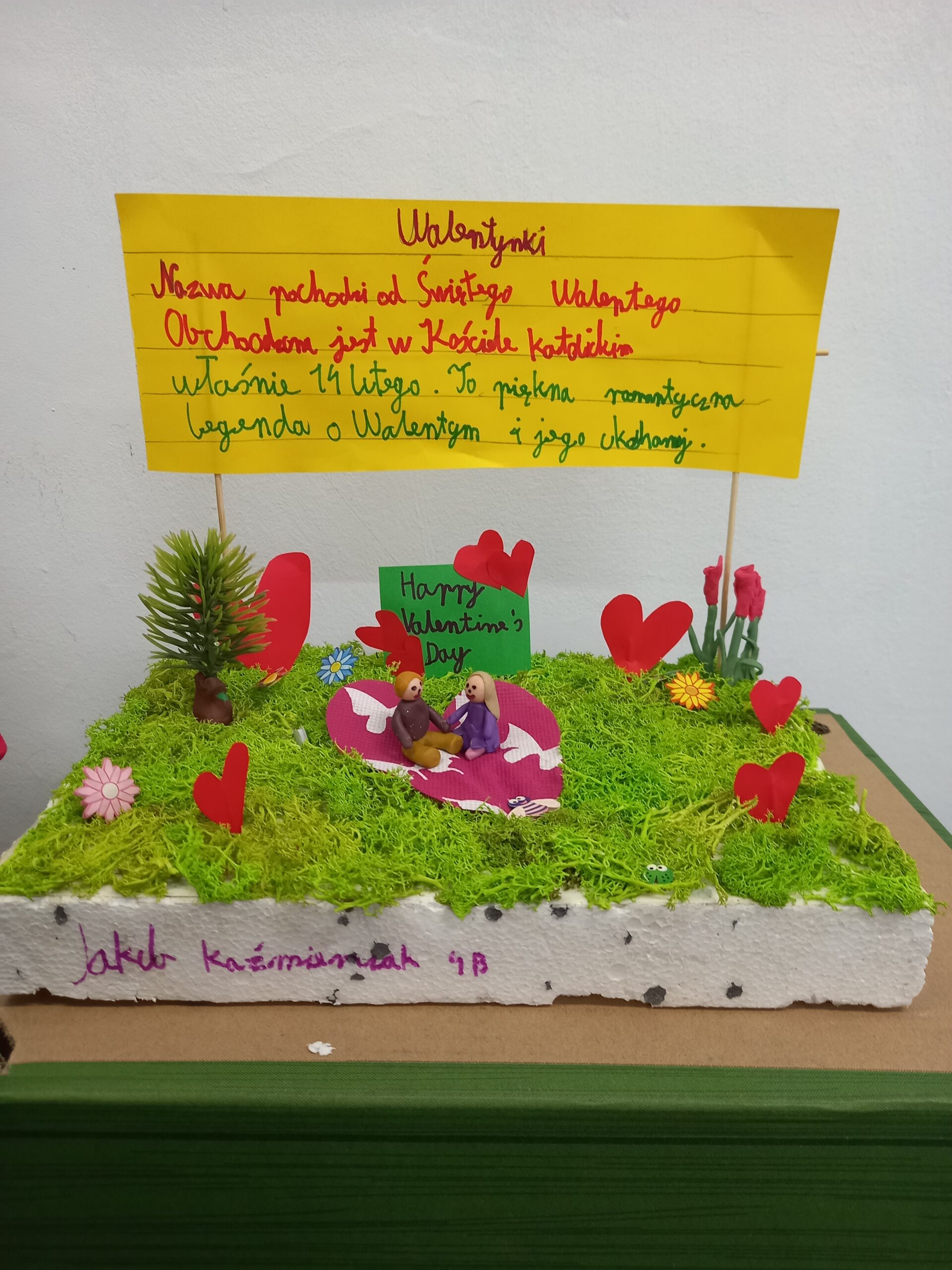Po obejrzeniu filmów uczniowie oglądali piękne plakaty, które odzwierciedlają symbolikę Święta Walentego. Wśród prac wyróżniała się makieta Kuby, która ilustrowała motyw serca – symbolu miłości.