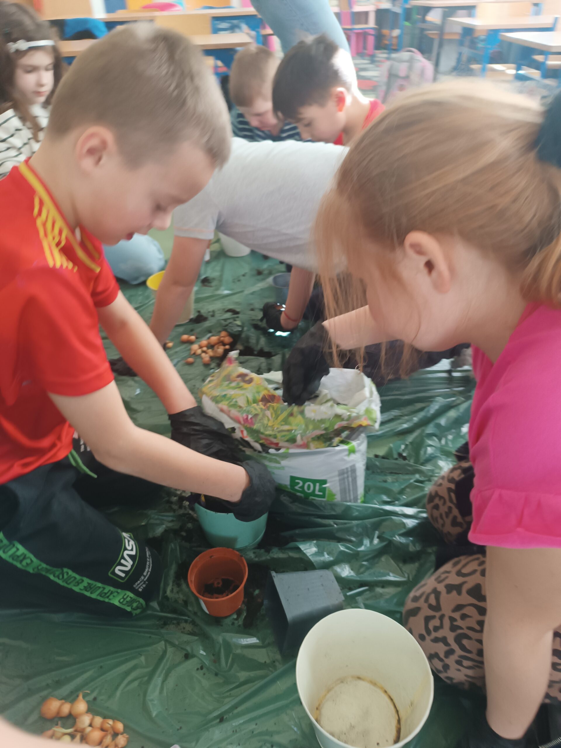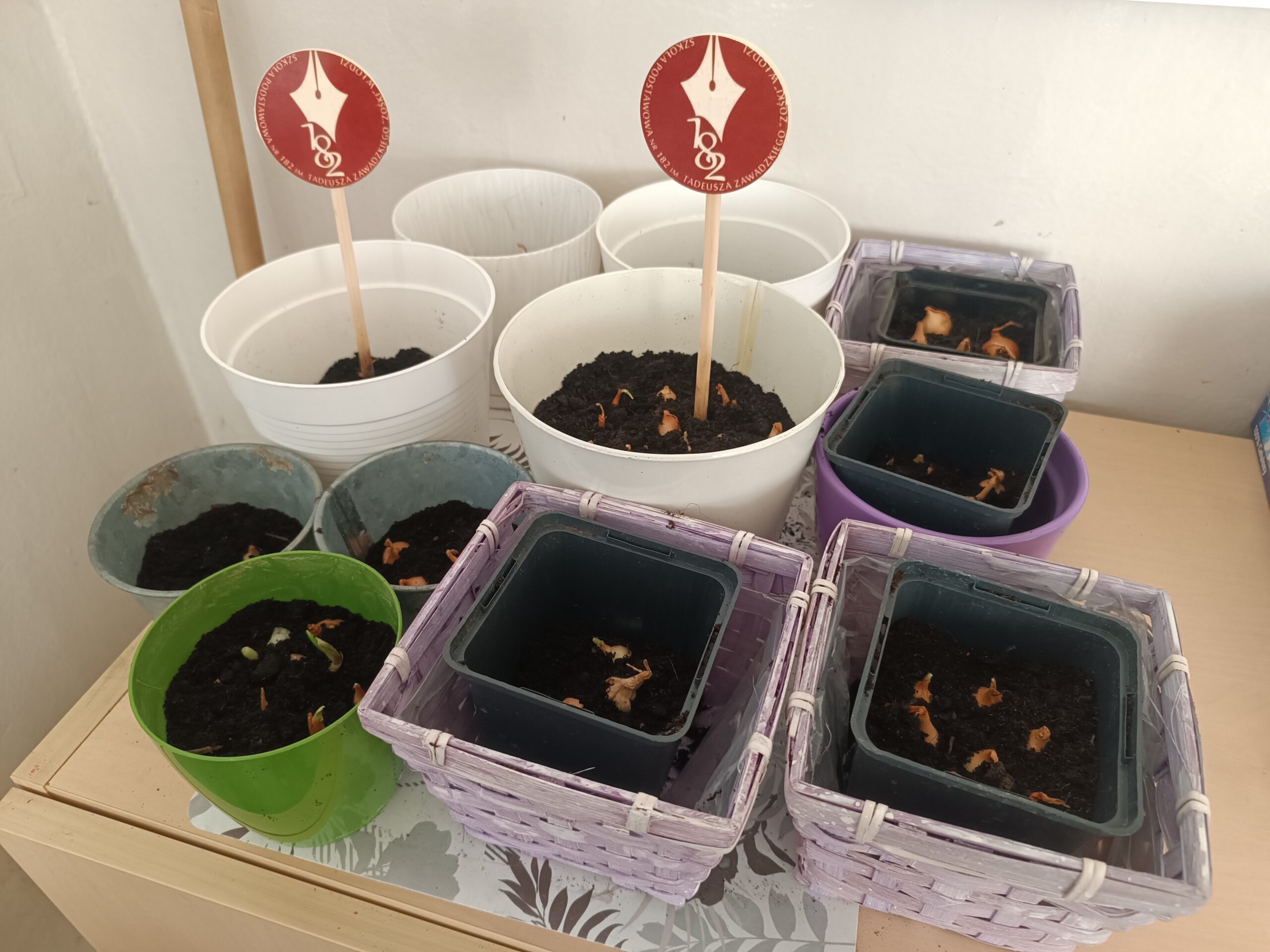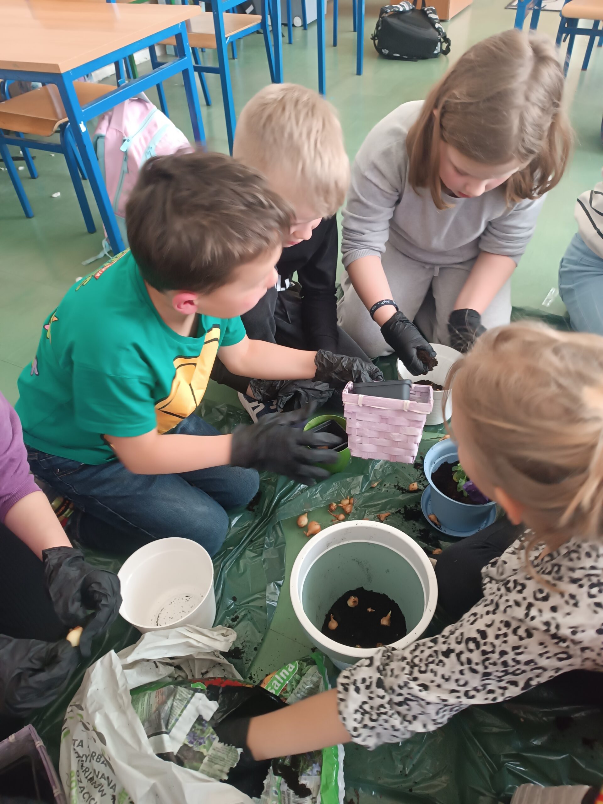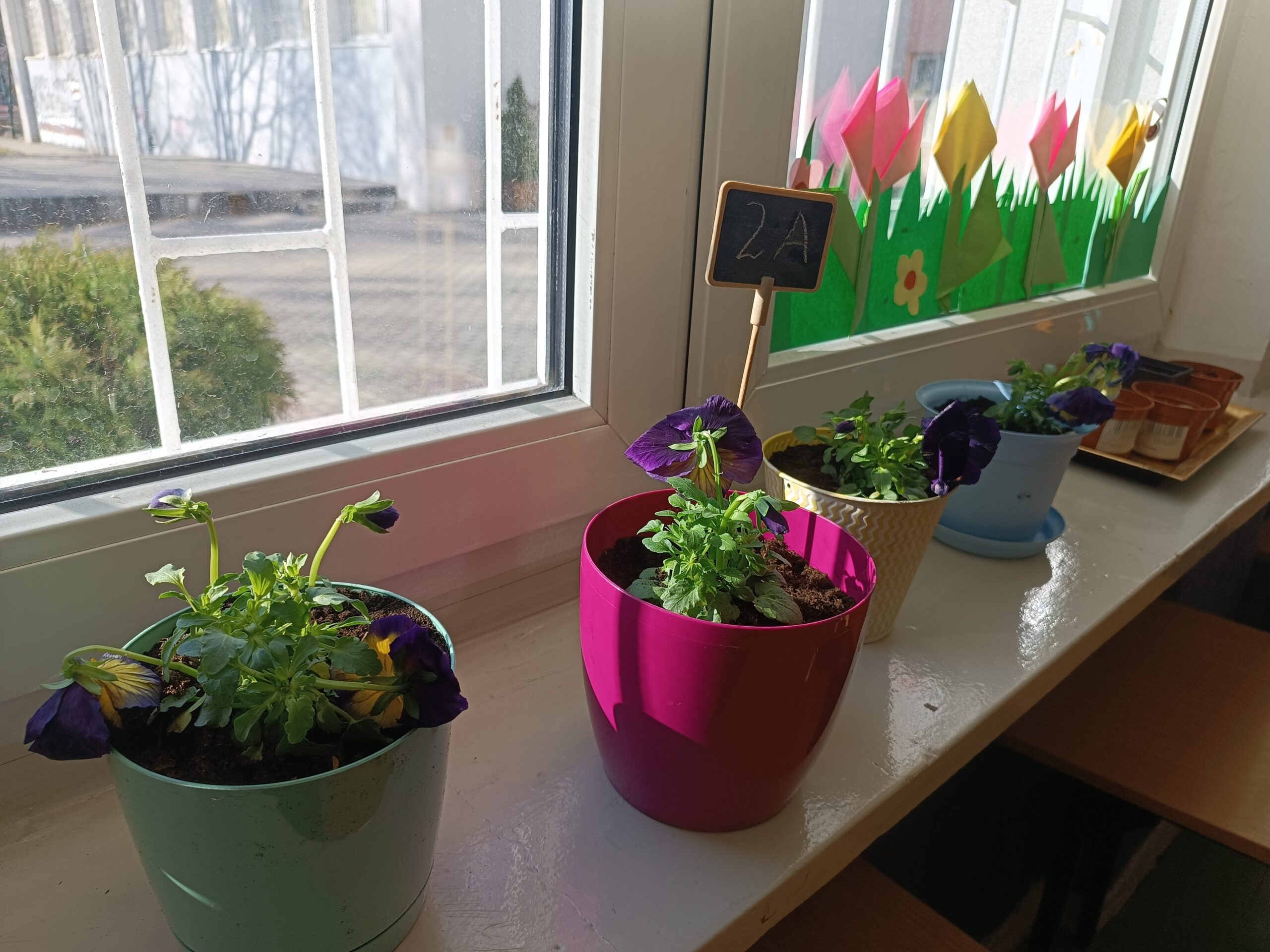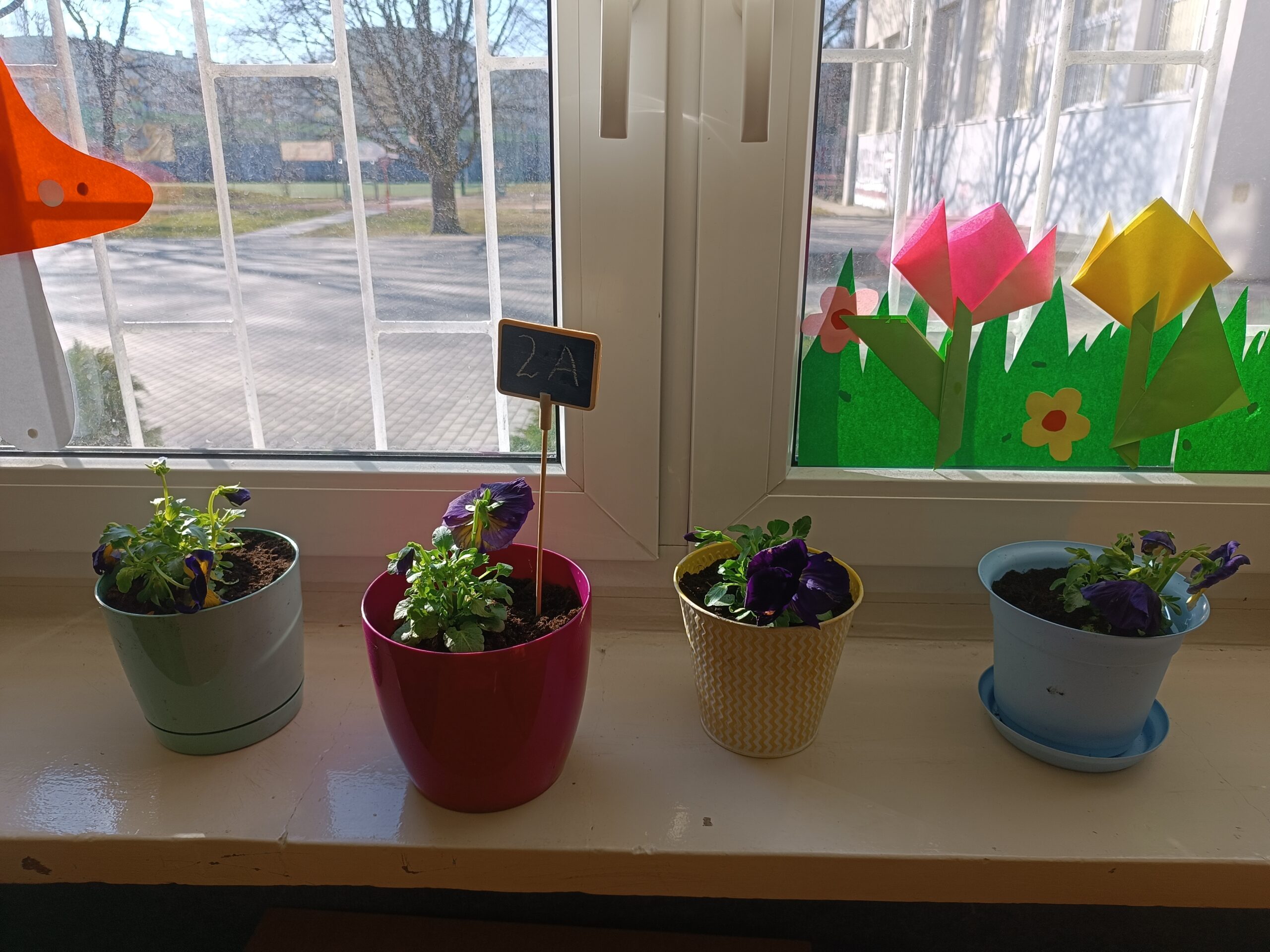 Klasa 2a rozpoczęła przygotowania do nadejścia wiosny. Aby przywołać wiosnę w sali rozpoczęły się porządki i małe zmiany. Uczniowie przez kilka dni przynosili do klasy kolorowe doniczki. Zakupione zostały fiołki, cebulki oraz ziemia. Cała klasa brała aktywny udział w tworzeniu klasowego ogródka i kącika zieleni. Przygotowane zostały stanowiska i zabezpieczona została pracownia. Dzieci w grupach dzieliły się zadaniami, a po pracy wspólnie sprzątały.
