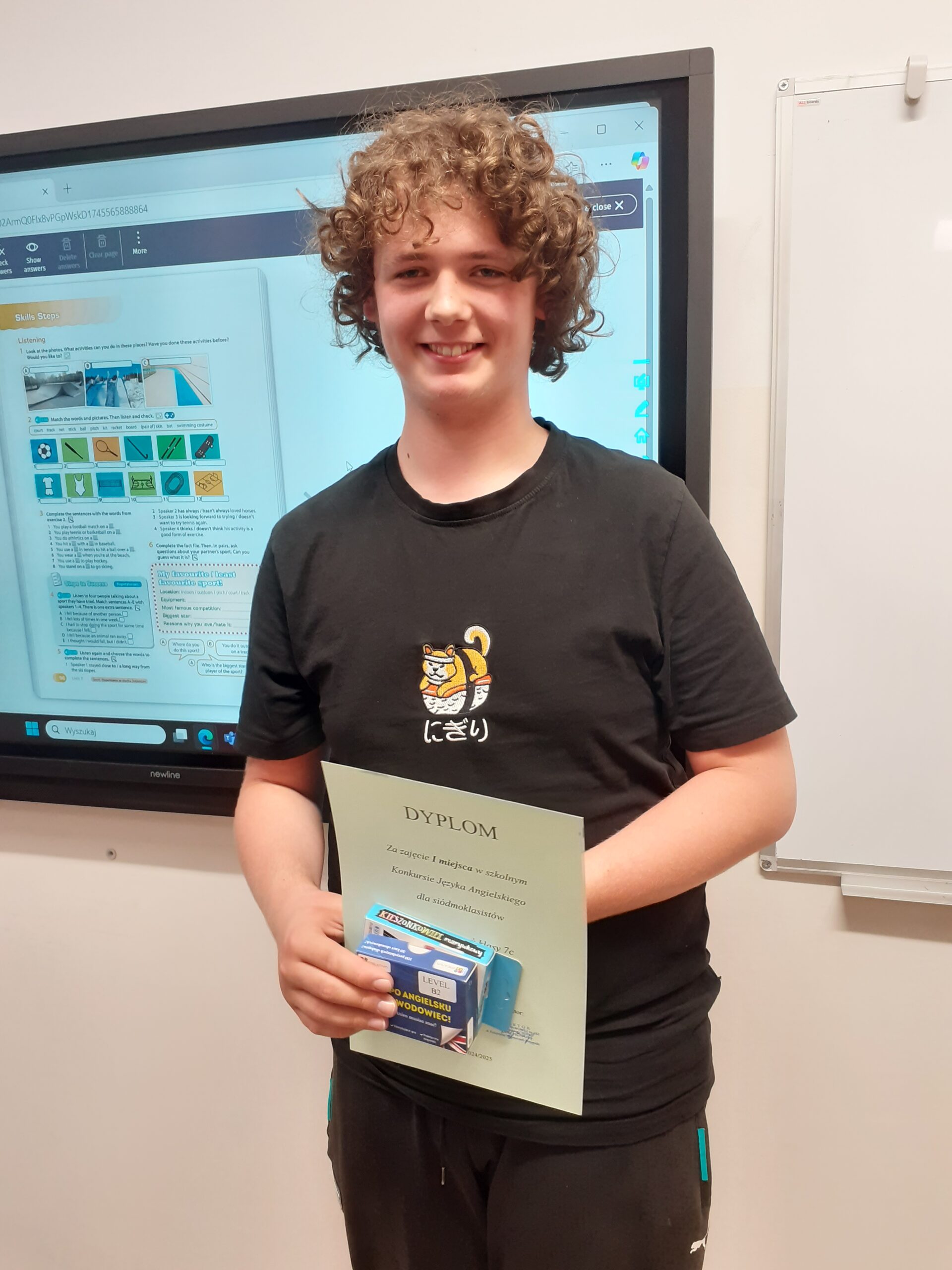 W kwietniu uczniowie klas siódmych wzięli udział w szkolnym konkursie języka angielskiego, przeprowadzonym przez panią Magdalenę Szymczak. Konkurs składał się z trzech zadań, jednego zamkniętego, będącego testem wyboru spośród czterech opcji odpowiedzi oraz dwóch zadań otwartych. Jedno zadanie sprawdzało umiejętność uzupełnienia luki w zdaniu wyrazem w języku angielskim. Natomiast ostatnie zadanie polegało na wykazaniu się umiejętnością transformacji zdań. Wszystkie zadania sprawdzały znajomość zagadnień leksykalnych i gramatycznych. Uczniowie świetnie poradzili sobie z zadaniami konkursowymi, a laureatami konkursu zostali: