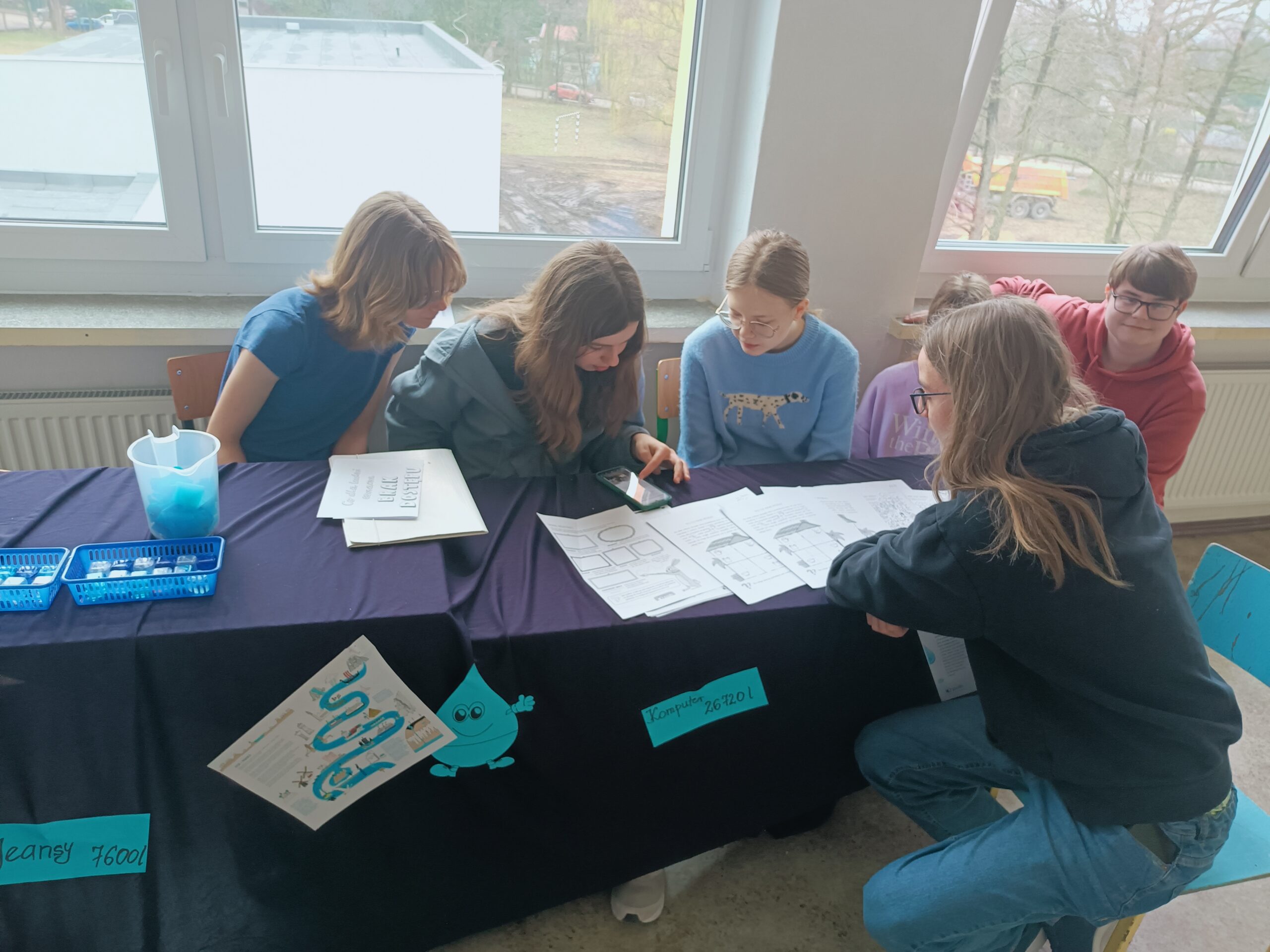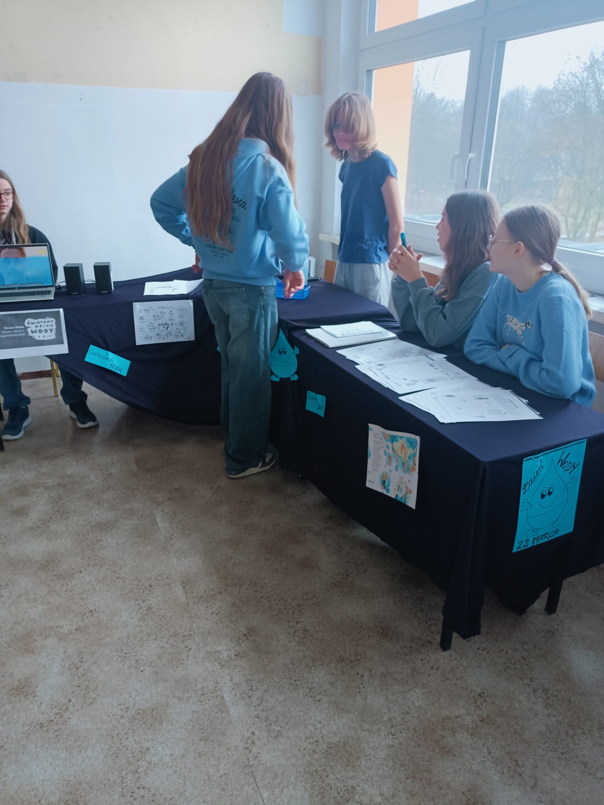 W dniu 24 marca, klasa 8a zorganizowała stoisko, gdzie uczniowie podczas długich przerw mieli okazję obejrzeć filmy. Mogli również wziąć udział w quizach i rozwiązywać zadania związane z wodą. To była doskonała okazja do poszerzenia swojej wiedzy na temat wody, jej znaczenia i zagrożeń związanych z jej brakiem. Stoisko oczywiście cieszyło się dużym zainteresowaniem wśród uczniów.