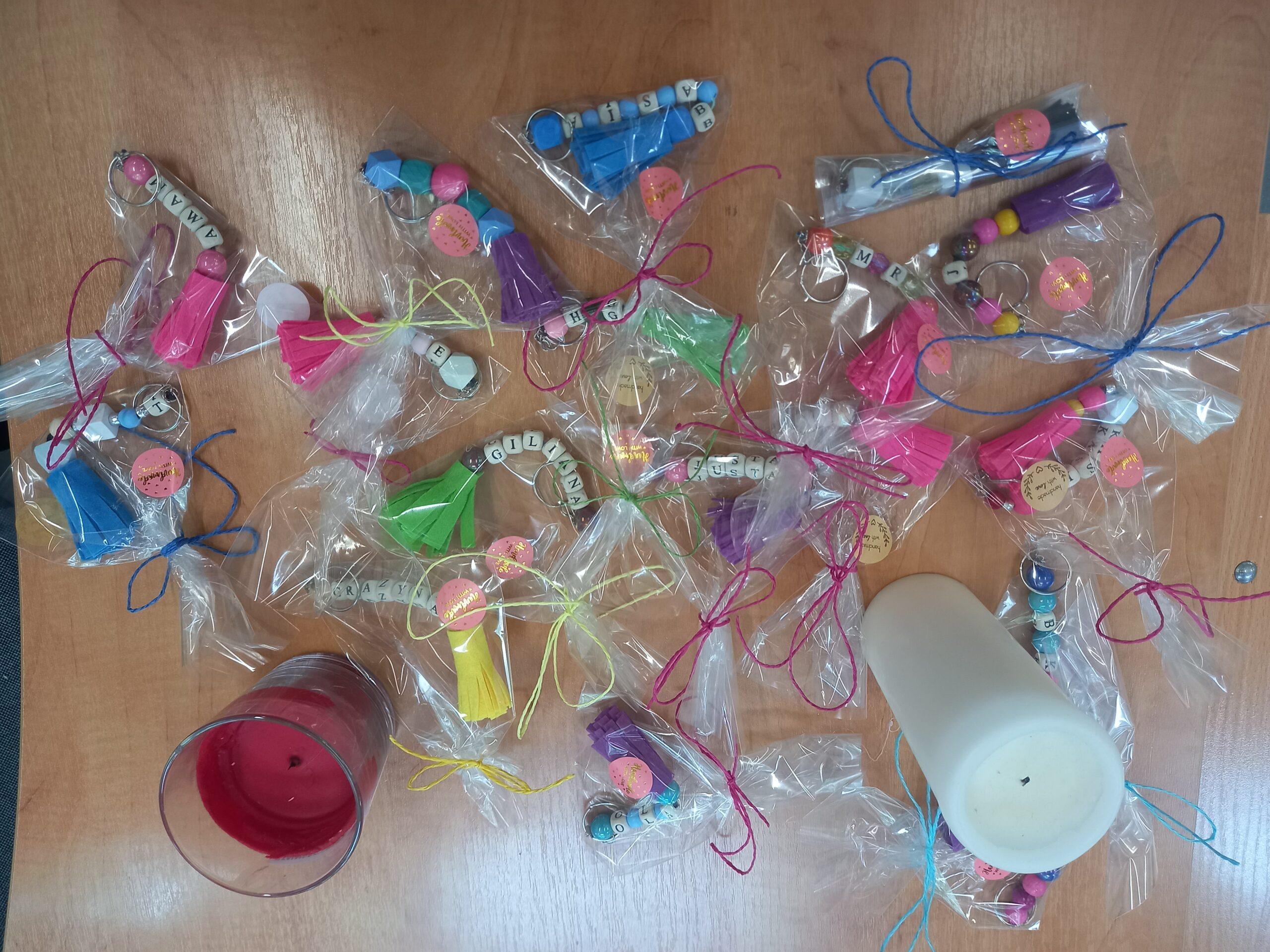 Kiedy projekt był gotowy trzeba było nawlec na sznurek kółko do kluczy i precyzyjnie przełożyć resztę wybranych elementów. Co więcej uczniowie musieli pilnować by nie pomylić kolejności nawlekanych elementów. Na koniec każdy twórca kawałek filcu w wybranym kolorze przycinał na drobne paski i mocował za pomocą kleju na gorąco. Tak przygotowane breloki umieściliśmy w torebkach, które wykończyliśmy kolorową kokardą i naklejką z napisem Hand Made. Podarunki wyglądały pięknie zatem już niedługo będą zdobić klucze, torebki, telefony itp. niejednej mamy.