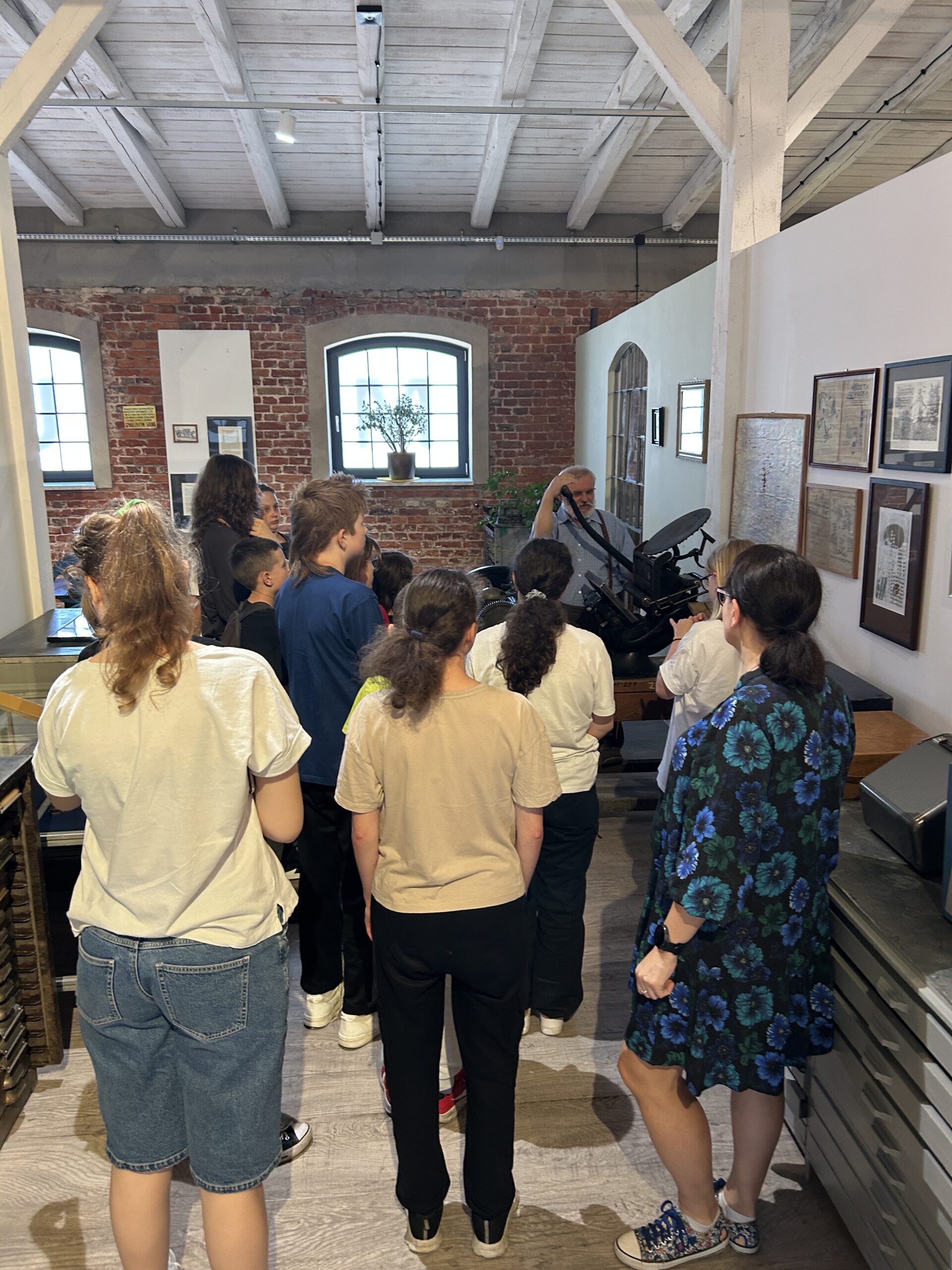 W drugiej części zajęć Regionalni obejrzeli zabytkowe maszyny związane z drukarstwem i introligatorstwem. W muzeum można oglądać dużą kolekcję XIX i XX wiecznych takich urządzeń. Wśród eksponatów są także gilotyny do papieru, czcionki metalowe i drewniane z regałem zecerskim. Można zobaczyć książki pochodzące nawet z XVI wieku. Niektórzy dzięki temu zrozumieli, co znaczy powiedzenie: „Przeczytać książkę od deski do deski”.