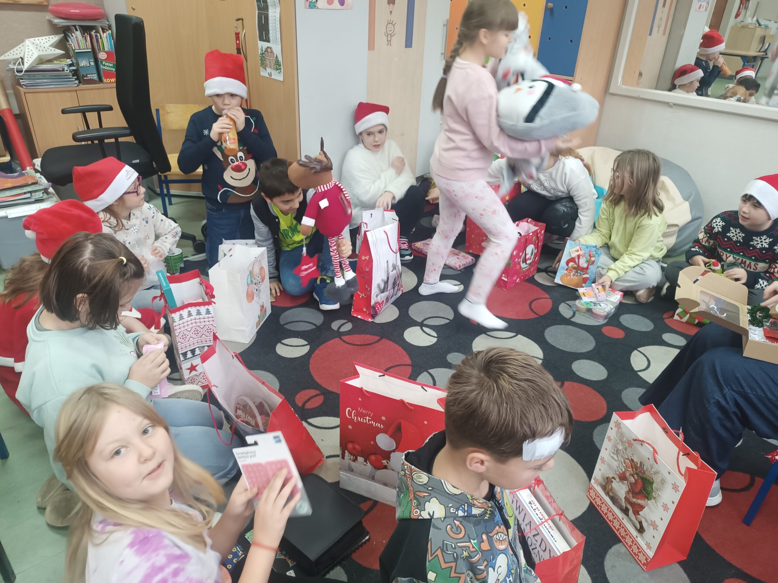 Później przyszła pora na rozdanie prezentów — dzieci z dużą ekscytacją otwierały swoje paczki i od razu sprawdzały, co się w nich kryje. Na koniec bawiliśmy się wspólnie nowymi zabawkami i miło spędziliśmy czas w swoim towarzystwie.